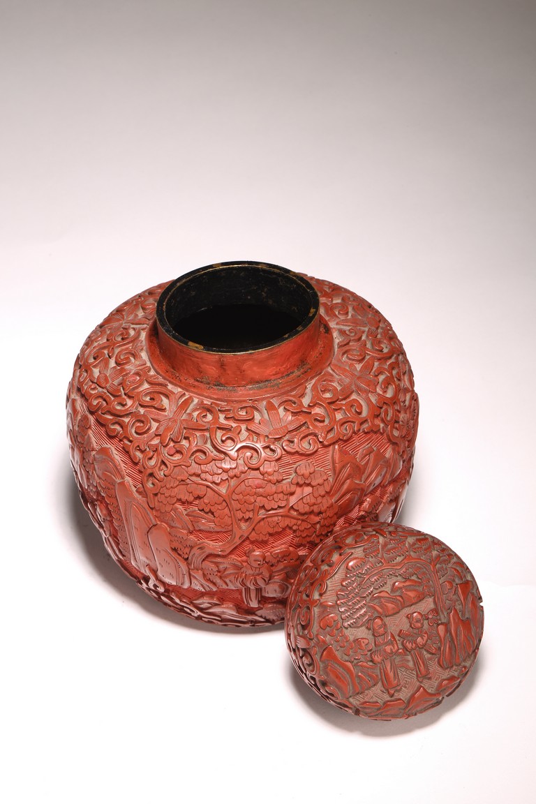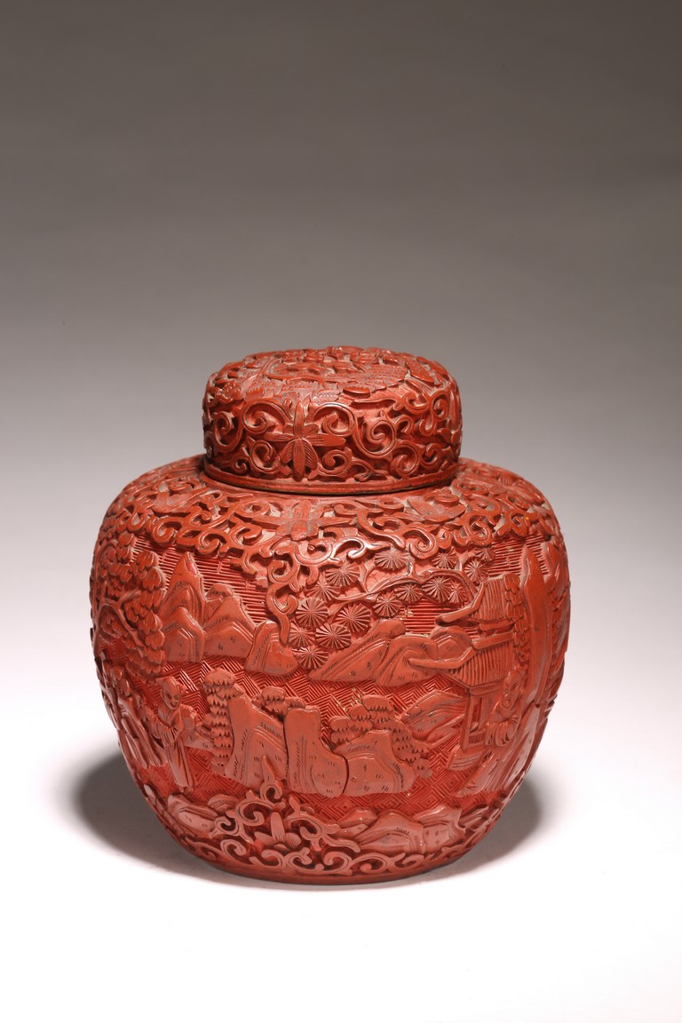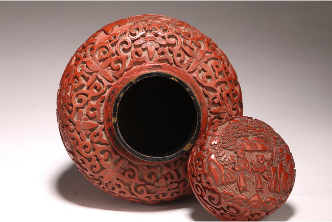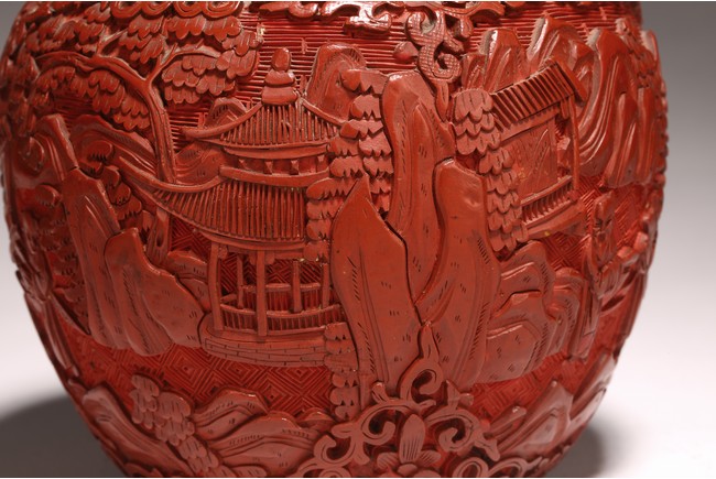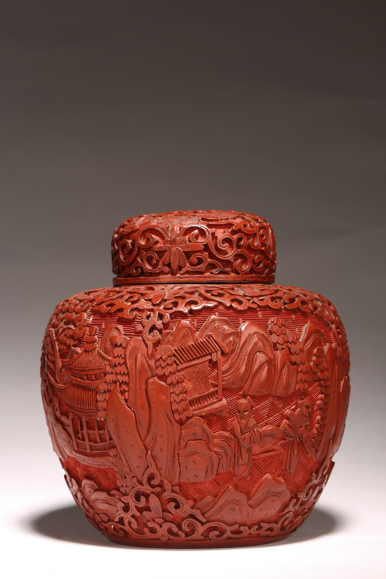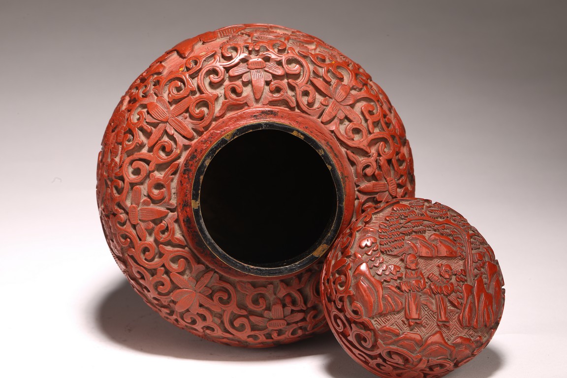 直口, 短頸, 帶蓋, 鼓圓腹, 圈足。飾以繁縟華麗的剔紅工藝, 庭院深深, 遠山近水,嬰 兒在庭院間戲玩,蒼 松遠山刻畫細致。整 器佈局緊密,紋 飾繁複精細,莊重典雅, 雕工細膩到位, 人物刻畫生動傳。