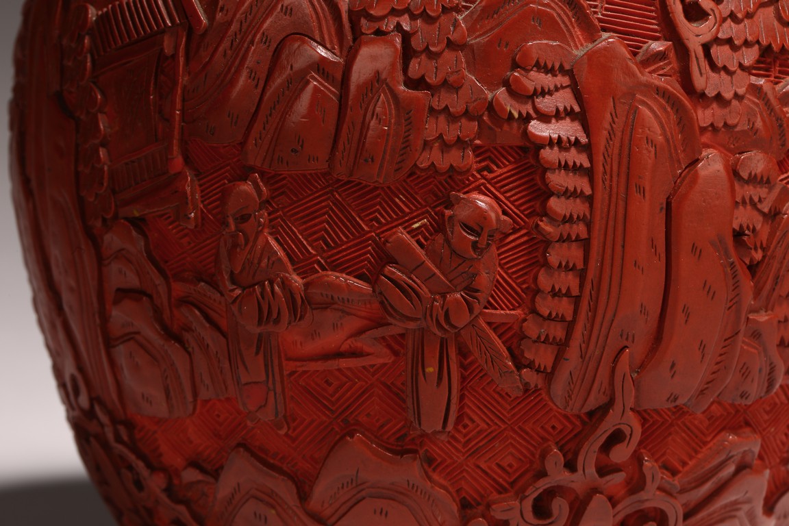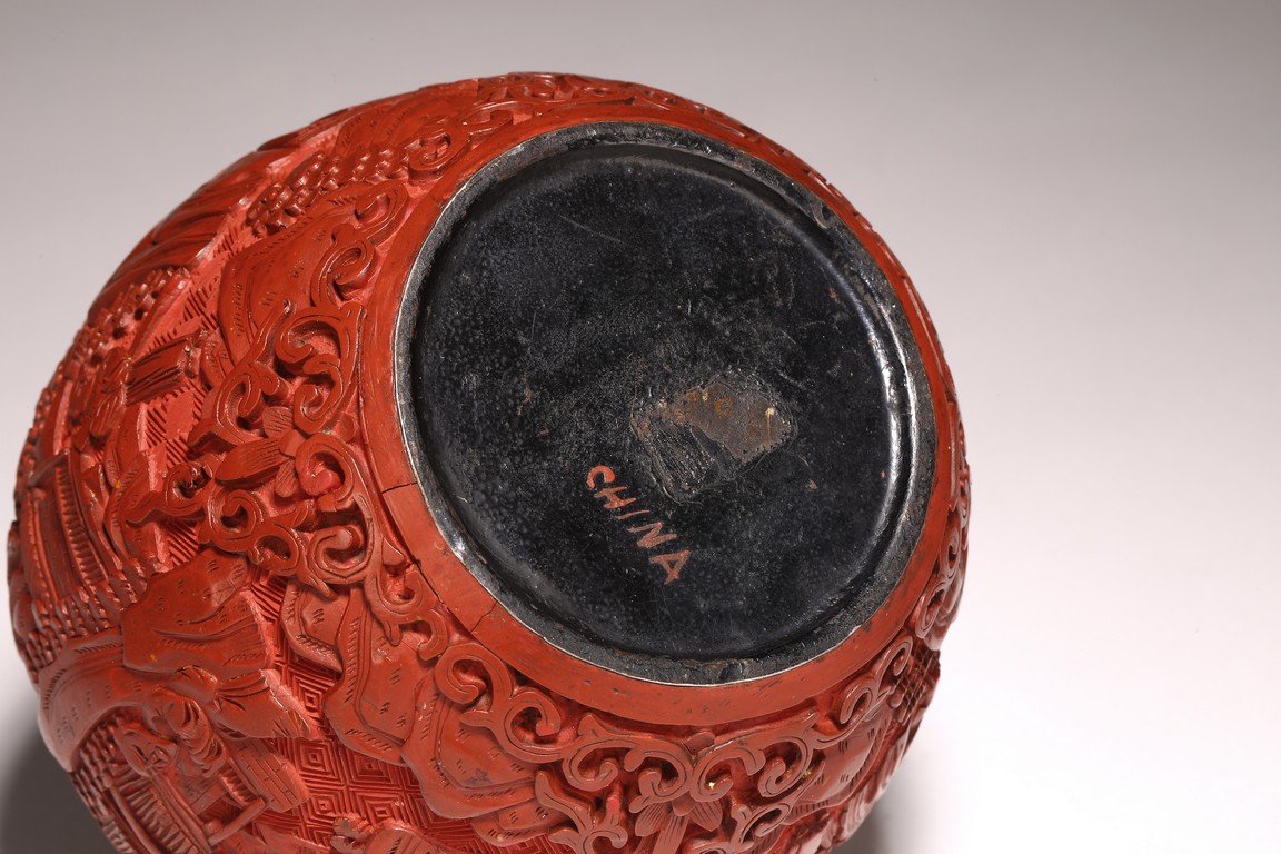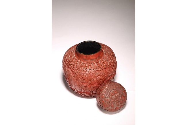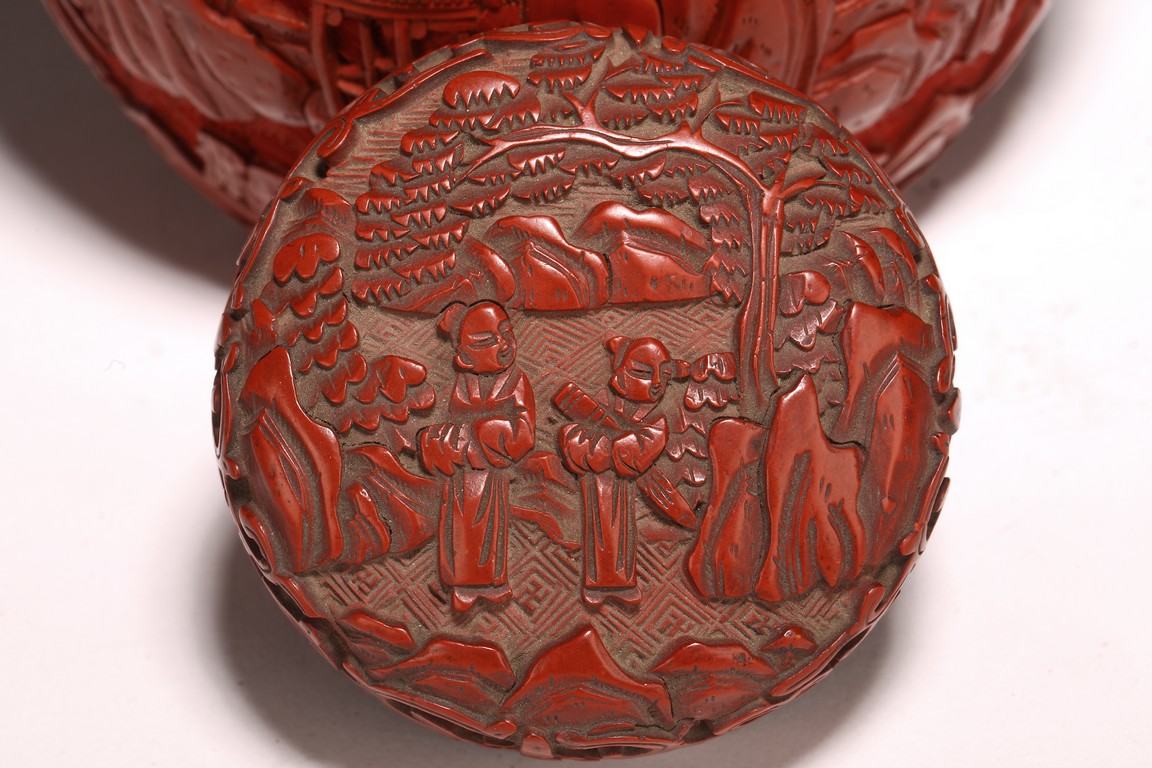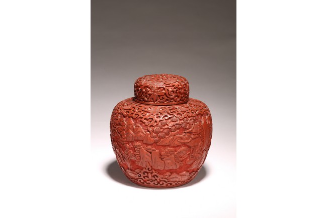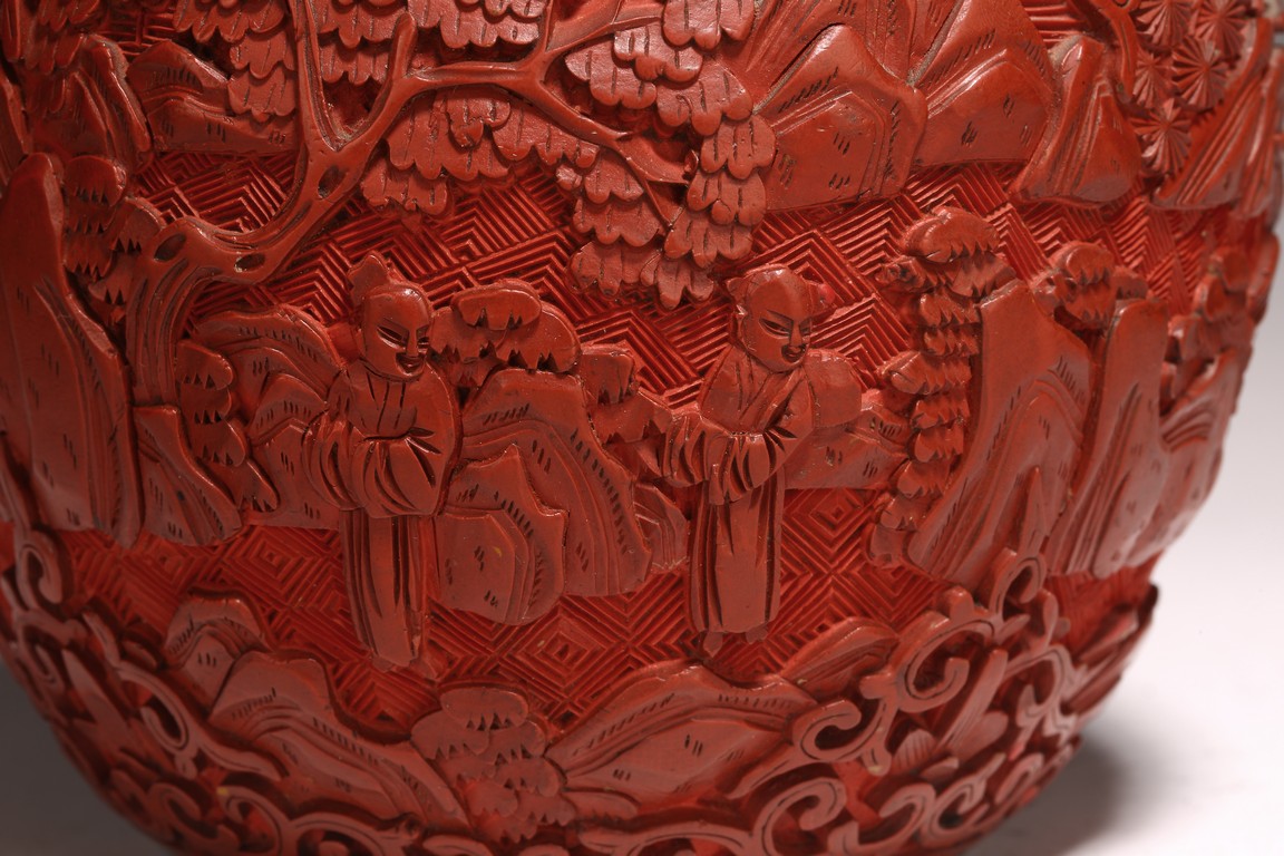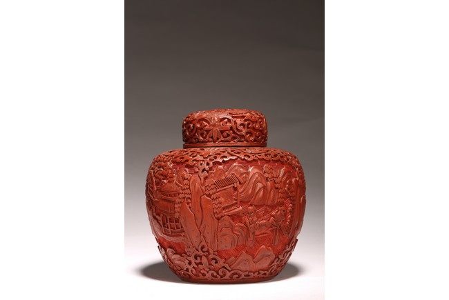 直口, 短頸, 帶蓋, 鼓圓腹, 圈足。飾以繁縟華麗的剔紅工藝, 庭院深深, 遠山近水,嬰 兒在庭院間戲玩,蒼 松遠山刻畫細致。整 器佈局緊密,紋 飾繁複精細,莊重典雅, 雕工細膩到位, 人物刻畫生動傳。