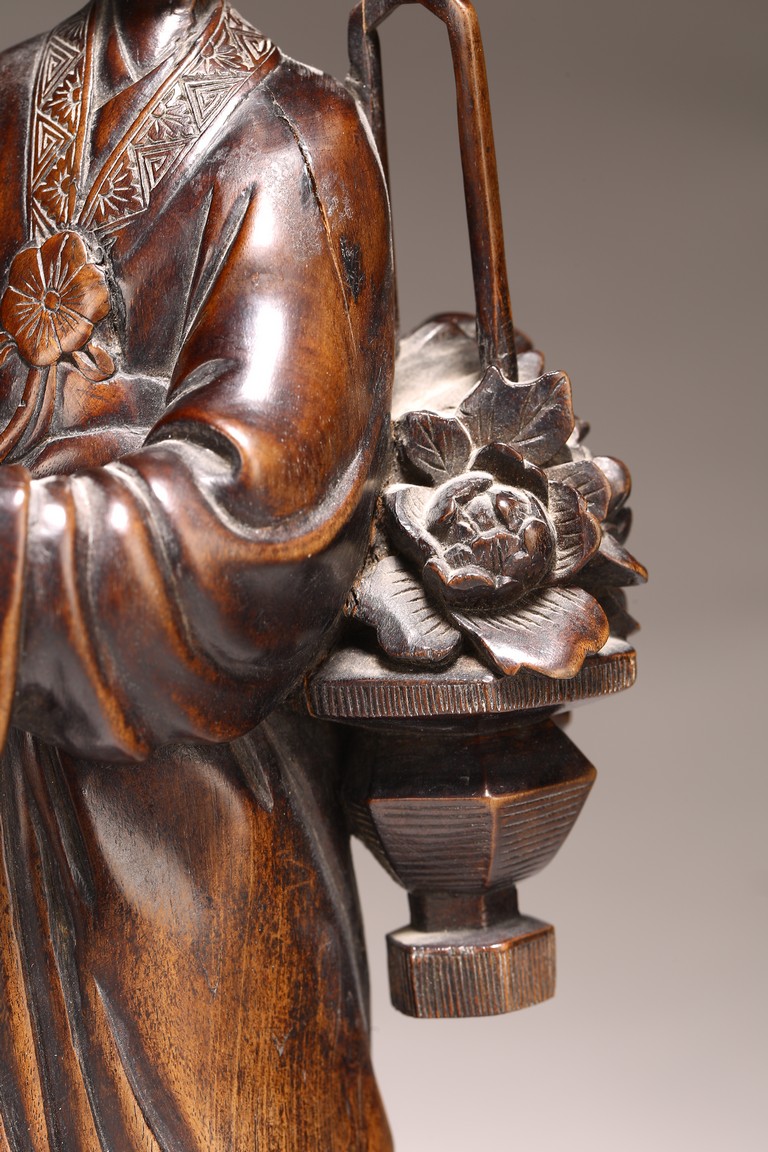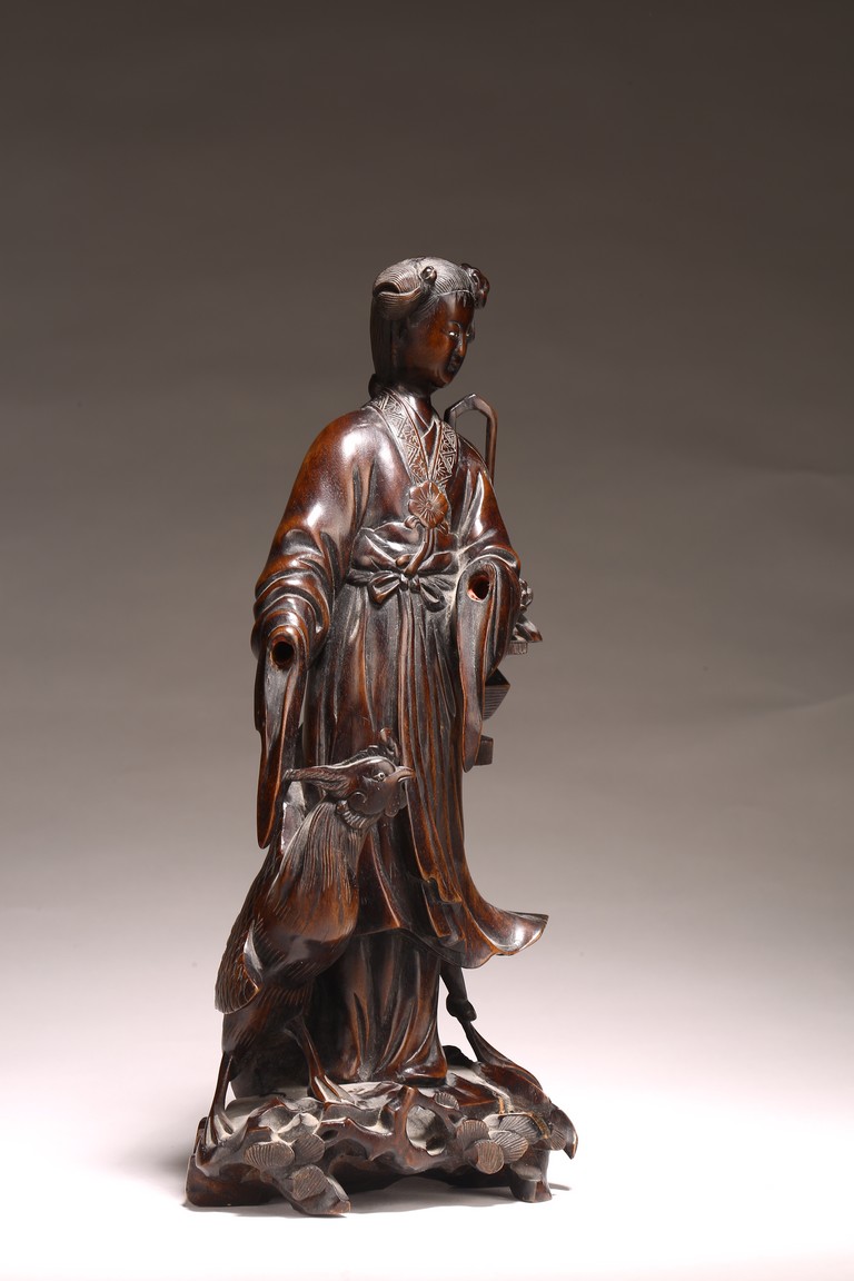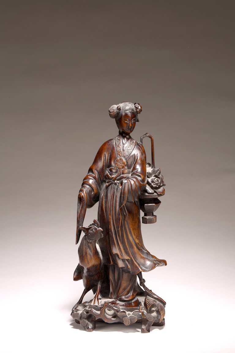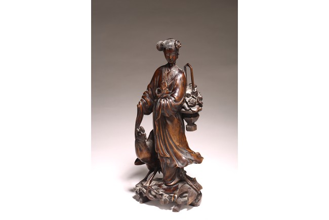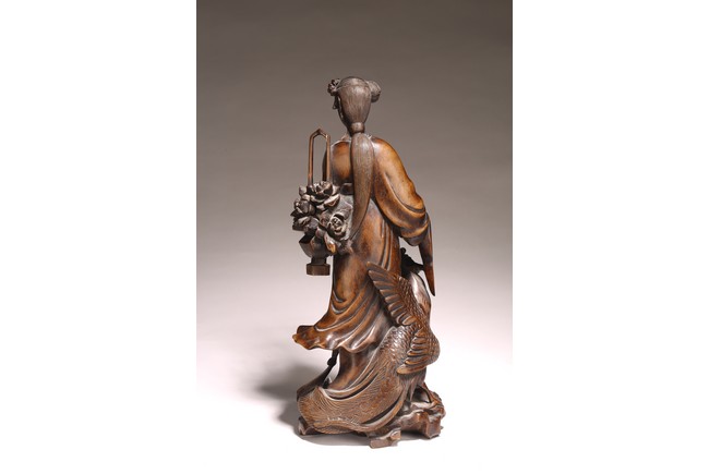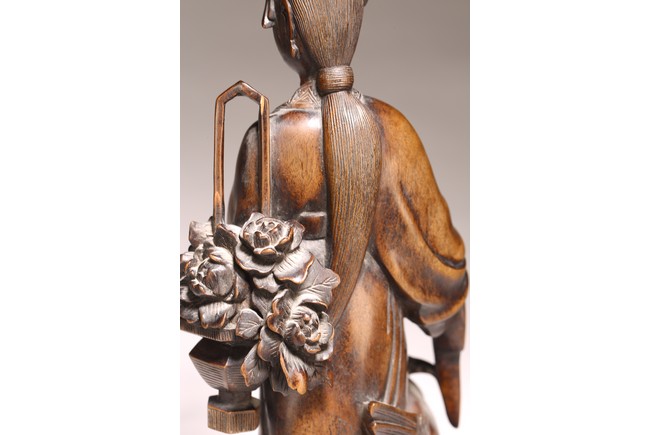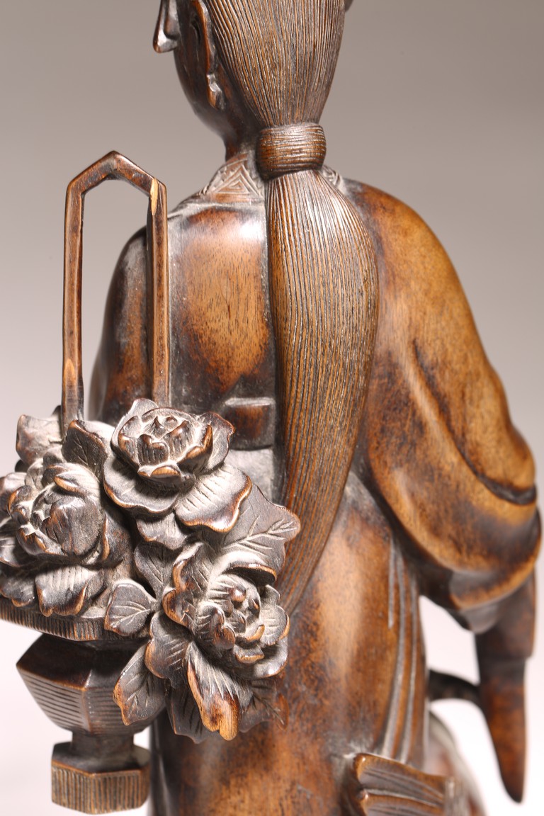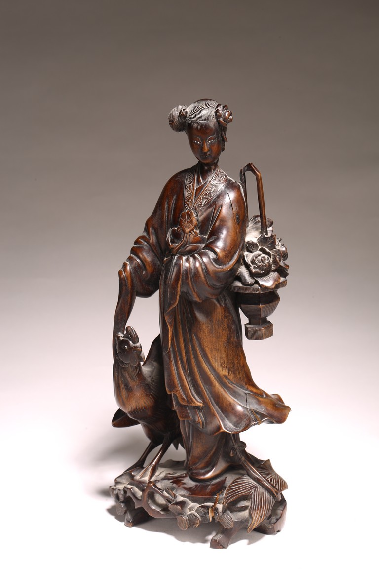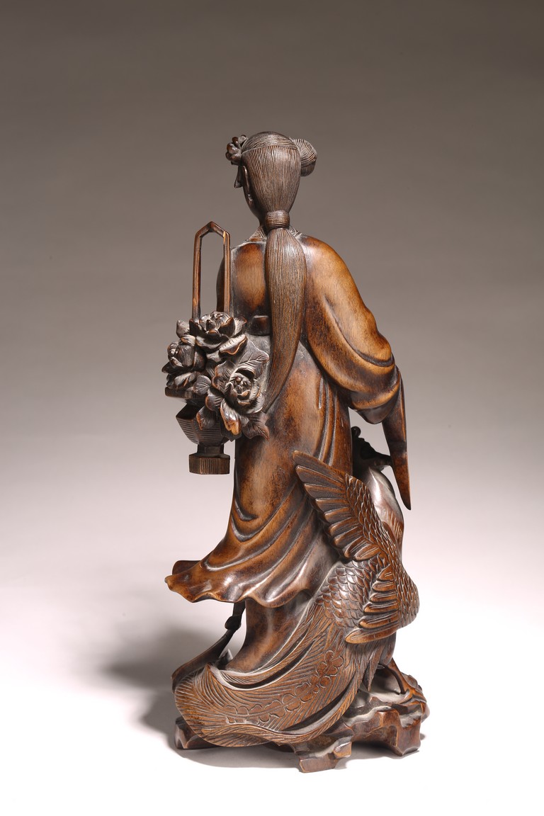 Late Qing Dynasty period. Standing with robes and sashes fluttering around the body, carrying a flower basket on the back, accompanied by a phoenix on her side.