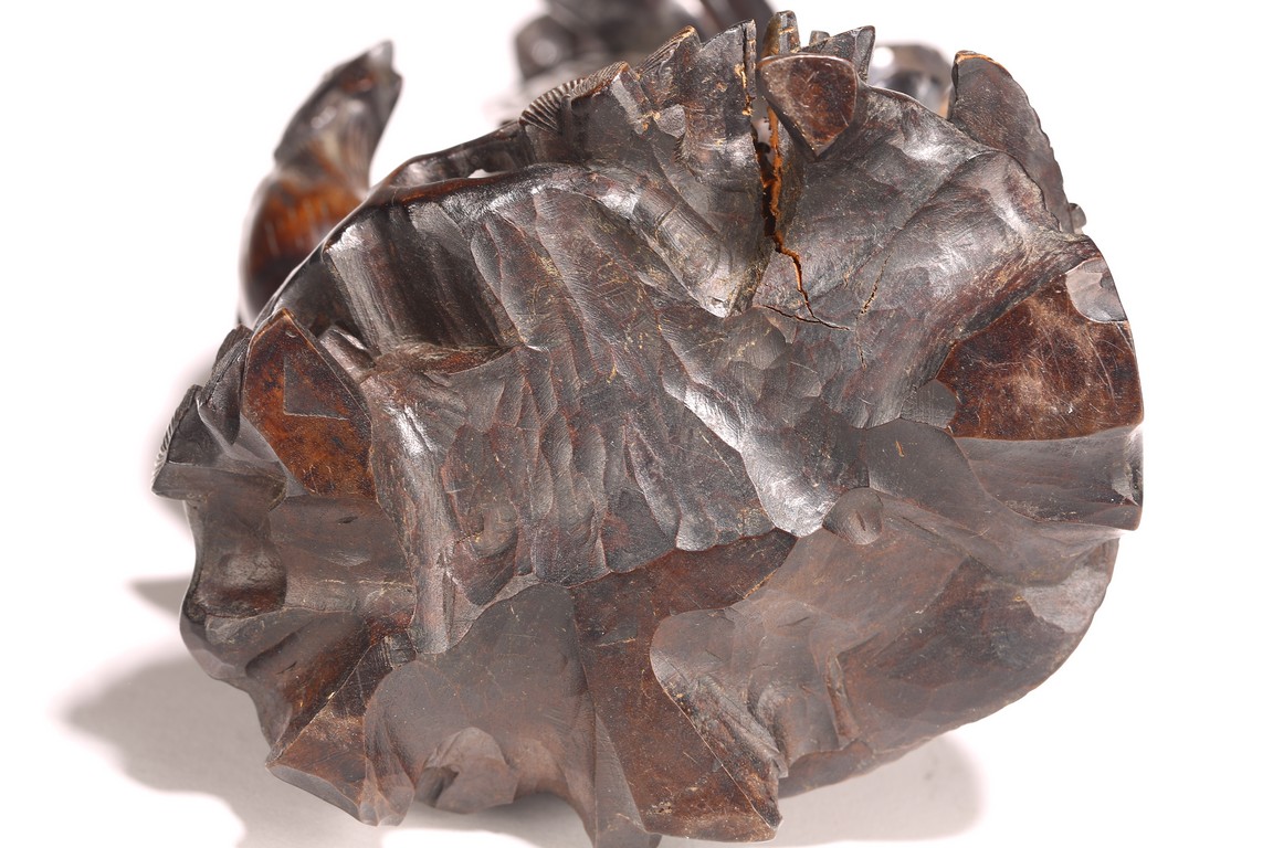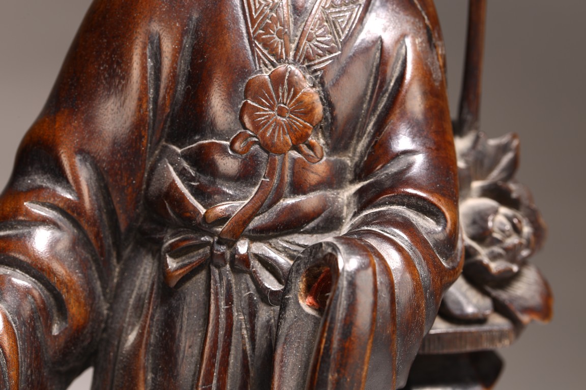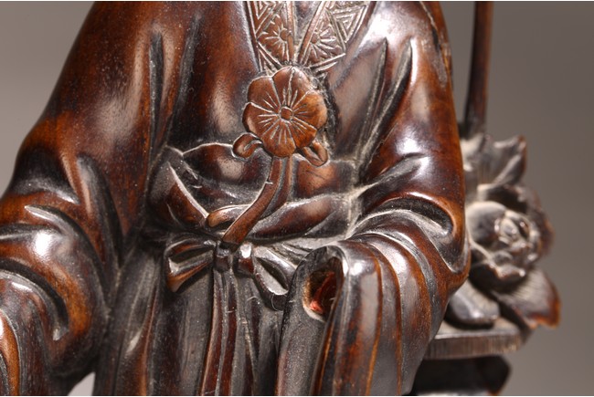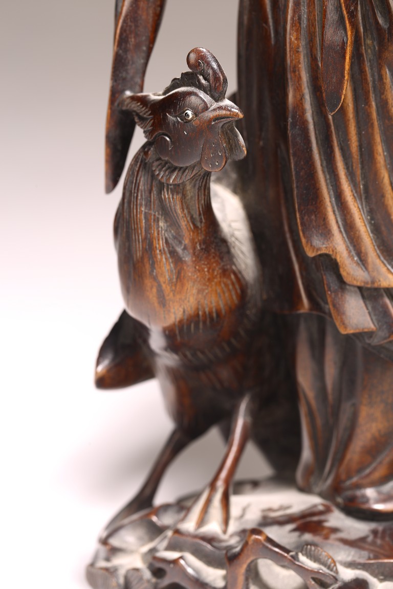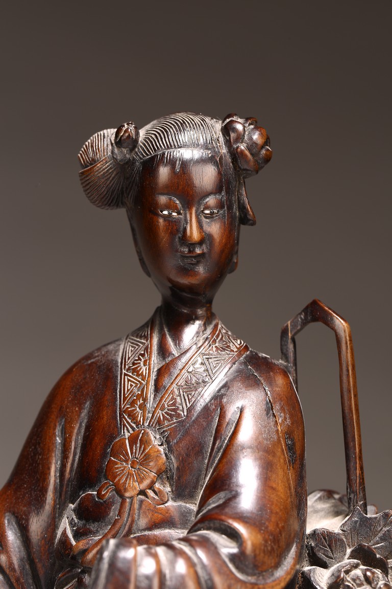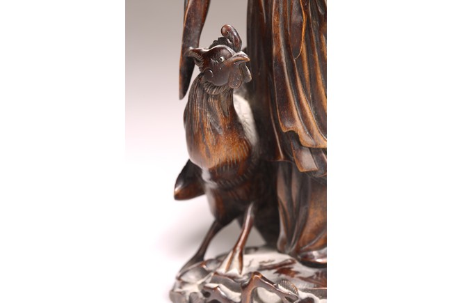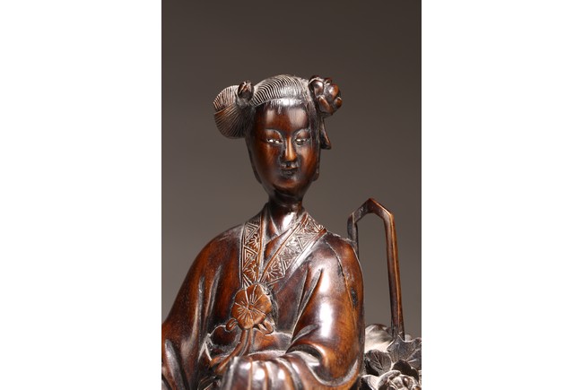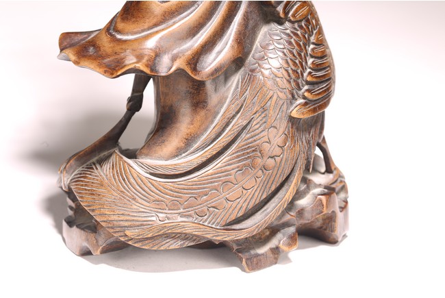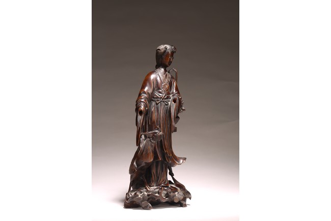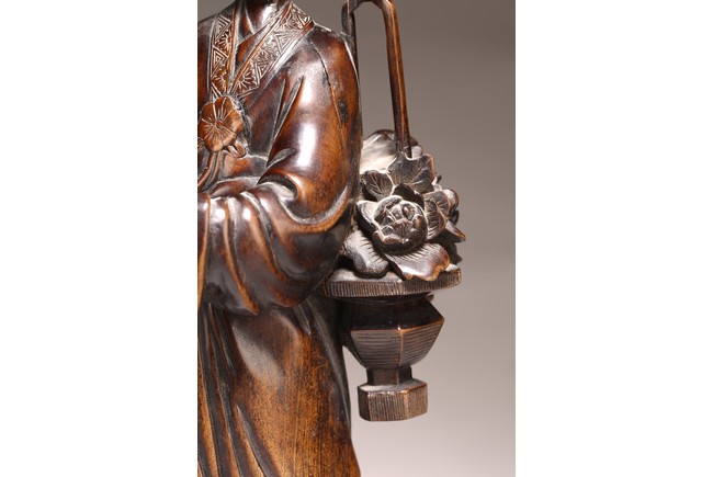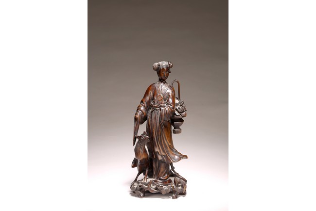 Late Qing Dynasty period. Standing with robes and sashes fluttering around the body, carrying a flower basket on the back, accompanied by a phoenix on her side.