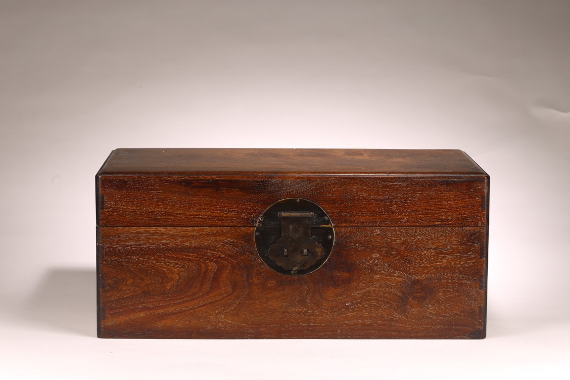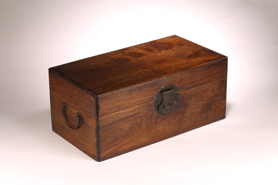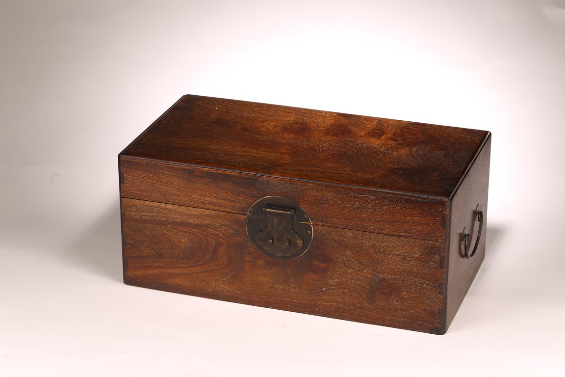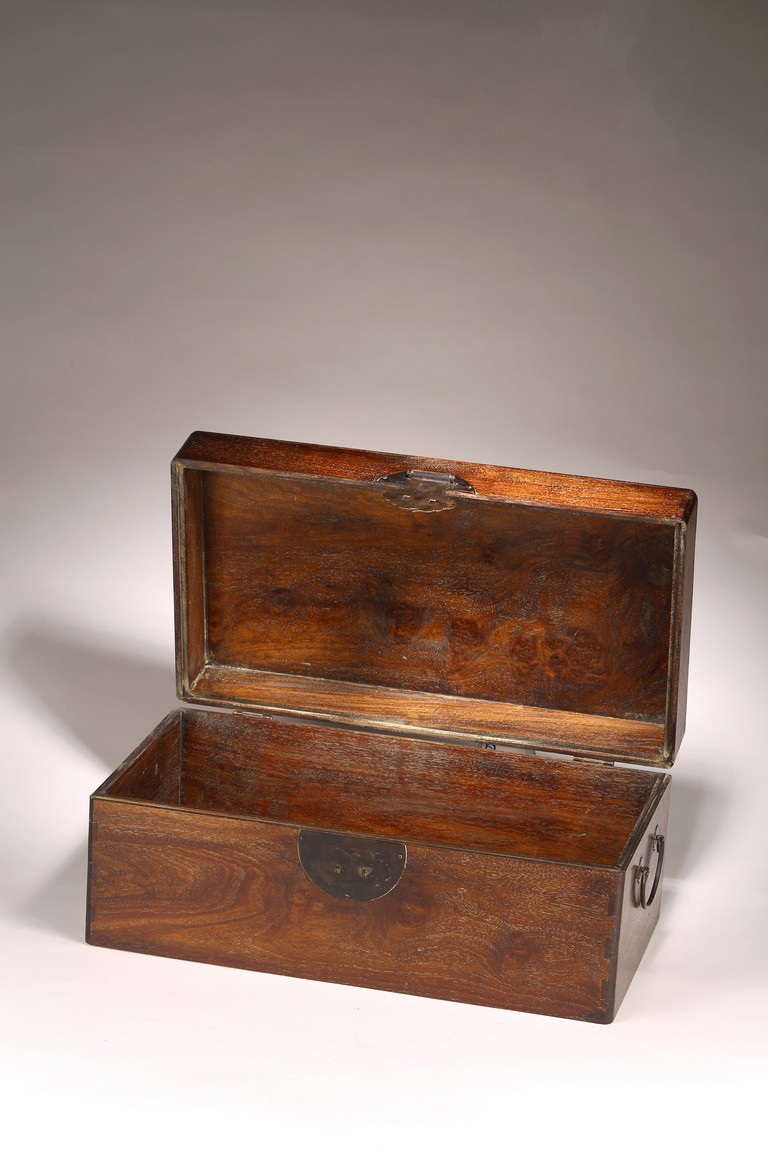 其形甚簡,四平式,木紋細致自然,色澤沈穆,包漿沈著。體爲長方形, 周身無飾,簡約幹練,兩側有卷勾拉手,方便搬移,整器典雅端莊,做工規整。