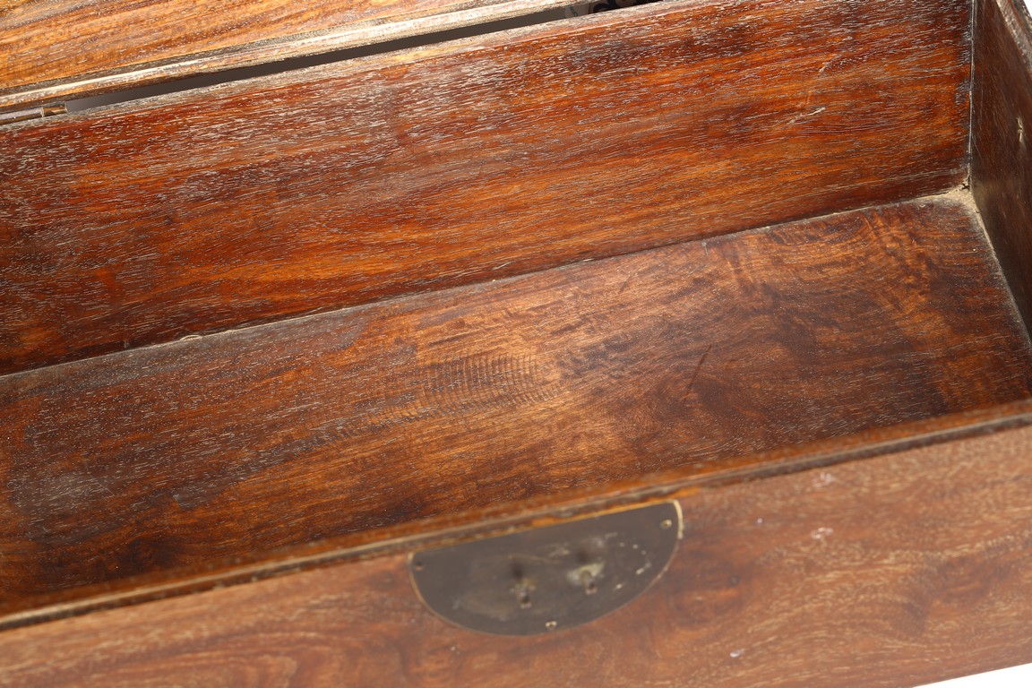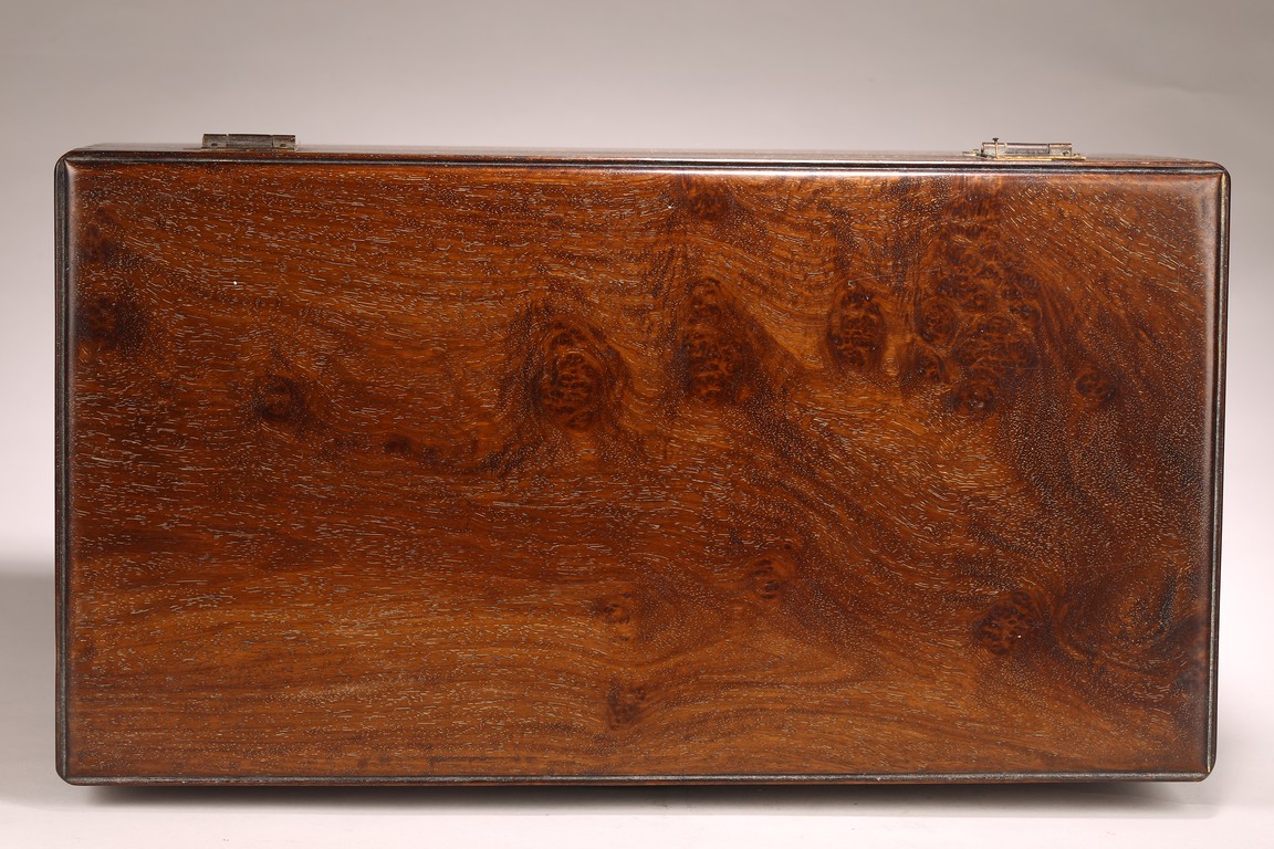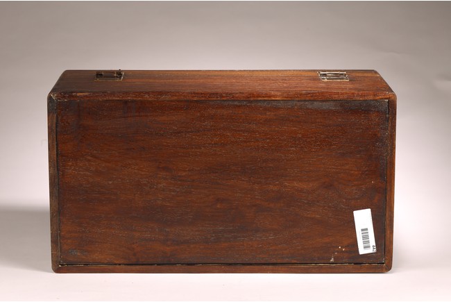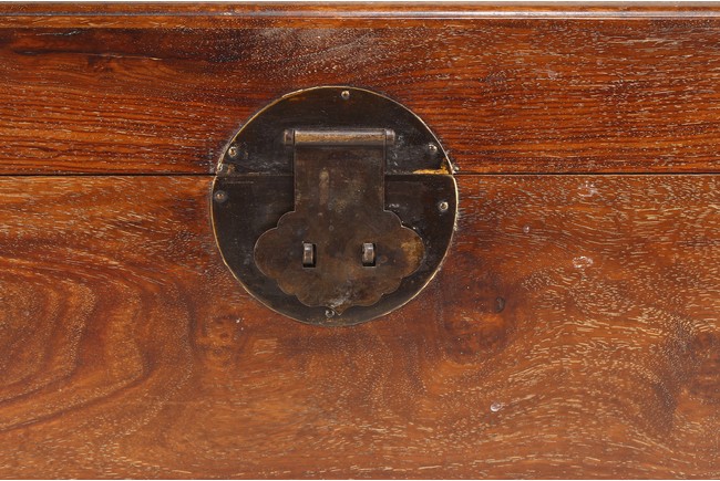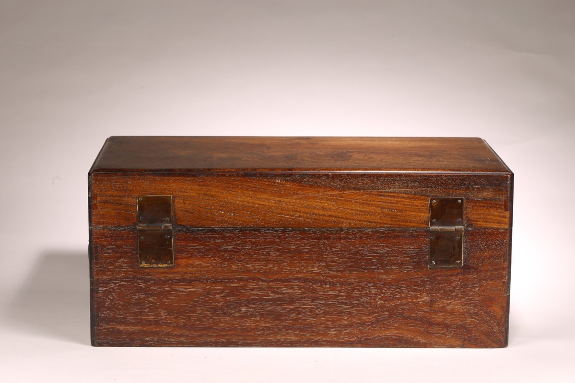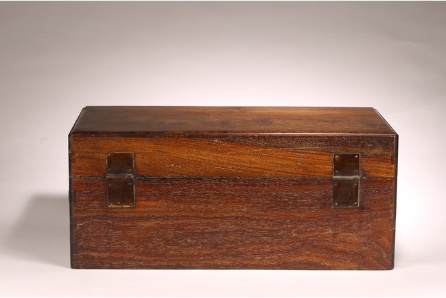 其形甚簡,四平式,木紋細致自然,色澤沈穆,包漿沈著。體爲長方形, 周身無飾,簡約幹練,兩側有卷勾拉手,方便搬移,整器典雅端莊,做工規整。