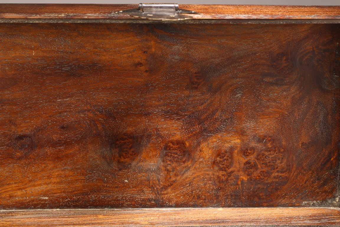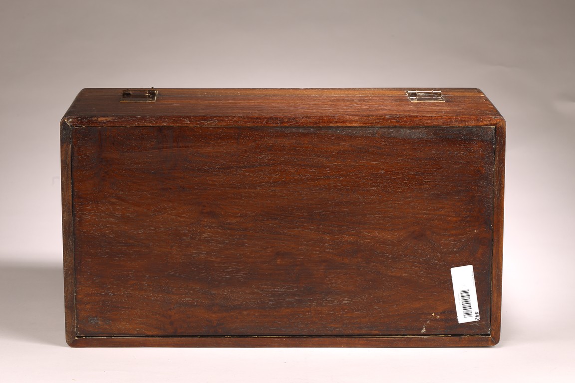 Qing Dynasty period. The rectangular case composed with panels with a hinged cover and finely beaded lip, repeated on the conforming lower section, the corners set with bronze mounts and with a circular lock plate and hinged ruyi hasp