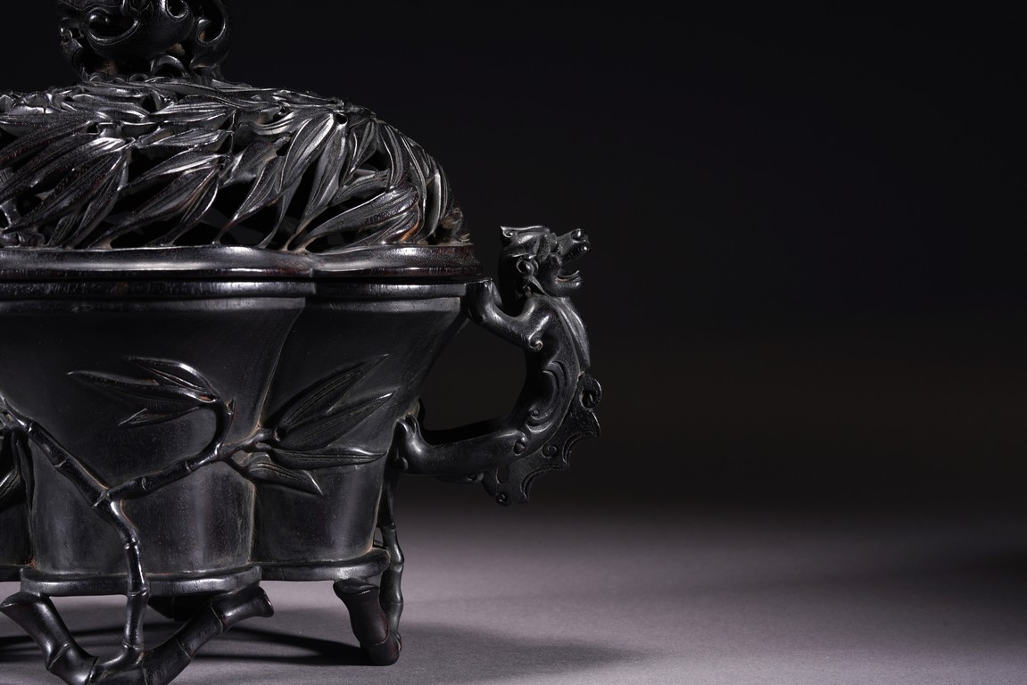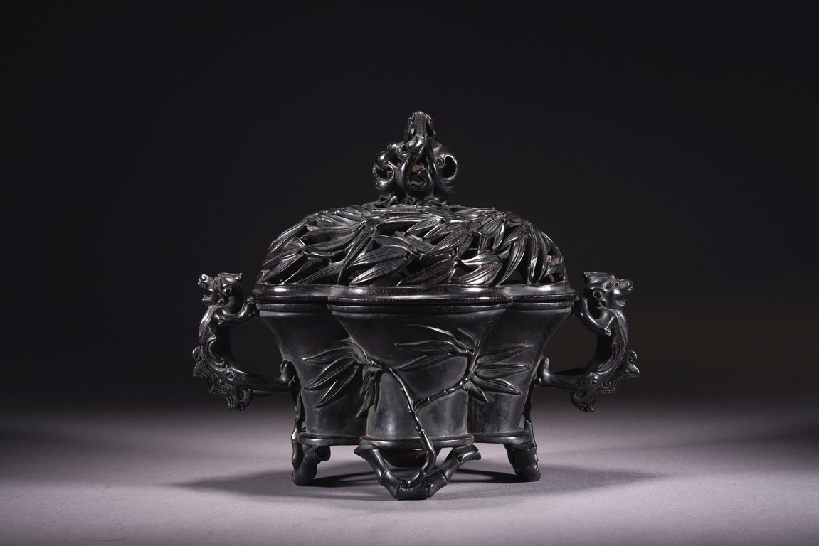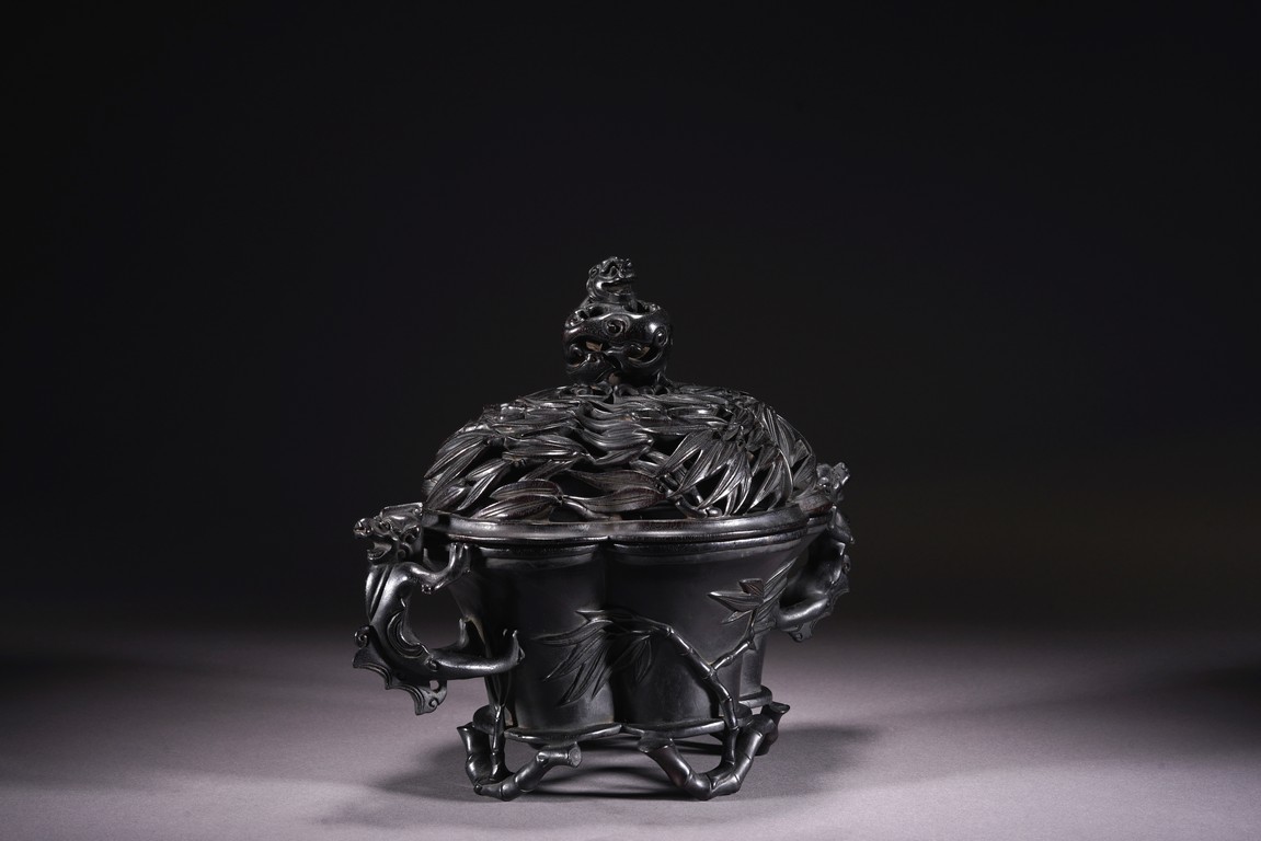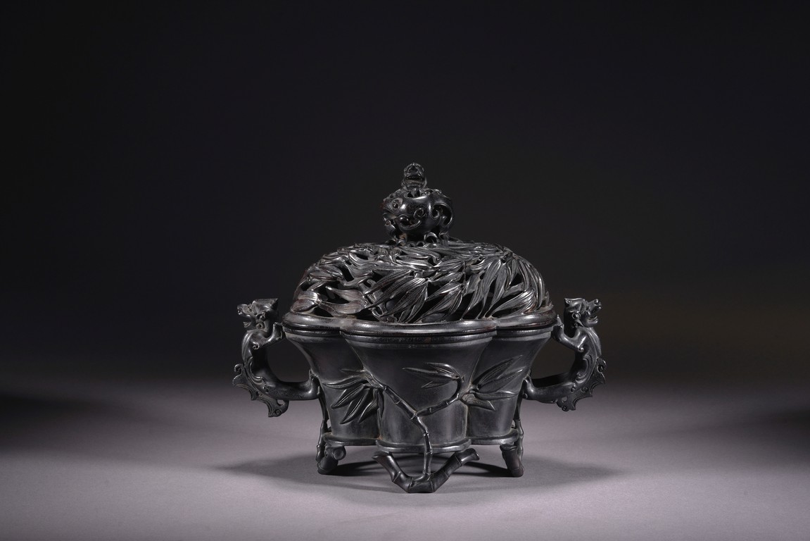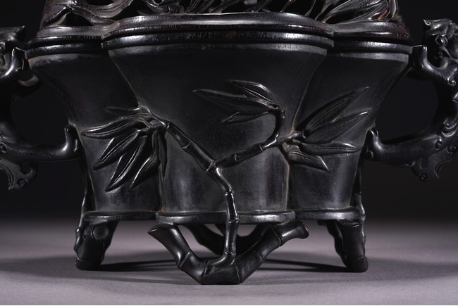 Supported on three feet three to resemble stylized trunks of bamboo, the body flanked by pair of mythical beasts, the cover carved and pierced in openwork to depict the bamboo leaves, surmounted by a coiled beast.