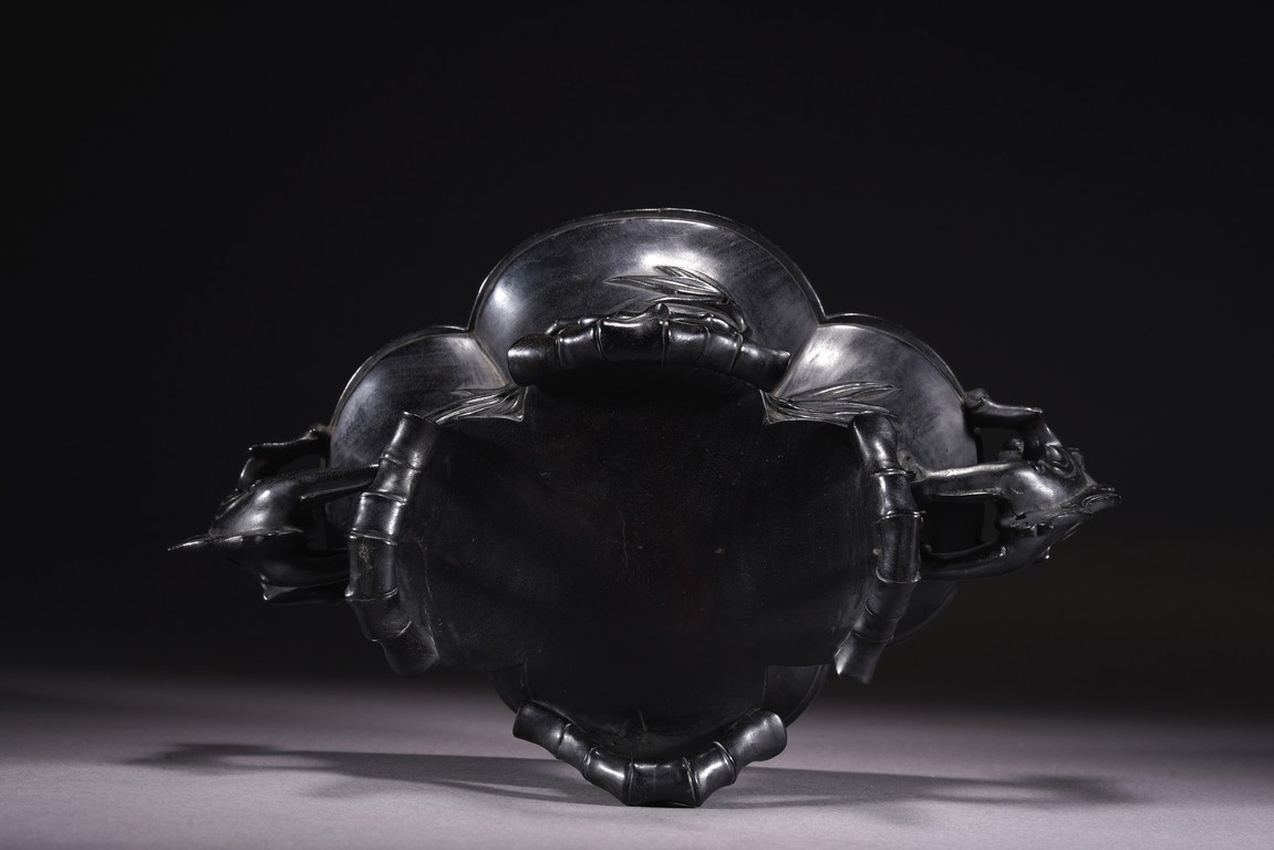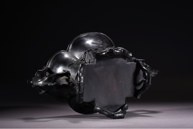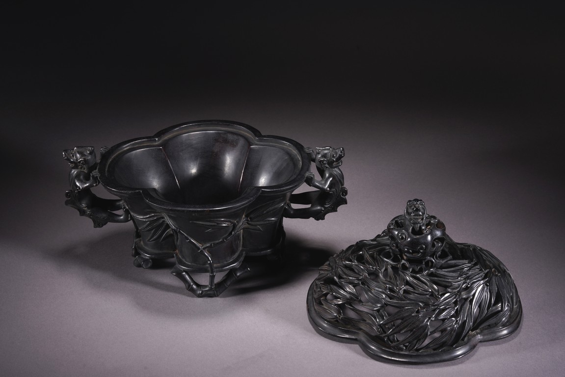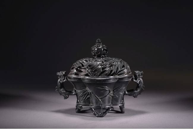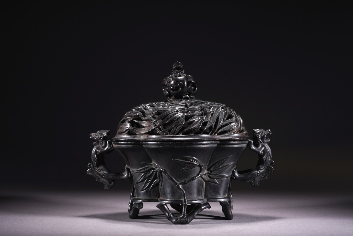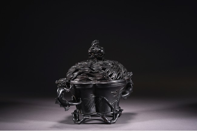 Supported on three feet three to resemble stylized trunks of bamboo, the body flanked by pair of mythical beasts, the cover carved and pierced in openwork to depict the bamboo leaves, surmounted by a coiled beast.