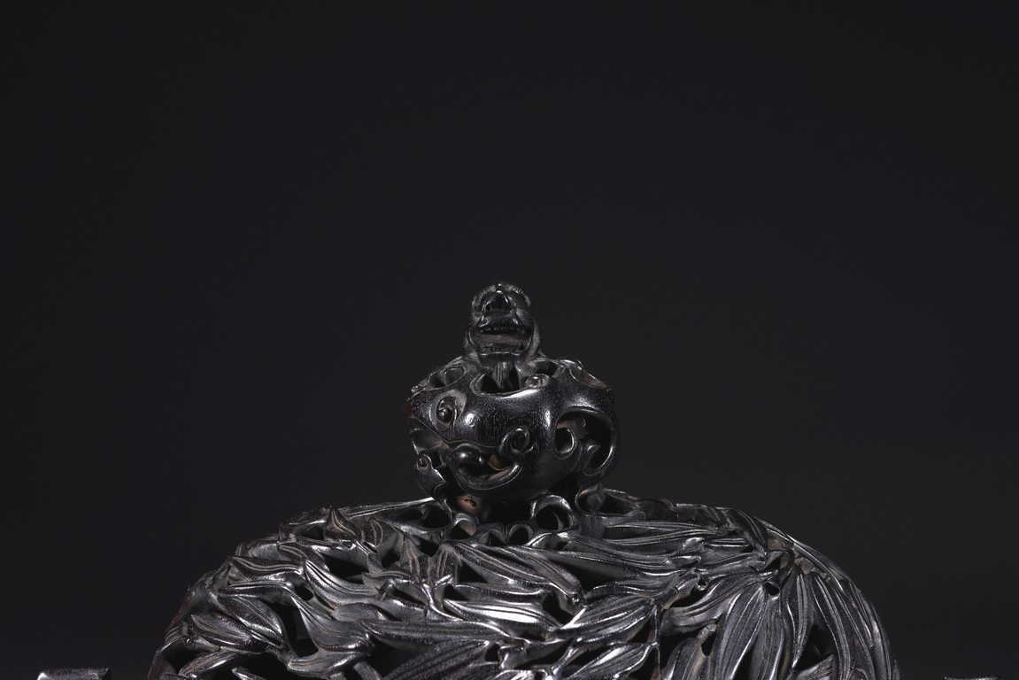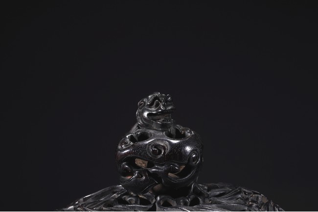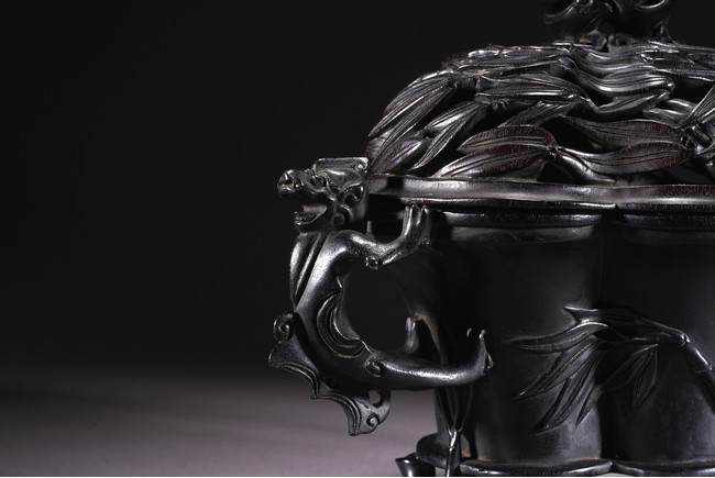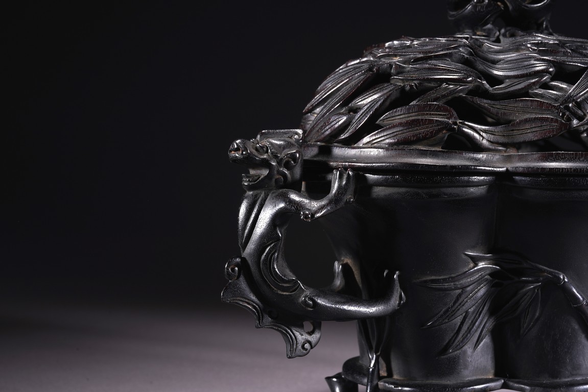 用材印度小葉紫檀,木質堅實,牛毛紋慎密,此器滿工,包漿潤厚,工藝精湛。此爐身、口沿雕飾一圈起線,爐腹與蓋均為竹節紋飾,瑞獸做鈕,刀法熟練,線條流暢,此爐霸氣壯觀,是堂室之重器。