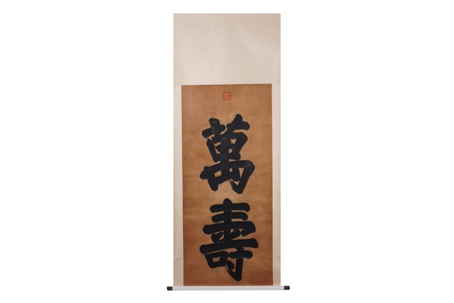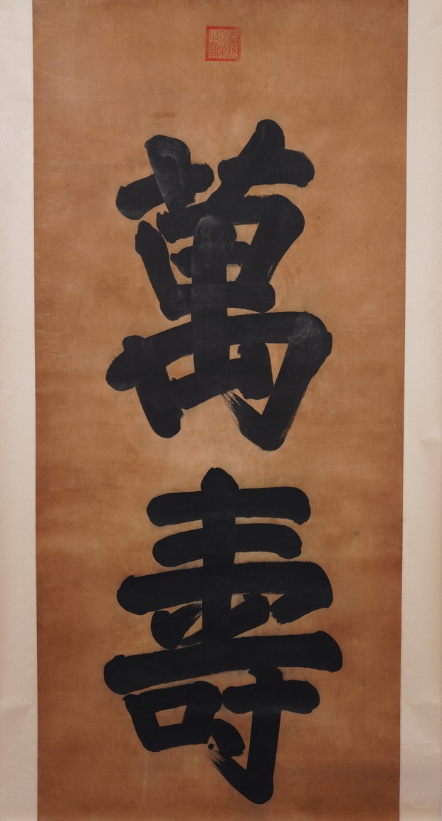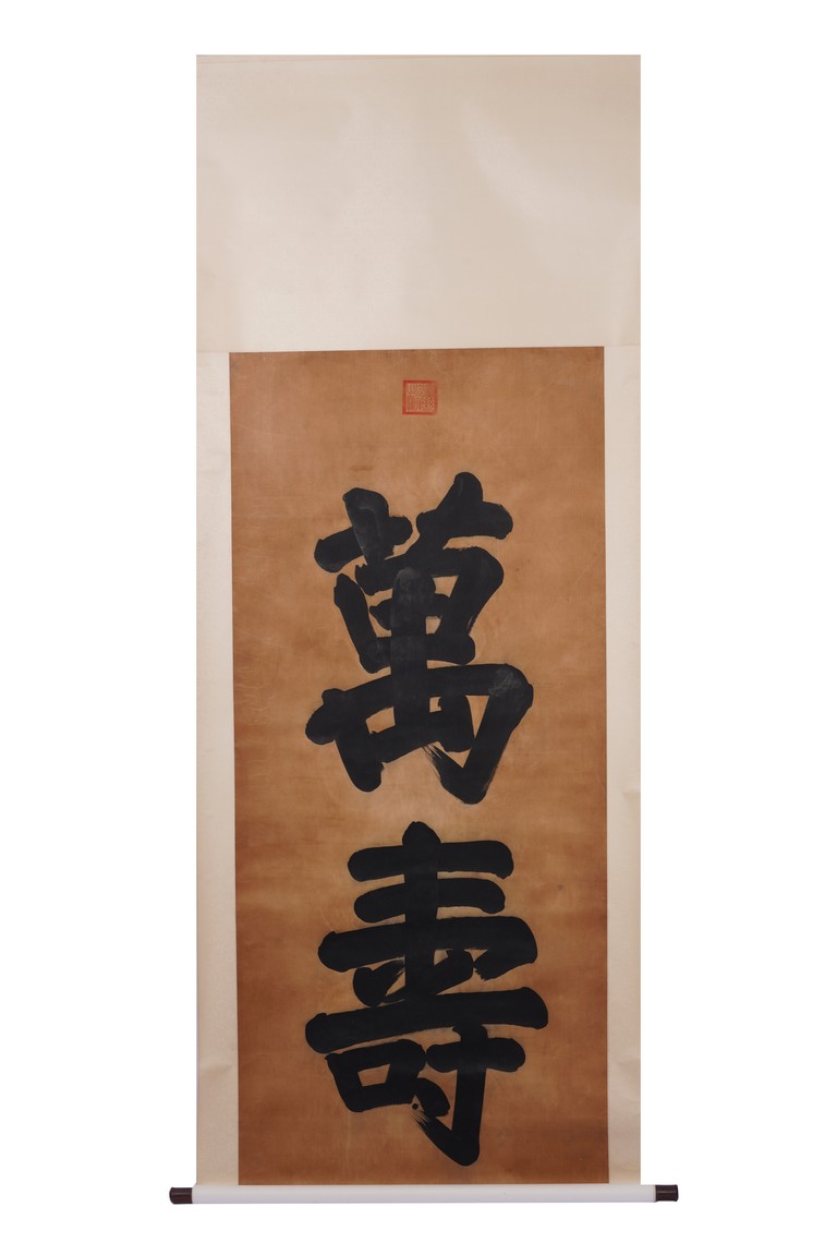 AN IMPERIAL STYLE REGULAR SCRIPT 'WAN SHOU' CALLIGRAPHY 萬壽 楷書書法 立軸 綾本