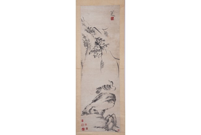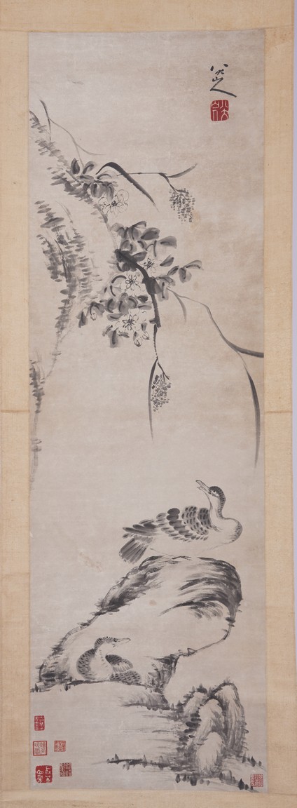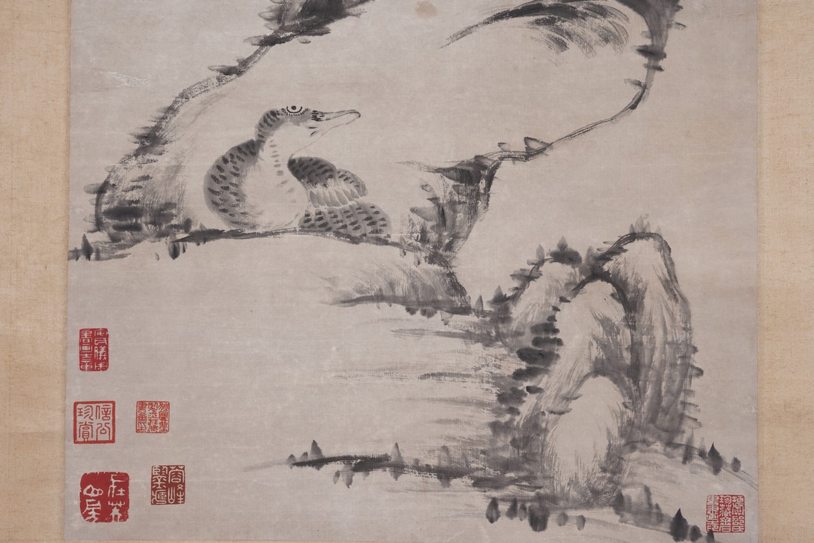 Ink on paper. Hanging scroll. Geese and Rocks. Signed Bada Shanren with seal marks. Attributed to Bada Shanren.