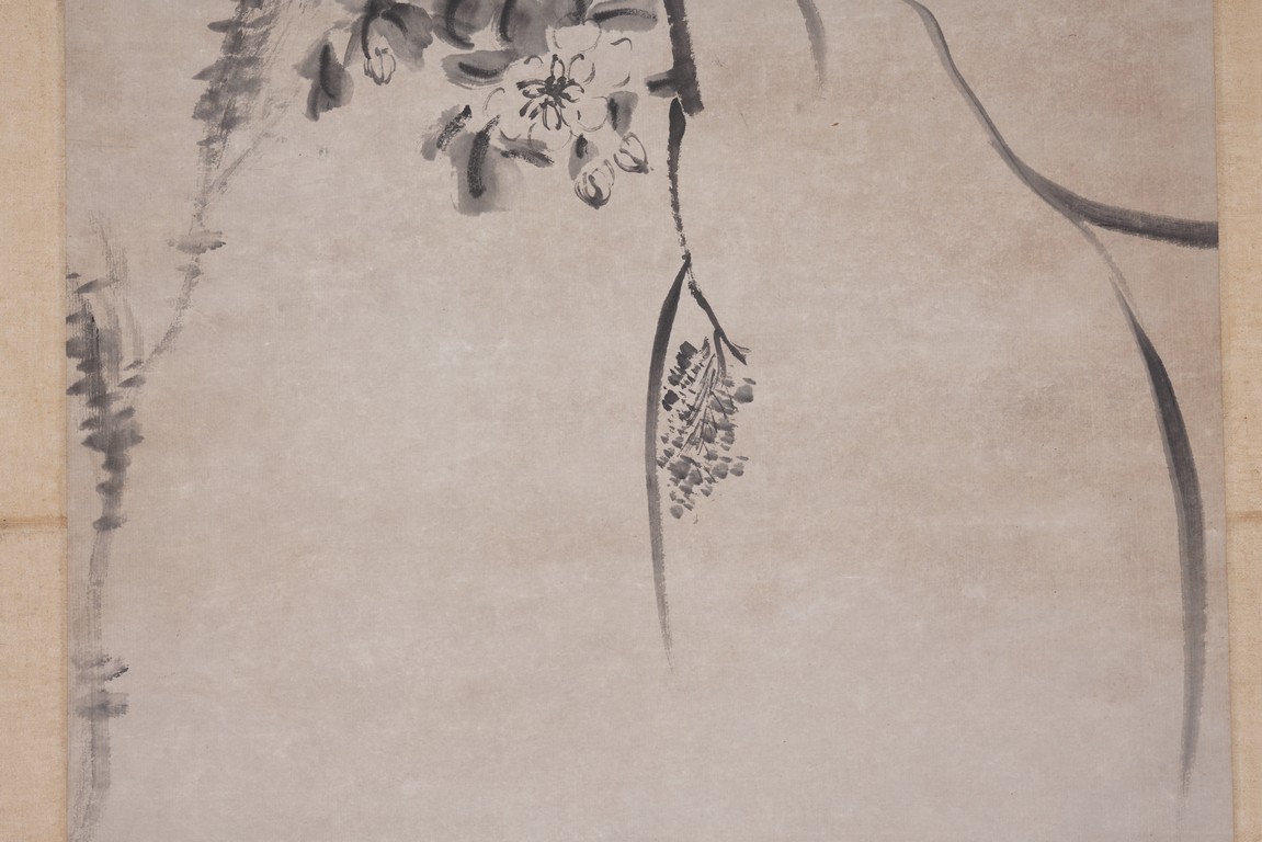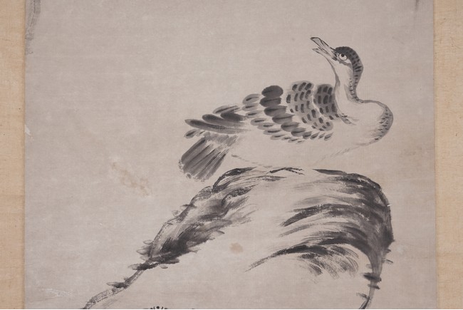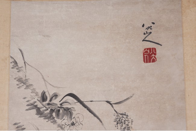 落款:八大山人 鈴印:八大山人。(朱耷字刃庵,號八大山人、雪個、 個山、人屋、道朗等。明末清初畫家,中國畫一代宗師。擅書畫,花鳥以水墨寫 意爲主,形象誇張奇特,筆墨凝煉沈毅,風格雄奇隽永;山水師法董其昌,筆致 簡潔,有靜穆之趣,得疏曠之韻。)