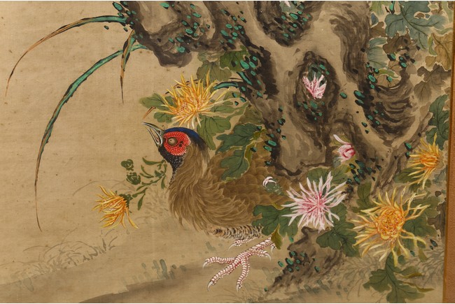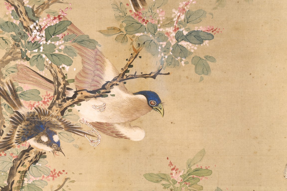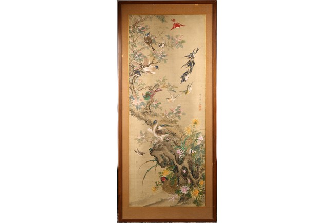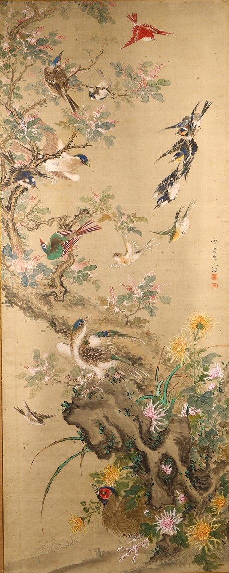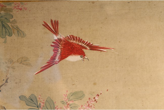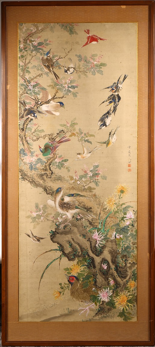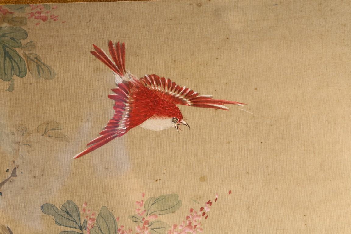 Color and ink on silk. Birds and Flowers. Framed. Signed Xue Yan Yi Ren with two seal marks of the artist.