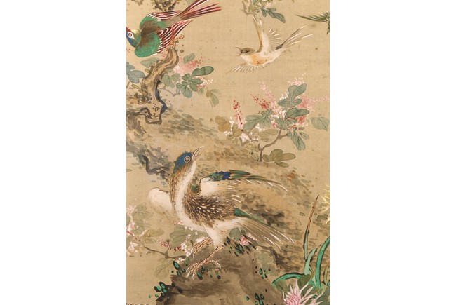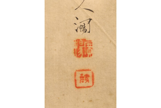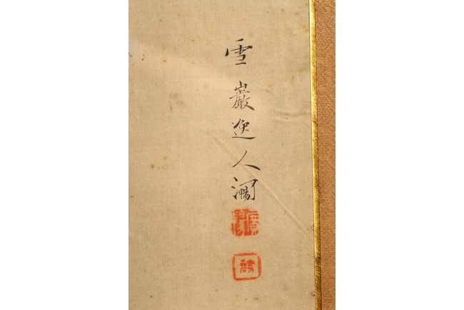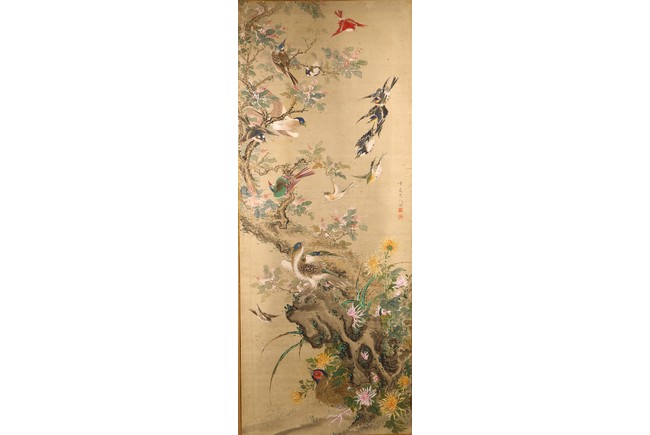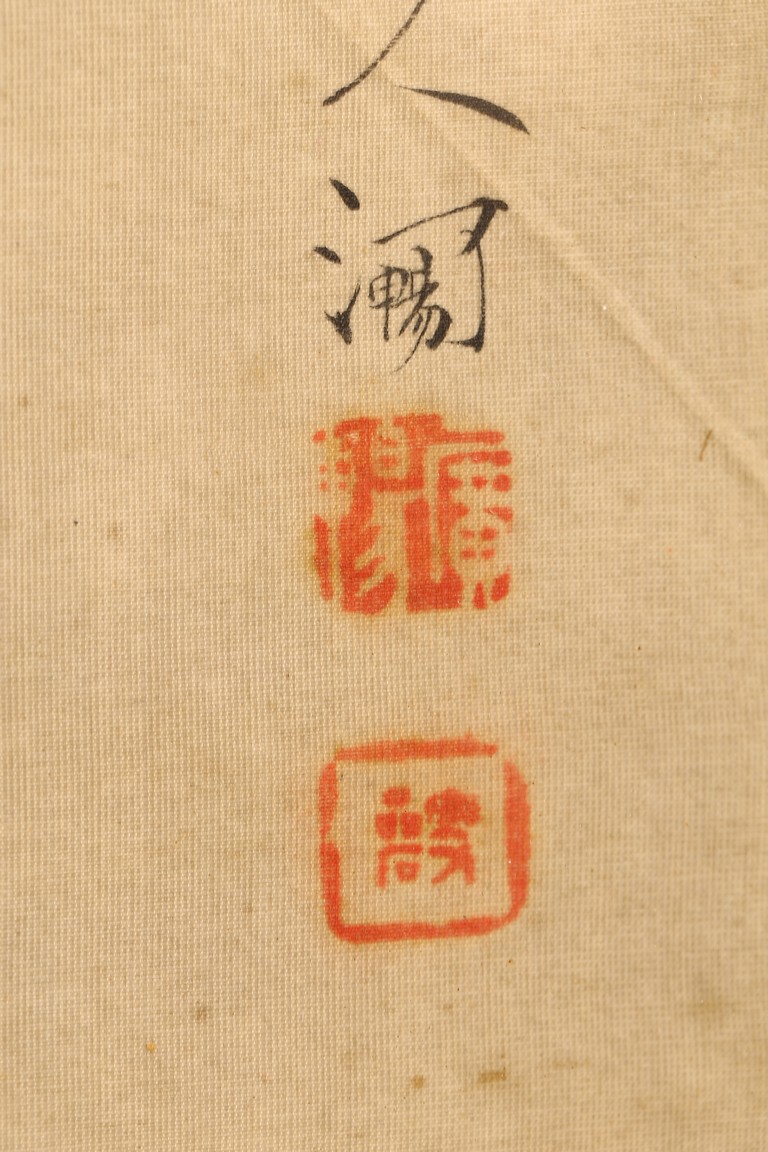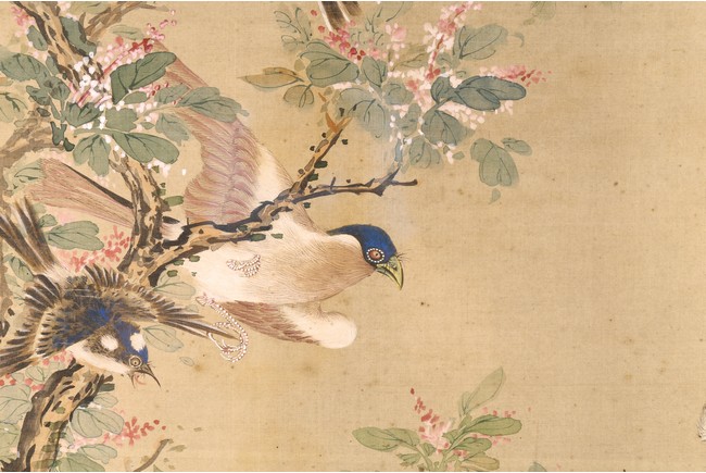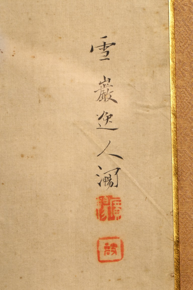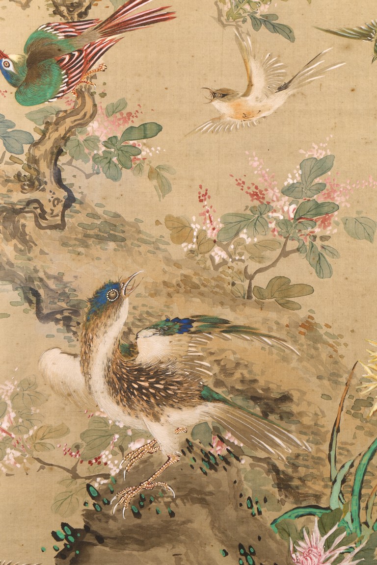 Color and ink on silk. Birds and Flowers. Framed. Signed Xue Yan Yi Ren with two seal marks of the artist.