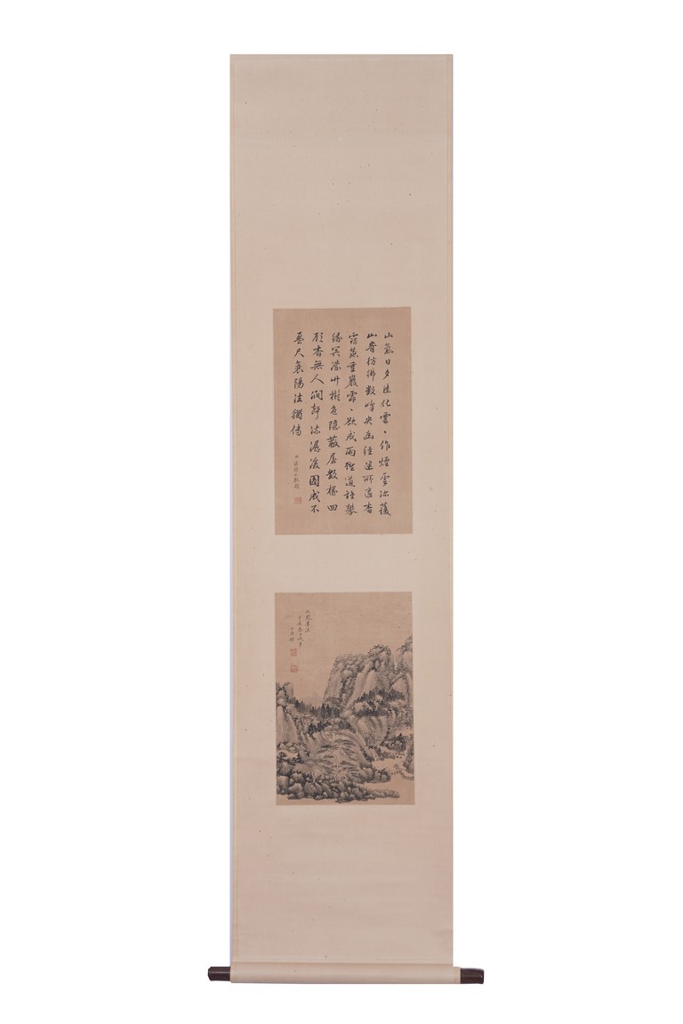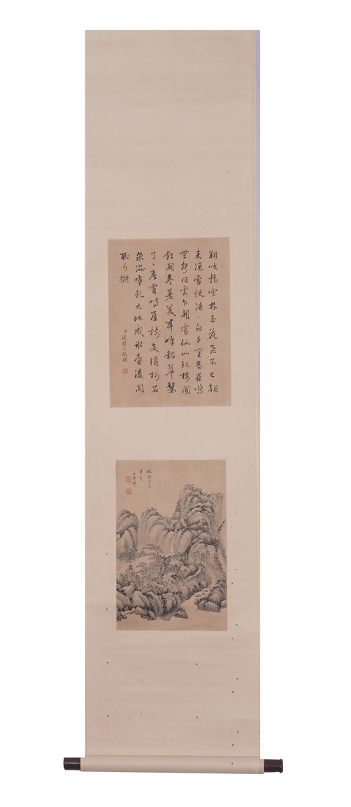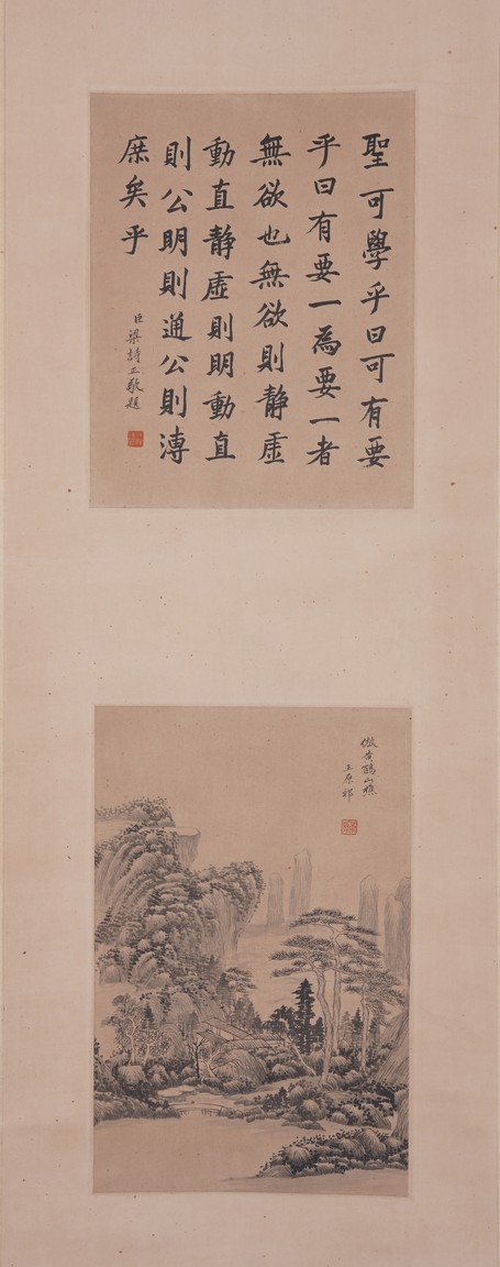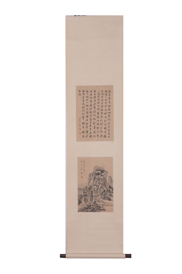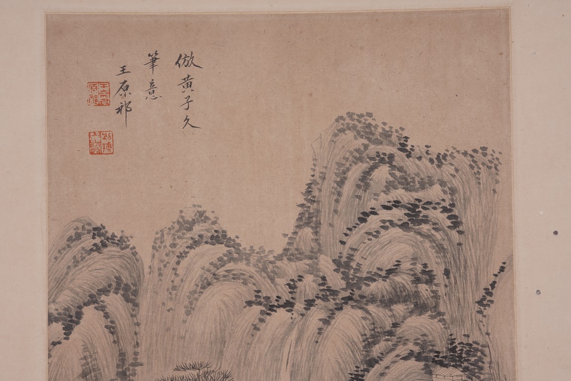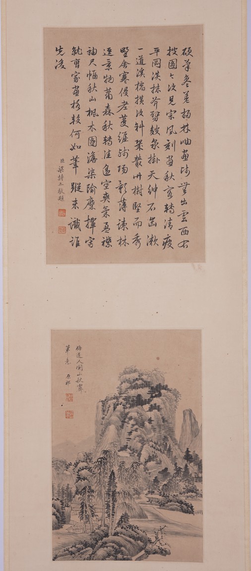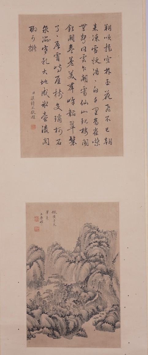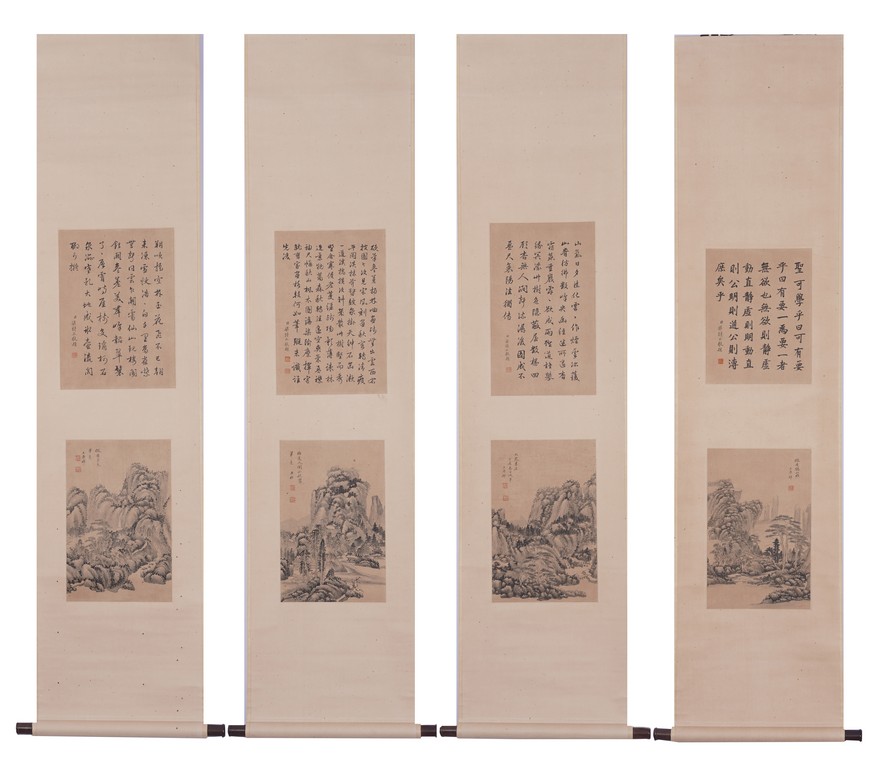 Ink on paper. Set of four landscape paintings. Hanging scroll. Inscribed and signed Wang Yuanqi with seal marks, with calligraphies signed Liang Shizheng with seal marks.