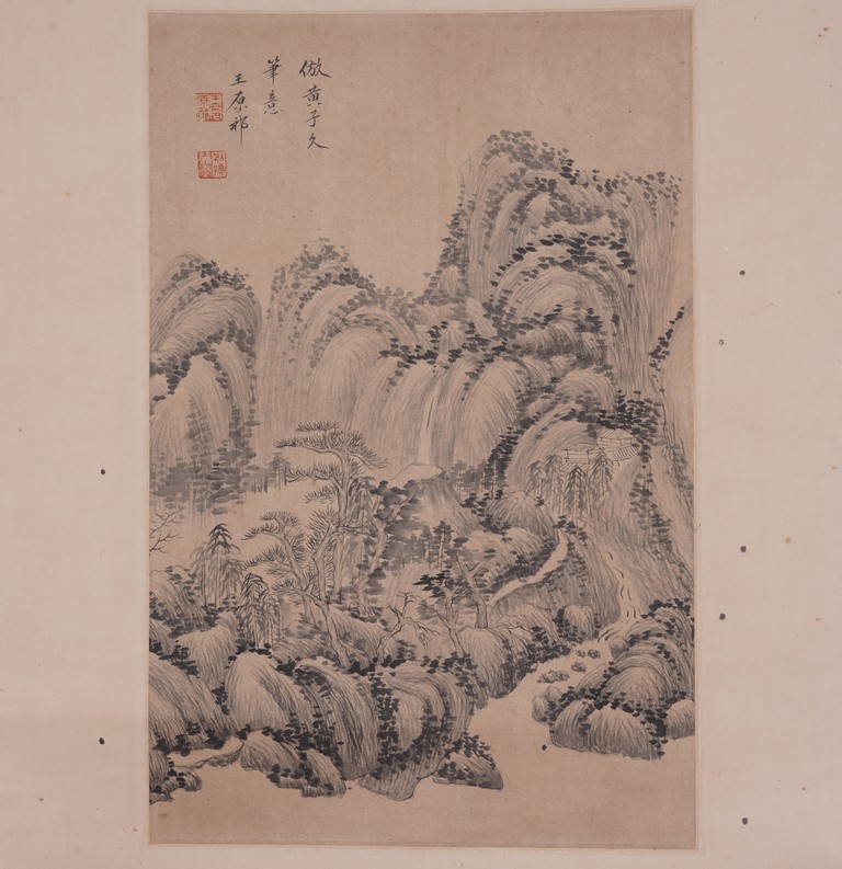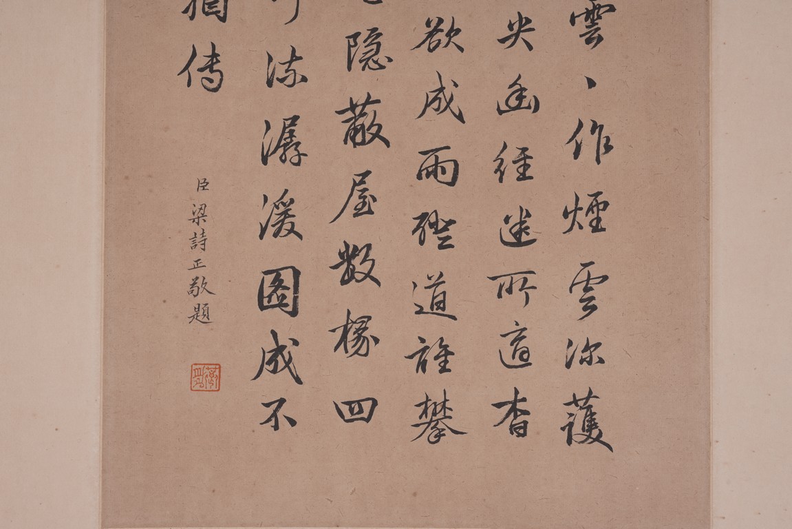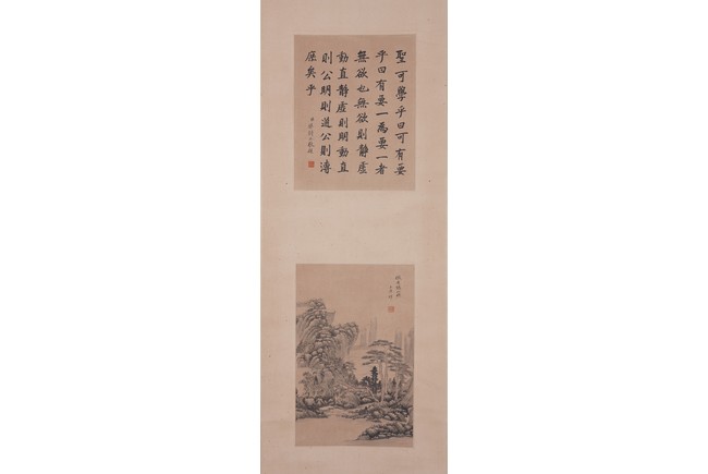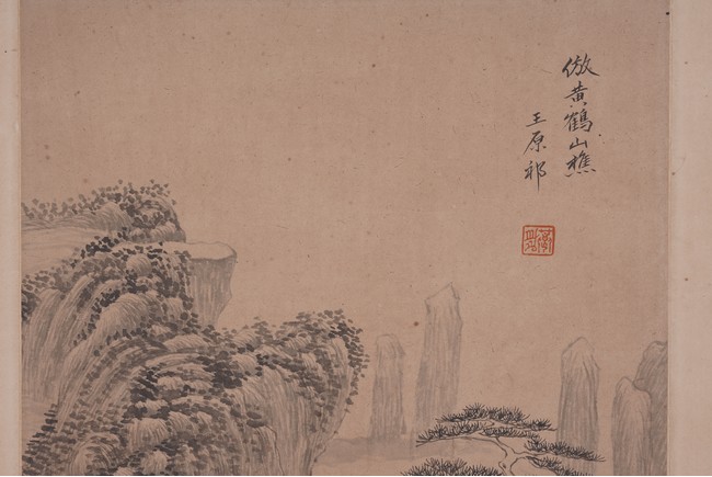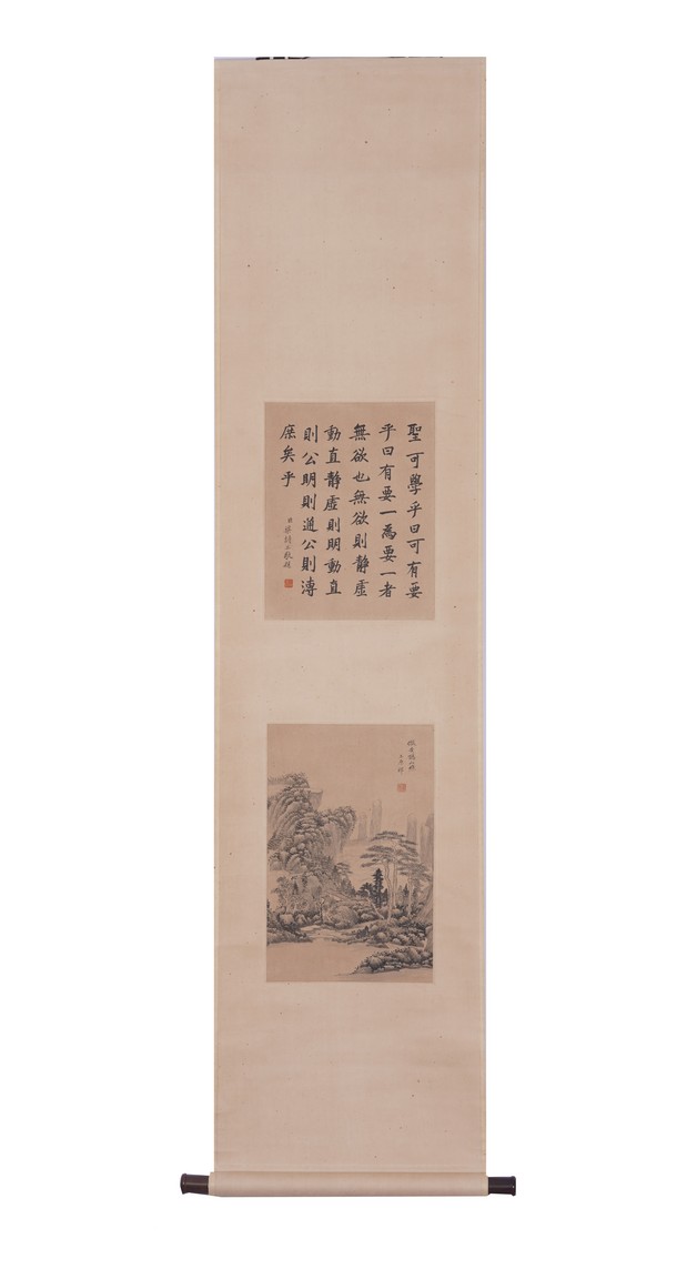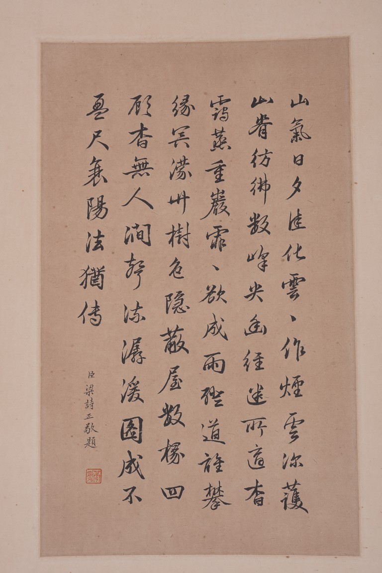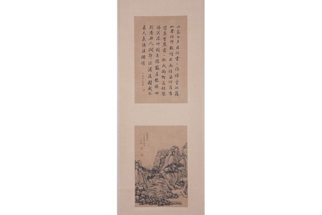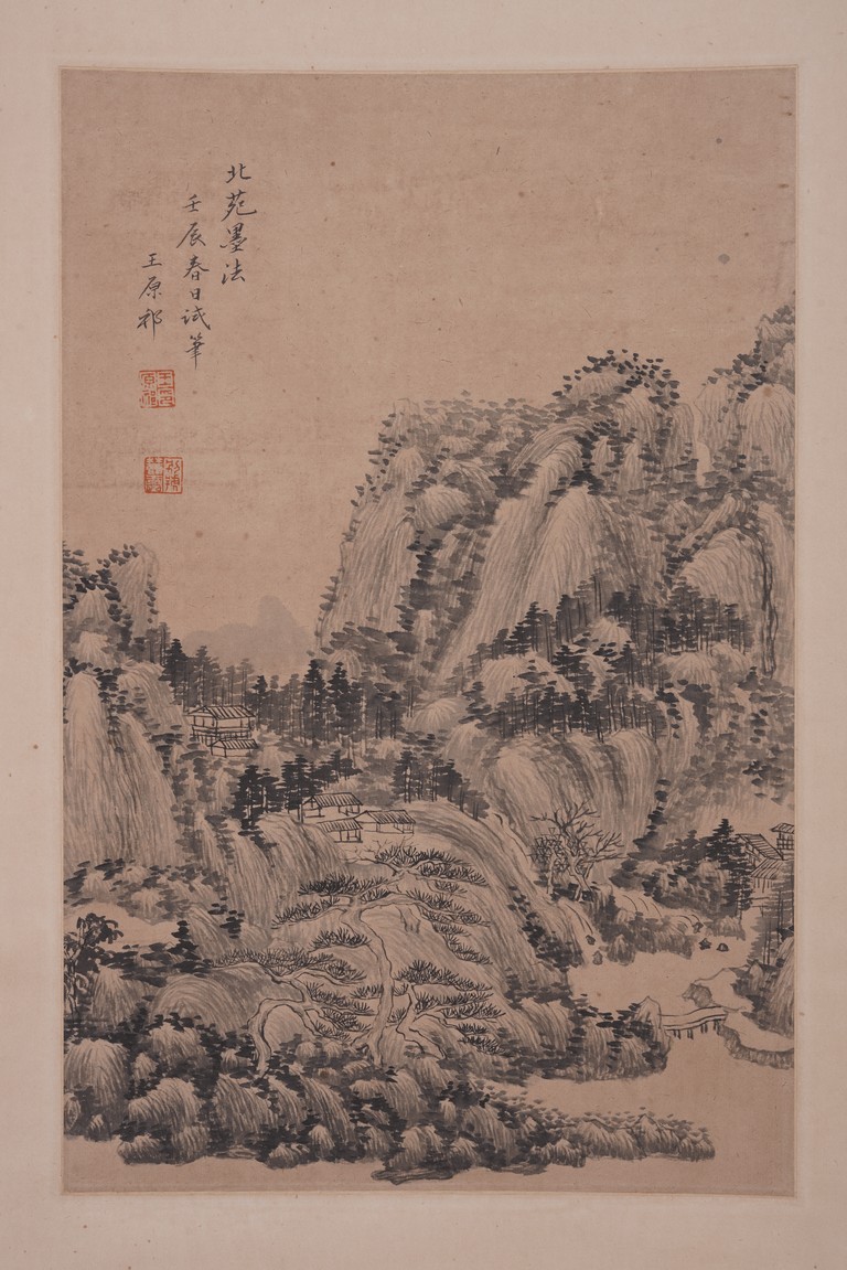 Ink on paper. Set of four landscape paintings. Hanging scroll. Inscribed and signed Wang Yuanqi with seal marks, with calligraphies signed Liang Shizheng with seal marks.
