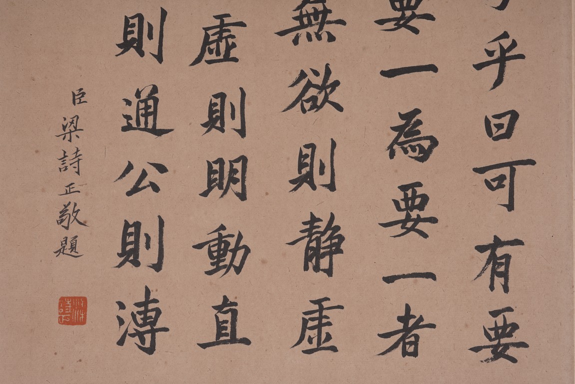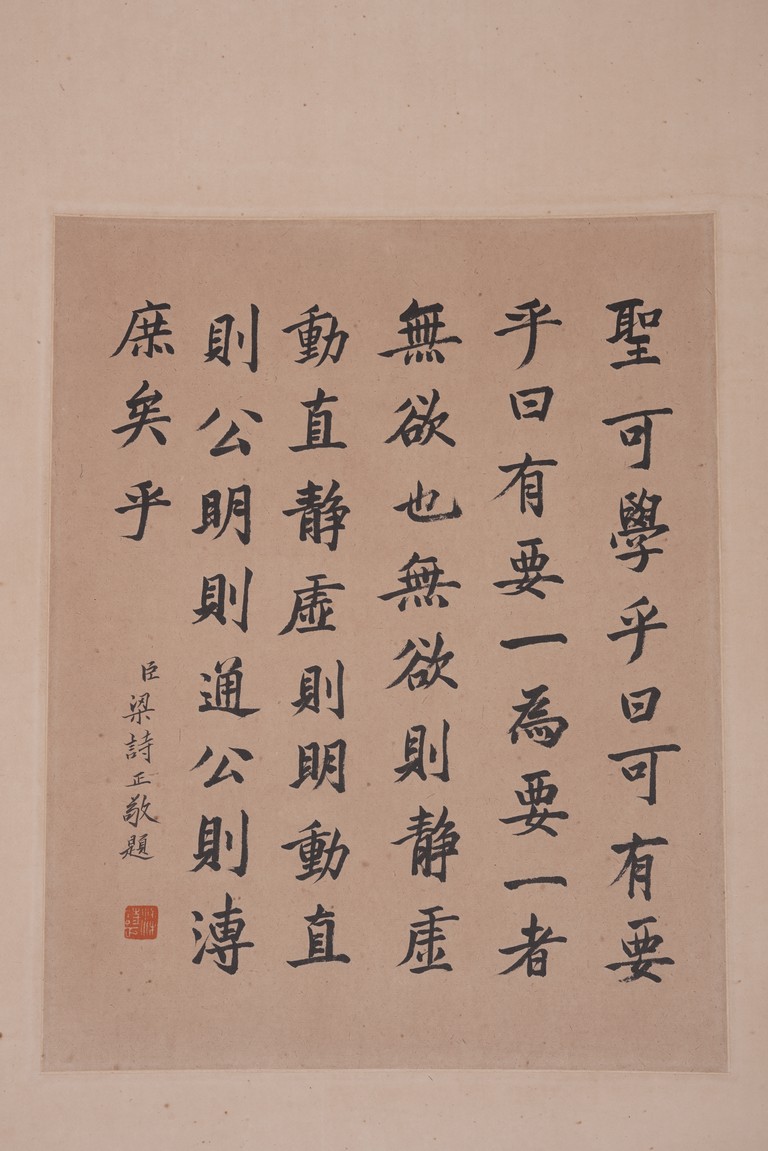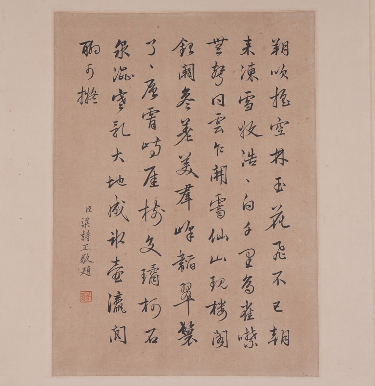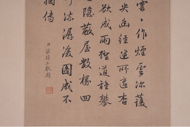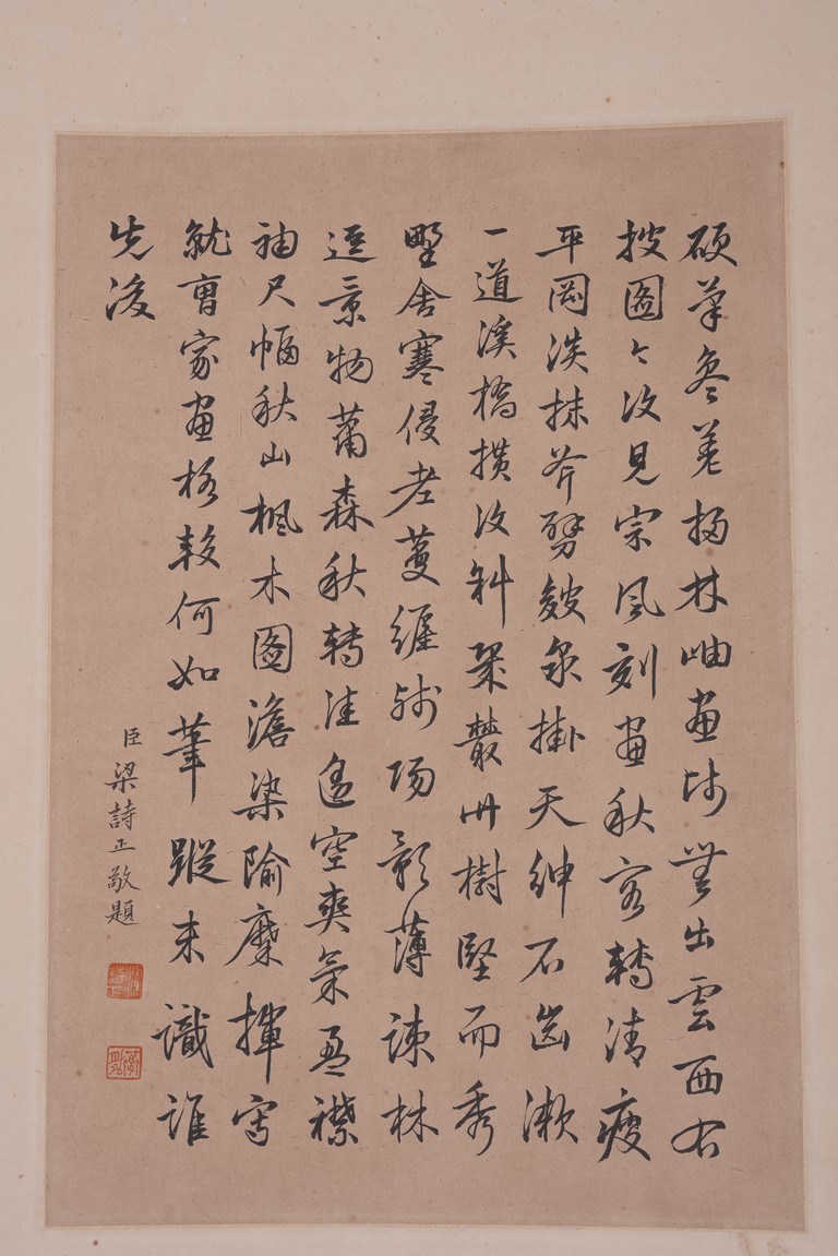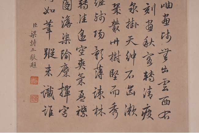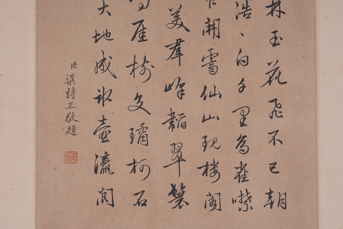 王原祁:字茂京,號麓台、石師道人,王時敏孫。以畫供奉內廷,康熙四十 四年奉旨與孫嶽頒、宋駿業等編《佩文齋書畫譜》,五十六年主持繪《萬壽盛典 圖》爲康熙帝祝壽。擅畫山水,繼承家法,學元四家,以黃公望爲宗,喜用幹筆 焦墨,層層皴擦,用筆沈著,自稱筆端有金剛杵。與王時敏、王鑒、王翚並稱“四 王”。 梁詩正:字養仲,號芗林,又號文濂子,錢塘(今浙江杭州)人。清代官 員、書法家。梁詩正經常隨乾隆帝出巡,朝廷重要文稿多出其手。