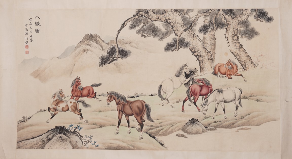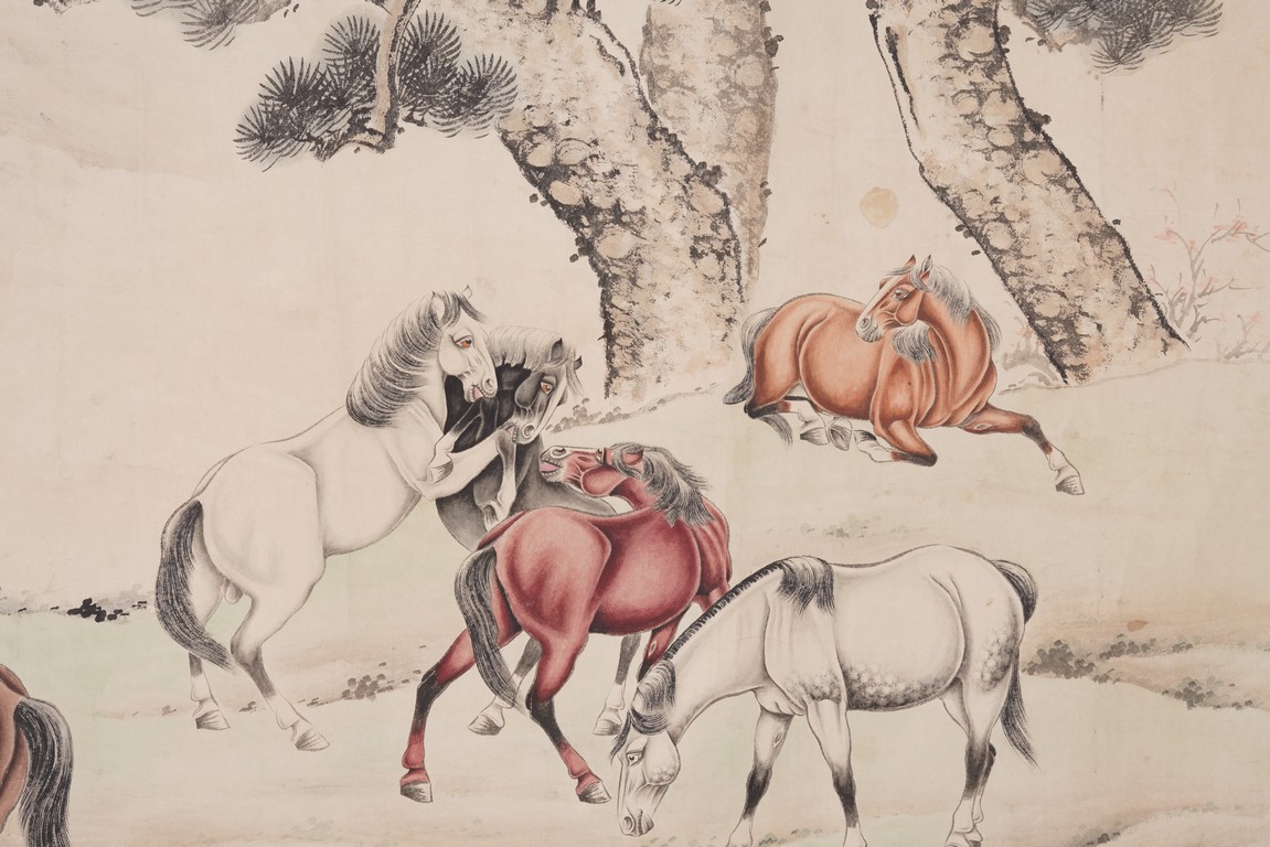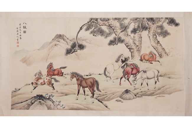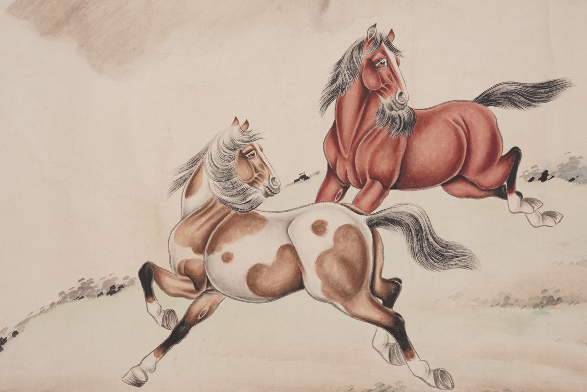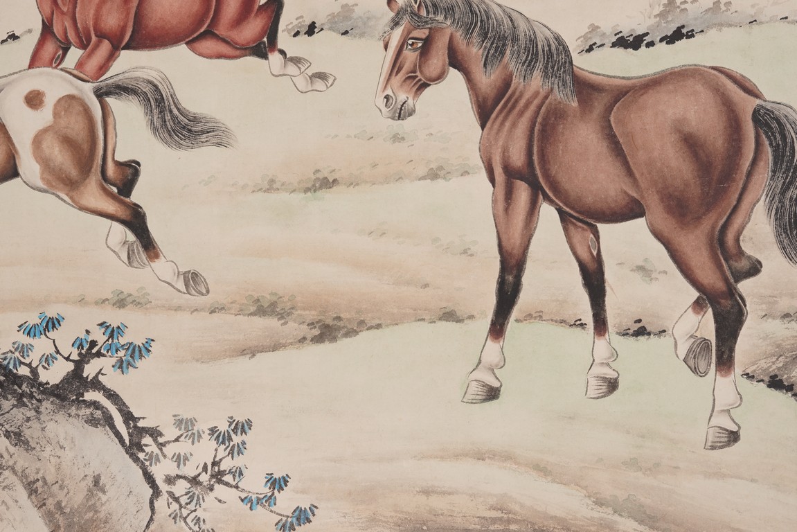 Color and ink on paper. Horses. Mounted on paper. Inscribed and signed Pu Jin with two seal marks.
