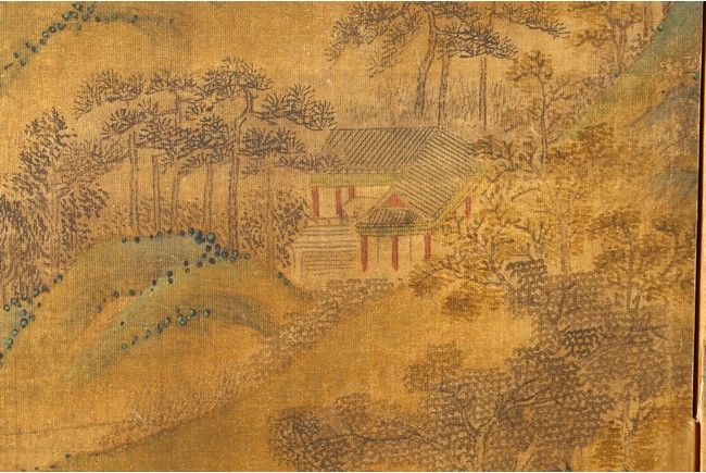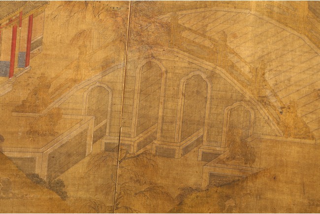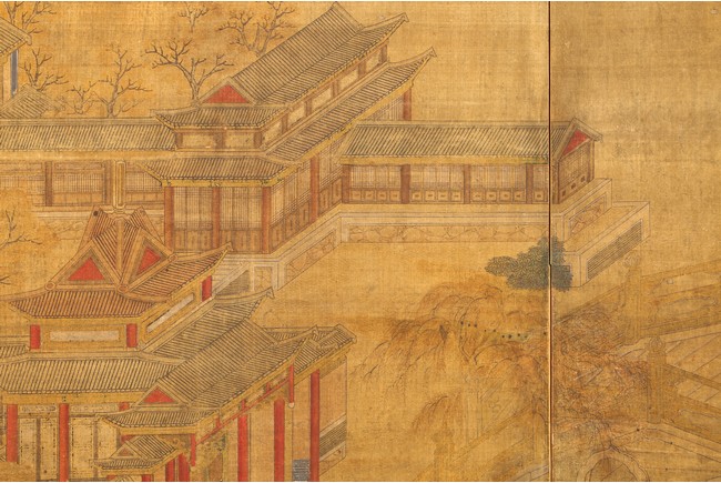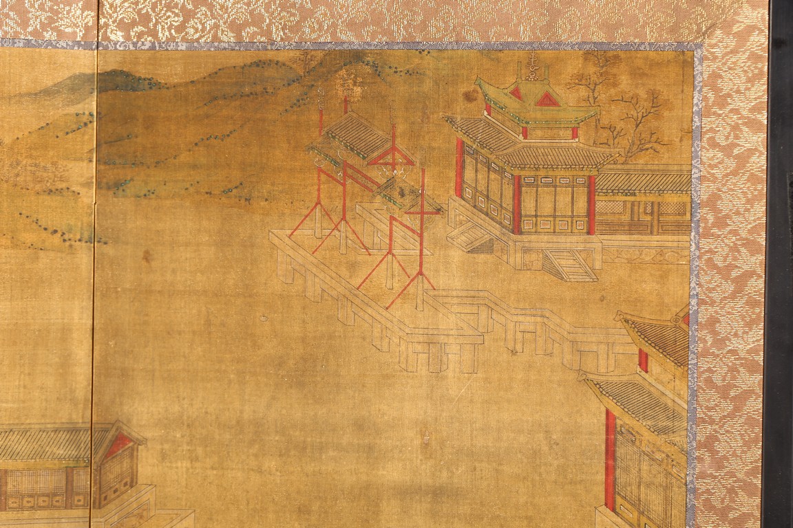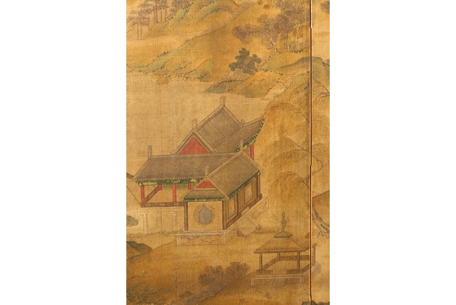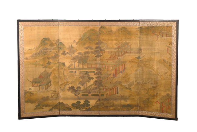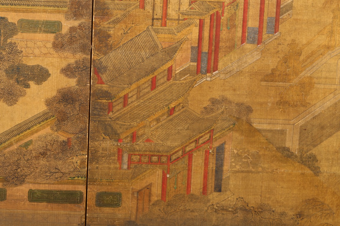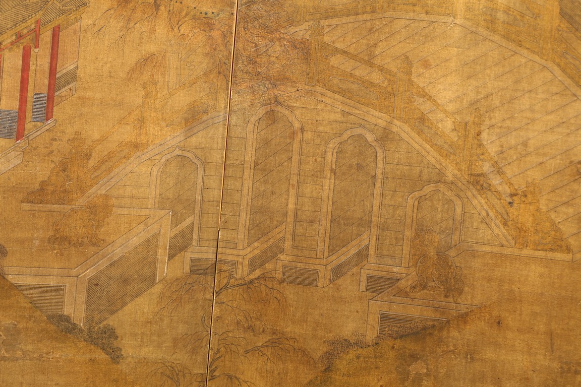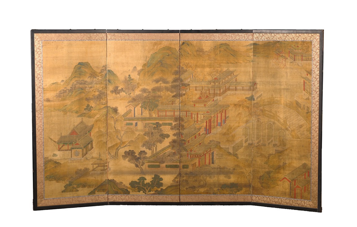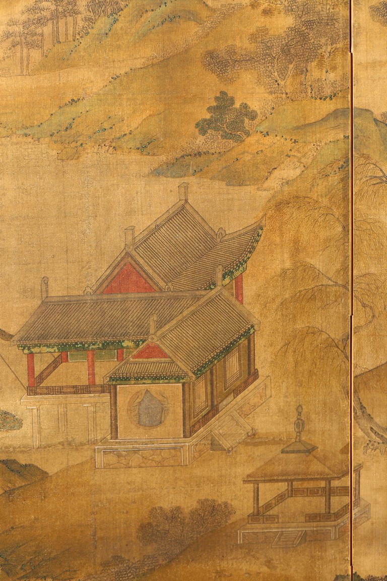 Early-Mid Qing Dynasty period. Color and ink on silk. The four panel screen finely painted with lush landscape of pavilions, bridge, and palaces, in the style of Yuan Jiang. Anonymous. Provenance: Christie's New York, March 2018, Lot 121.