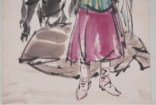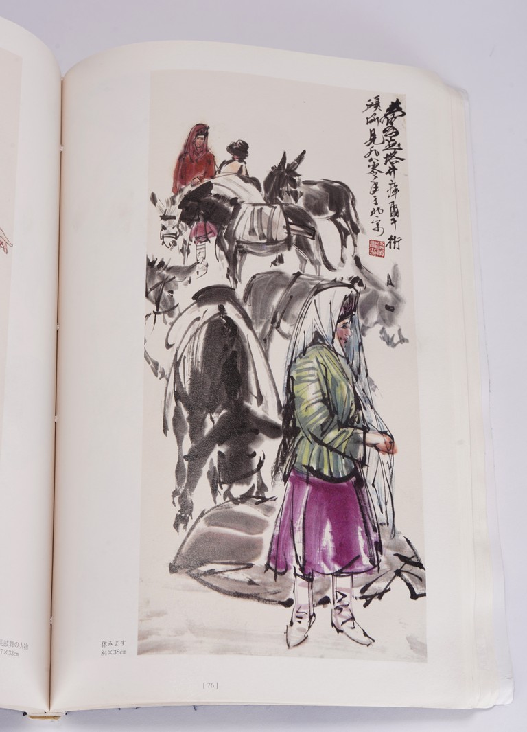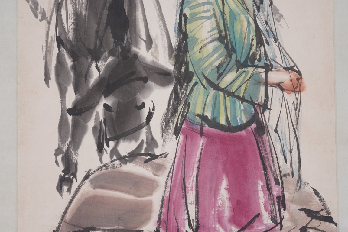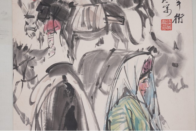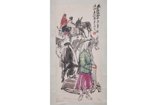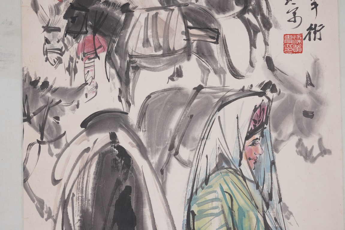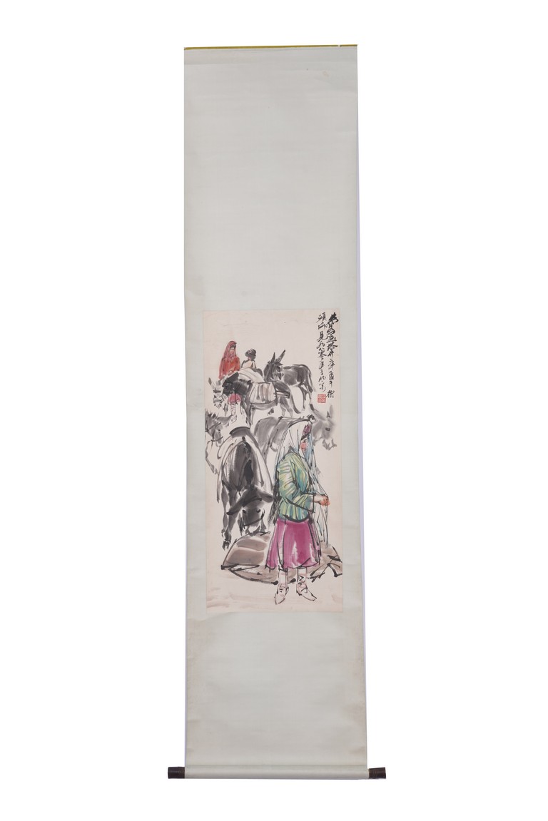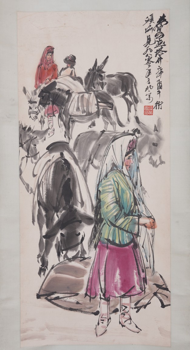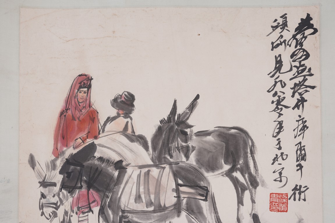Color and Ink on Paper. Hanging scroll. Figures and donkeys. Inscribed and signed with one seal mark and attributed to Huang Zhou.