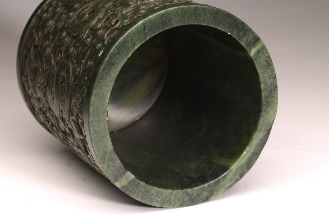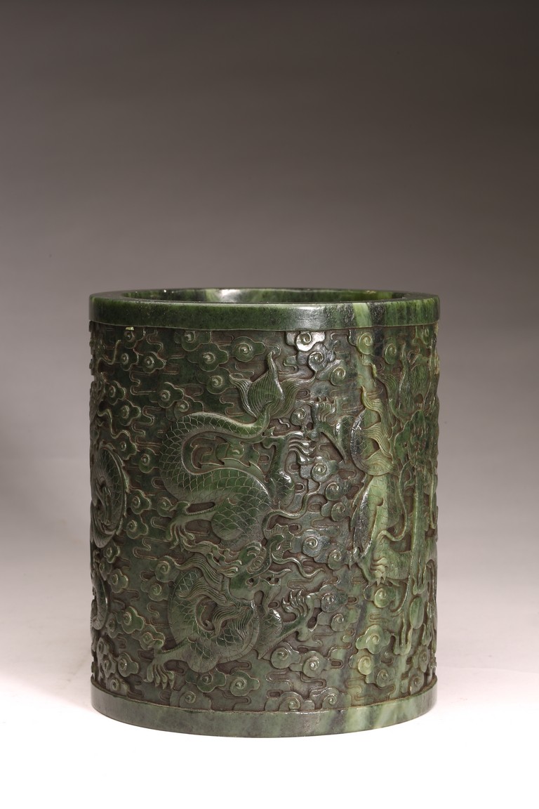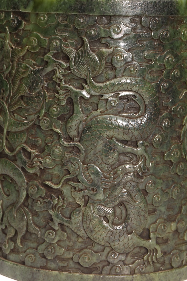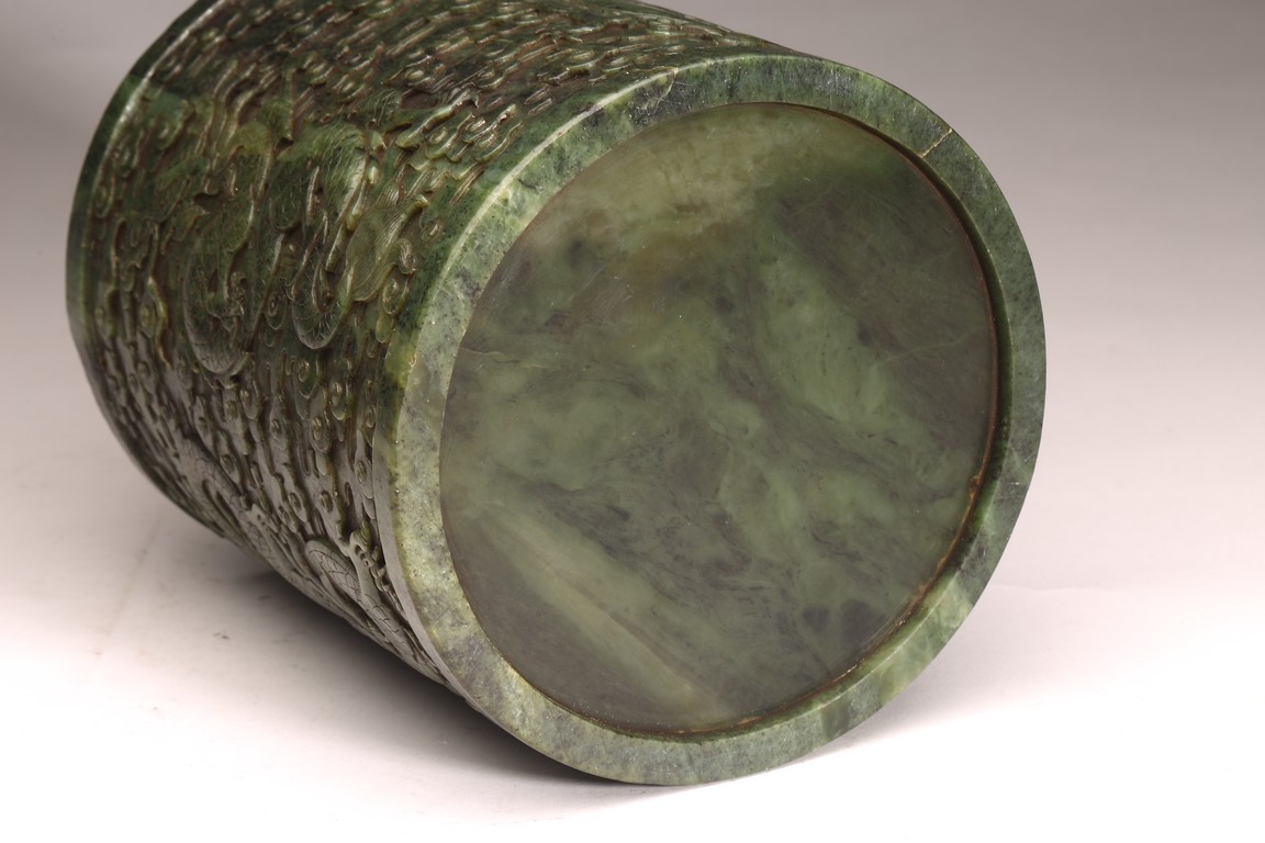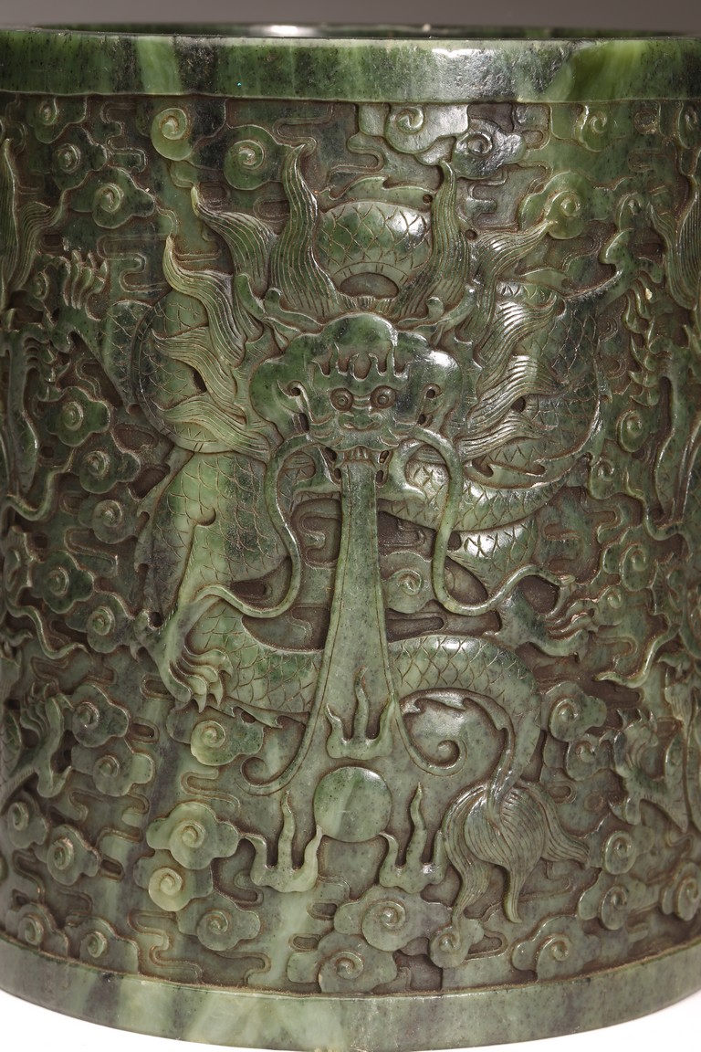 Qing Dynasty period. Of cylindrical form, the brushpot exterior carved in relief with leaping dragon amidst clouds, the stone is of the lustrous rich spinach-green color with dark speckle