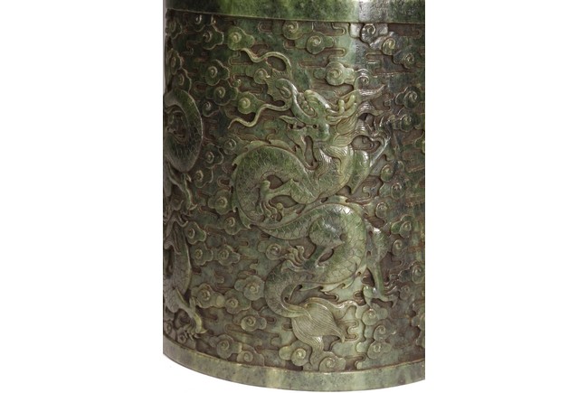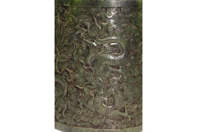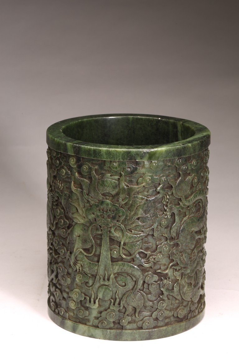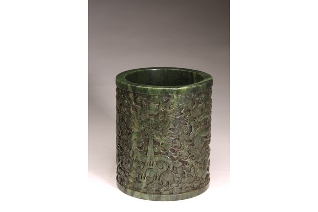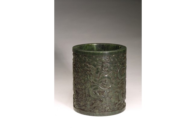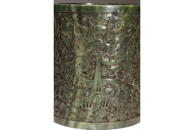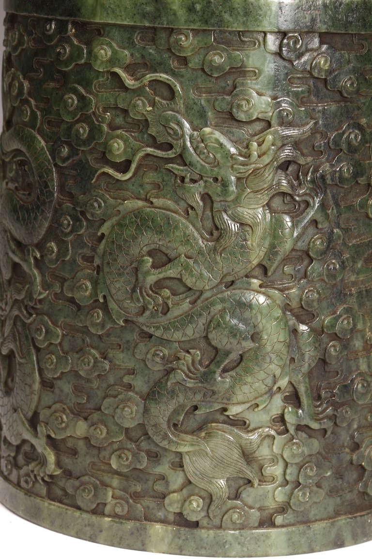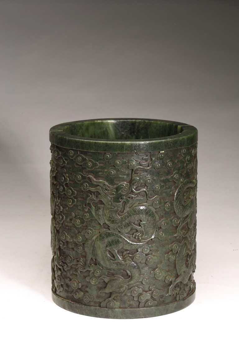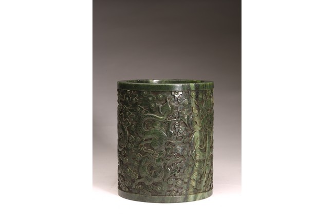 Qing Dynasty period. Of cylindrical form, the brushpot exterior carved in relief with leaping dragon amidst clouds, the stone is of the lustrous rich spinach-green color with dark speckle