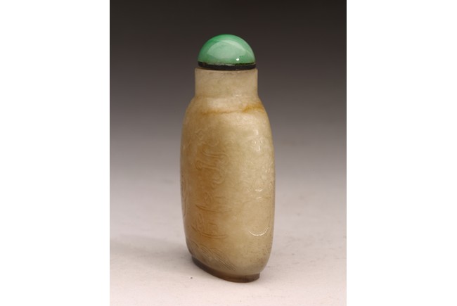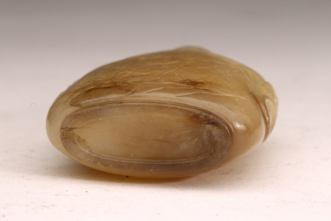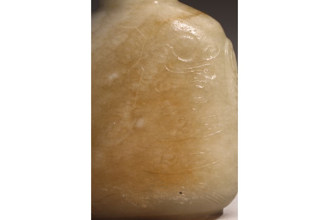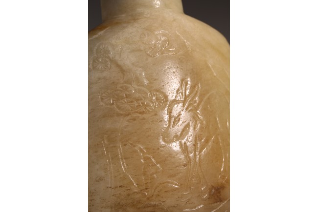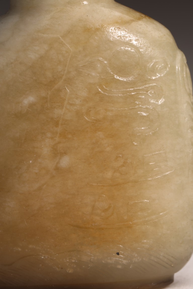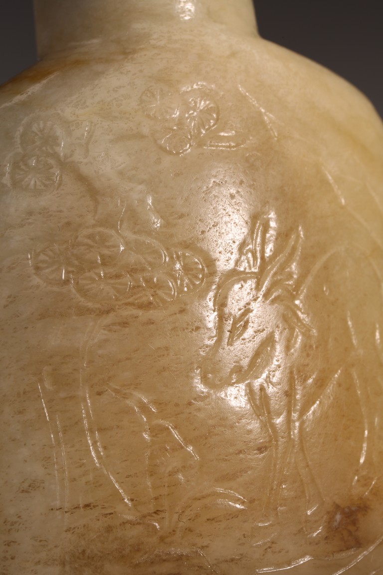呈扁瓶狀。直頸,斜肩,褐黃玉制成,腹部雕刻“松鹿紋”,刻畫清晰,寓意美好,有長壽 延年之意。
