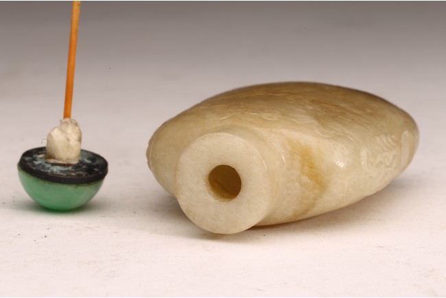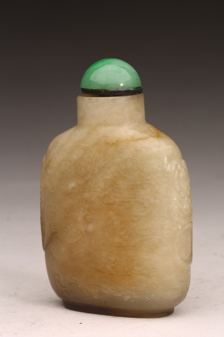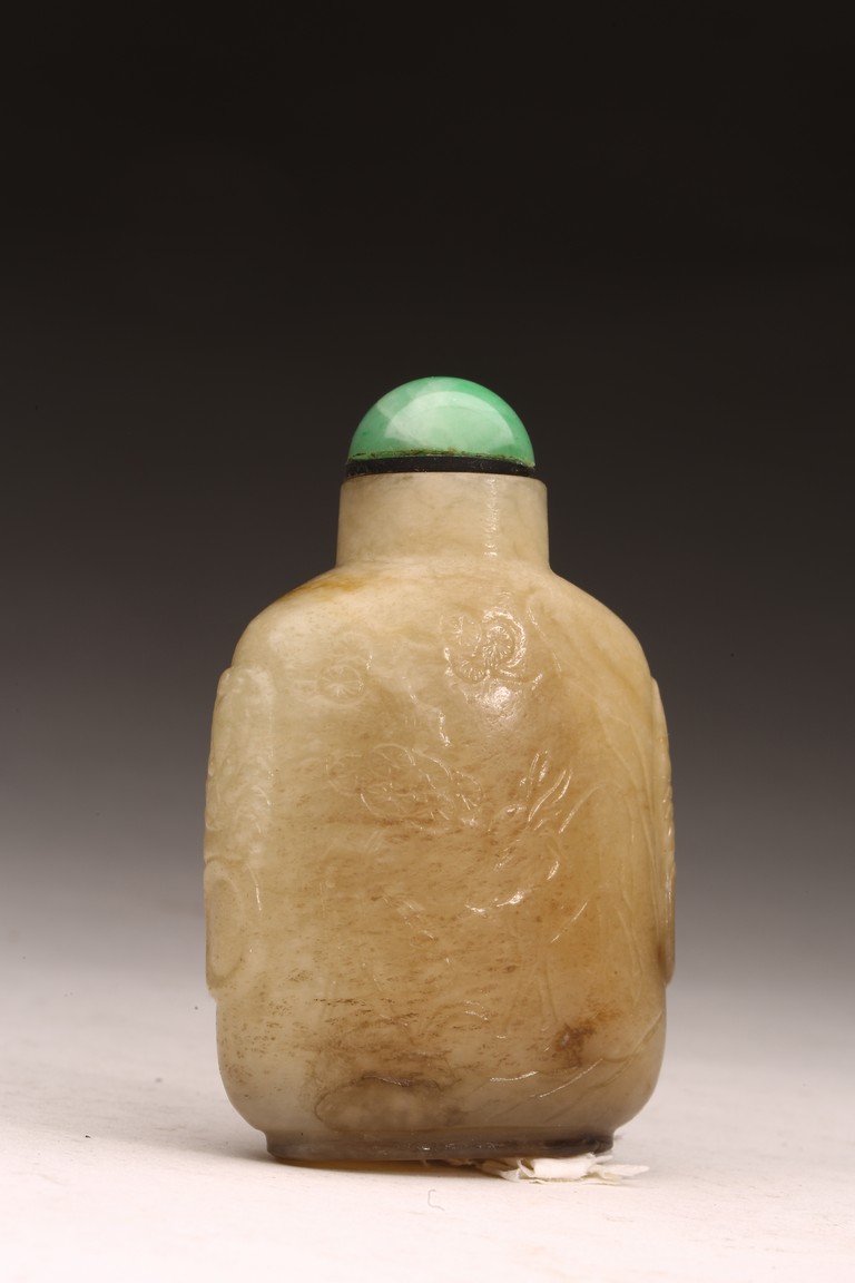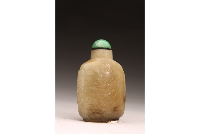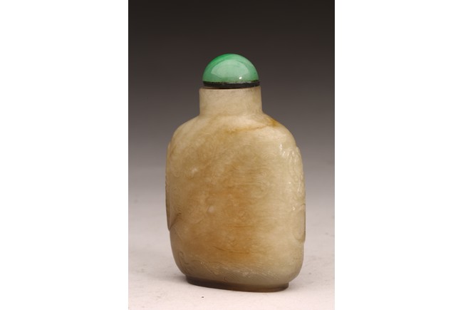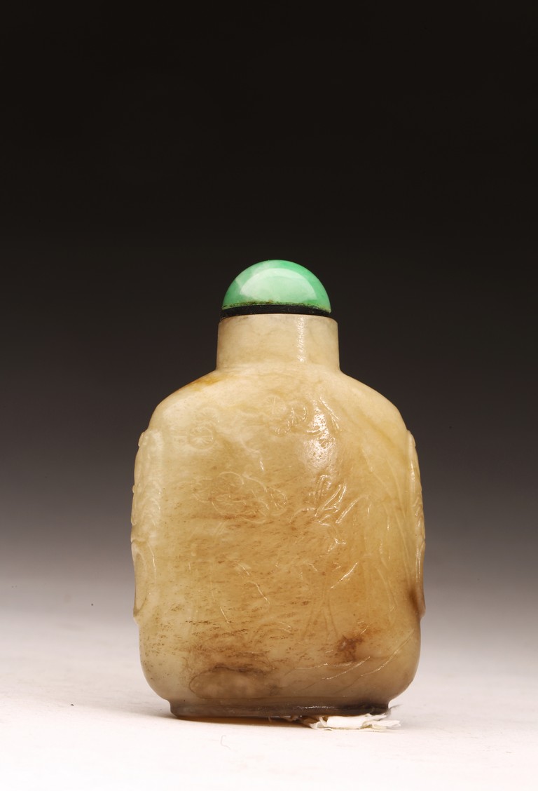 呈扁瓶狀。直頸,斜肩,褐黃玉制成,腹部雕刻“松鹿紋”,刻畫清晰,寓意美好,有長壽 延年之意。