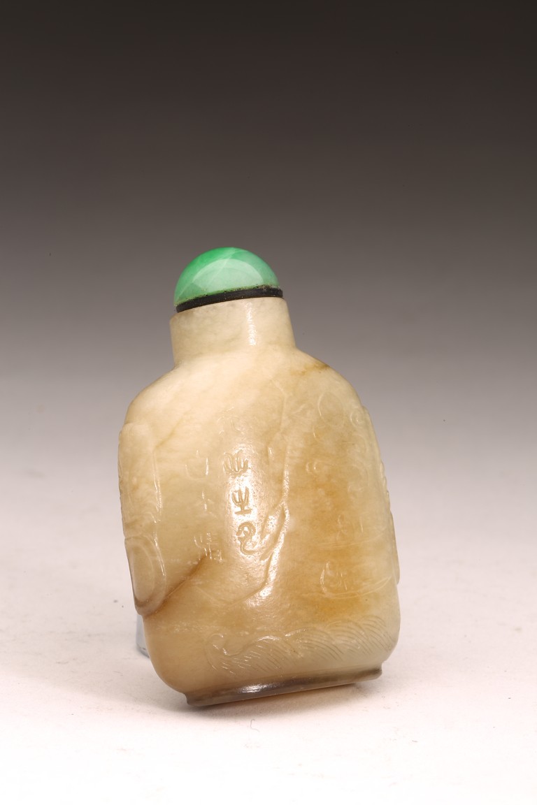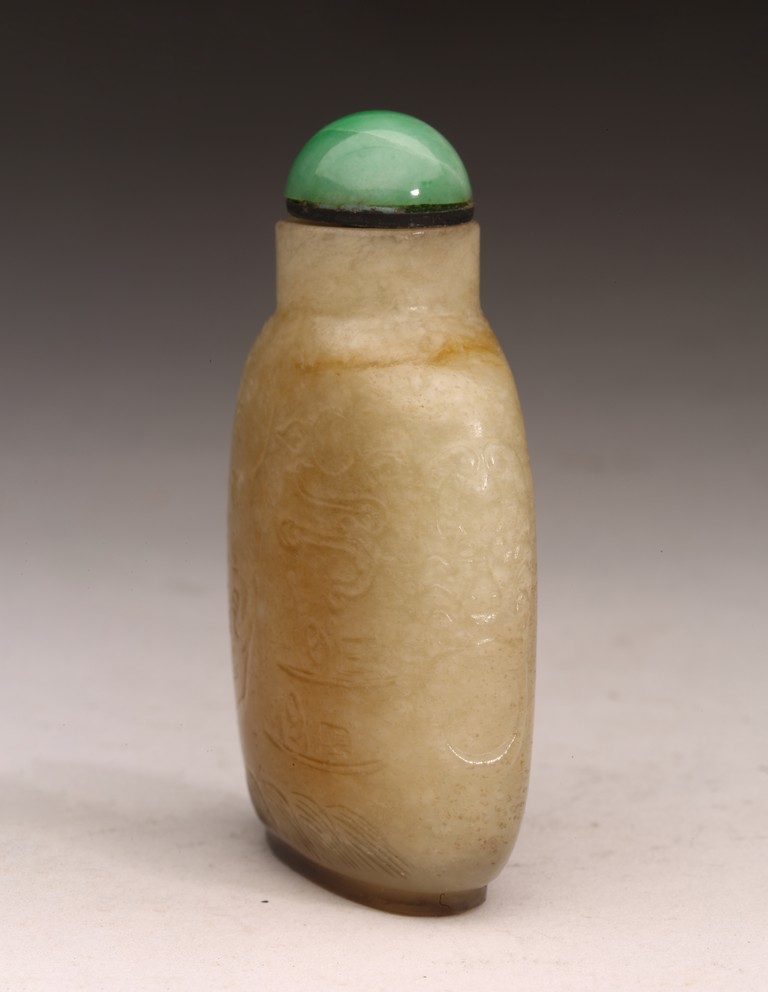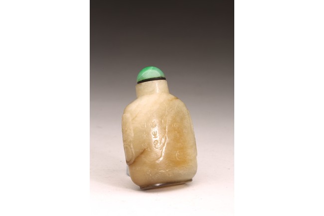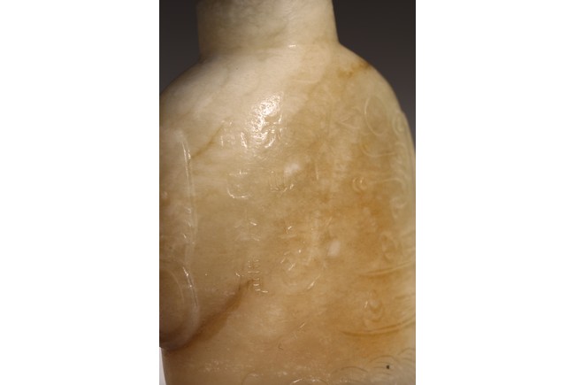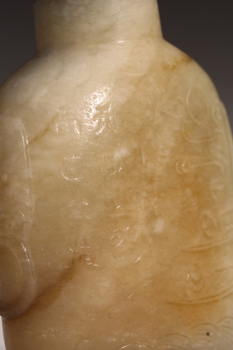 Qing Dynasty period. Of flattened rounded rectangular form, the body carved in relief with landscape scene with inscriptions.