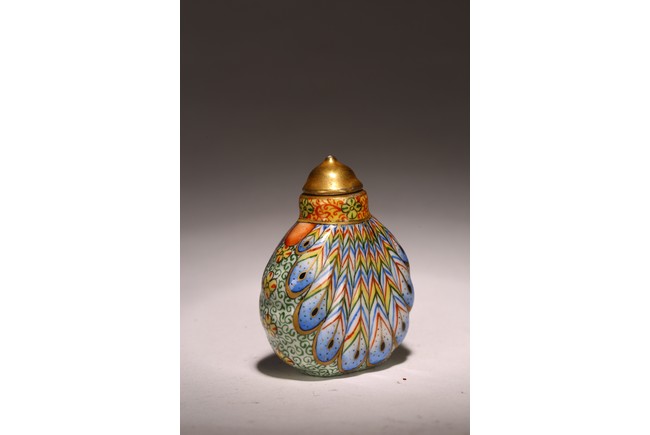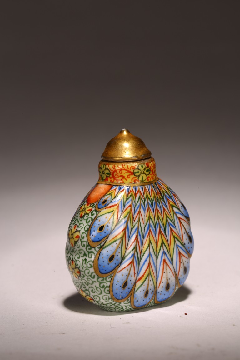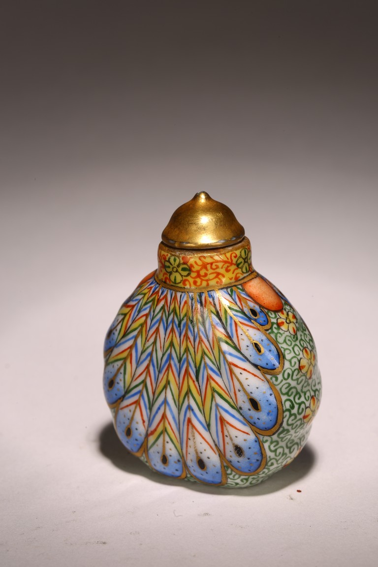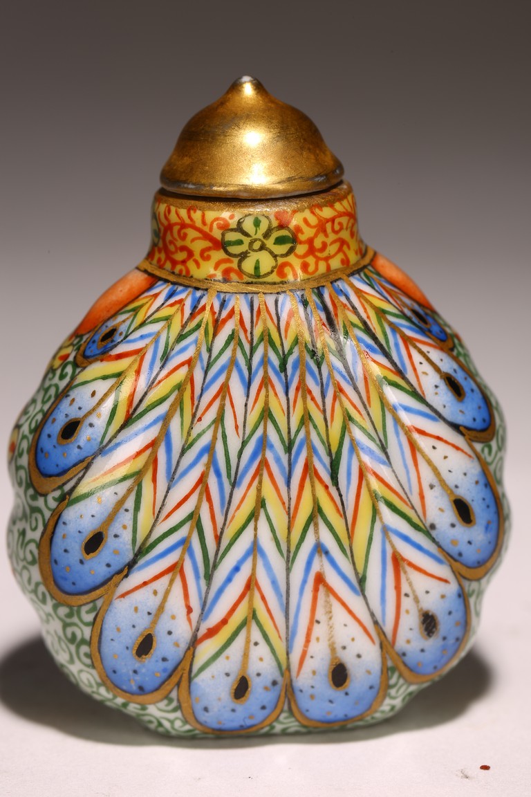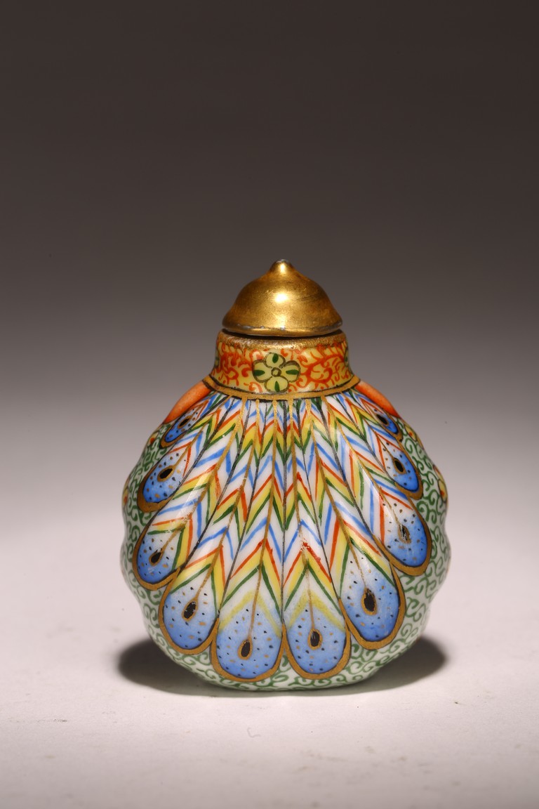 直口,帶蓋,蓋鈕描金,扁圓型,器身粉彩繪孔雀尾部紋樣,畫工精細,排列規矩,色彩豐富