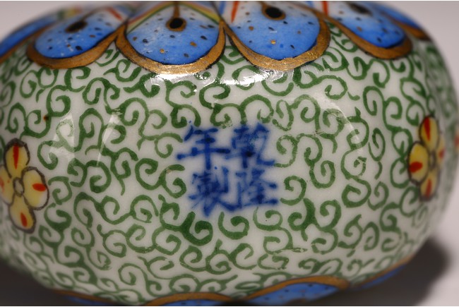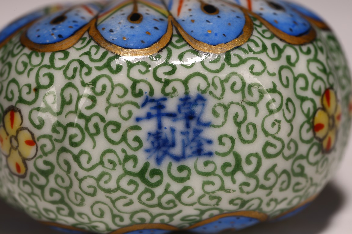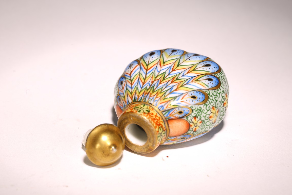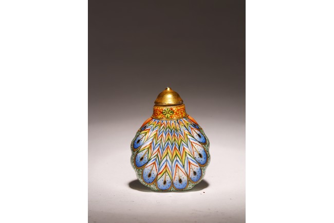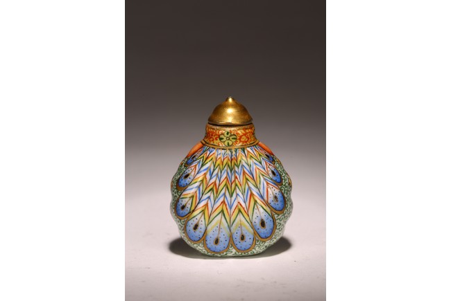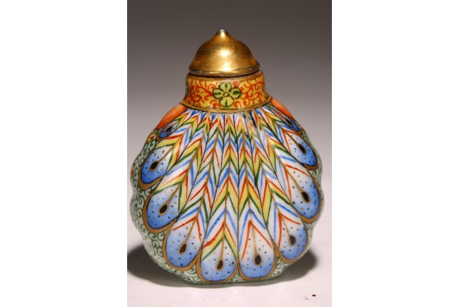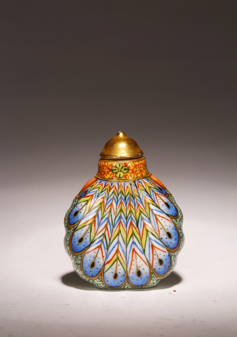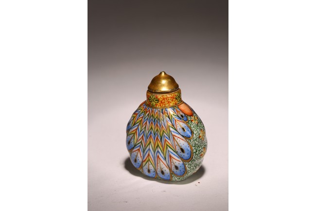 直口,帶蓋,蓋鈕描金,扁圓型,器身粉彩繪孔雀尾部紋樣,畫工精細,排列規矩,色彩豐富