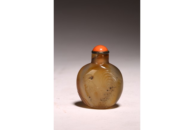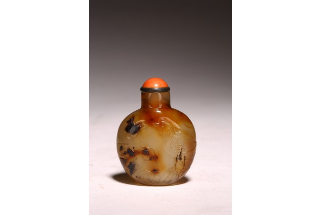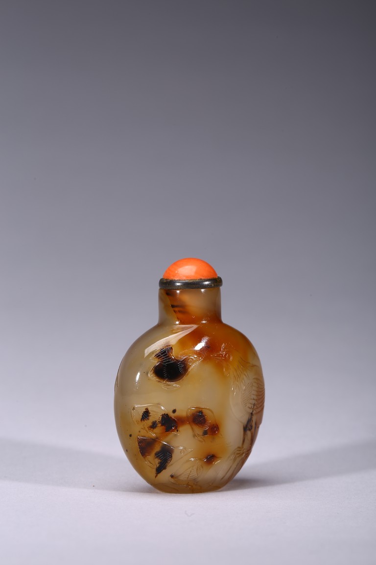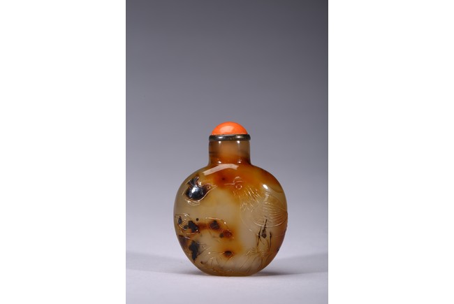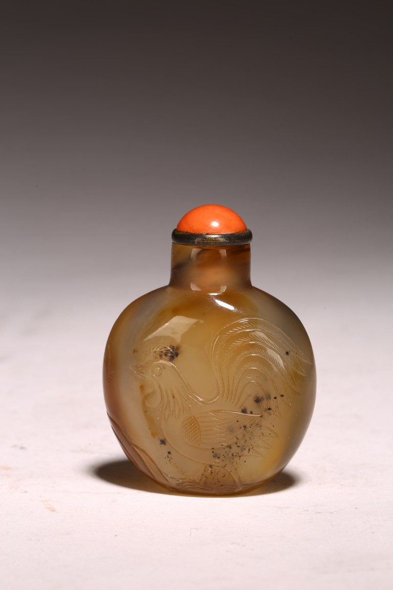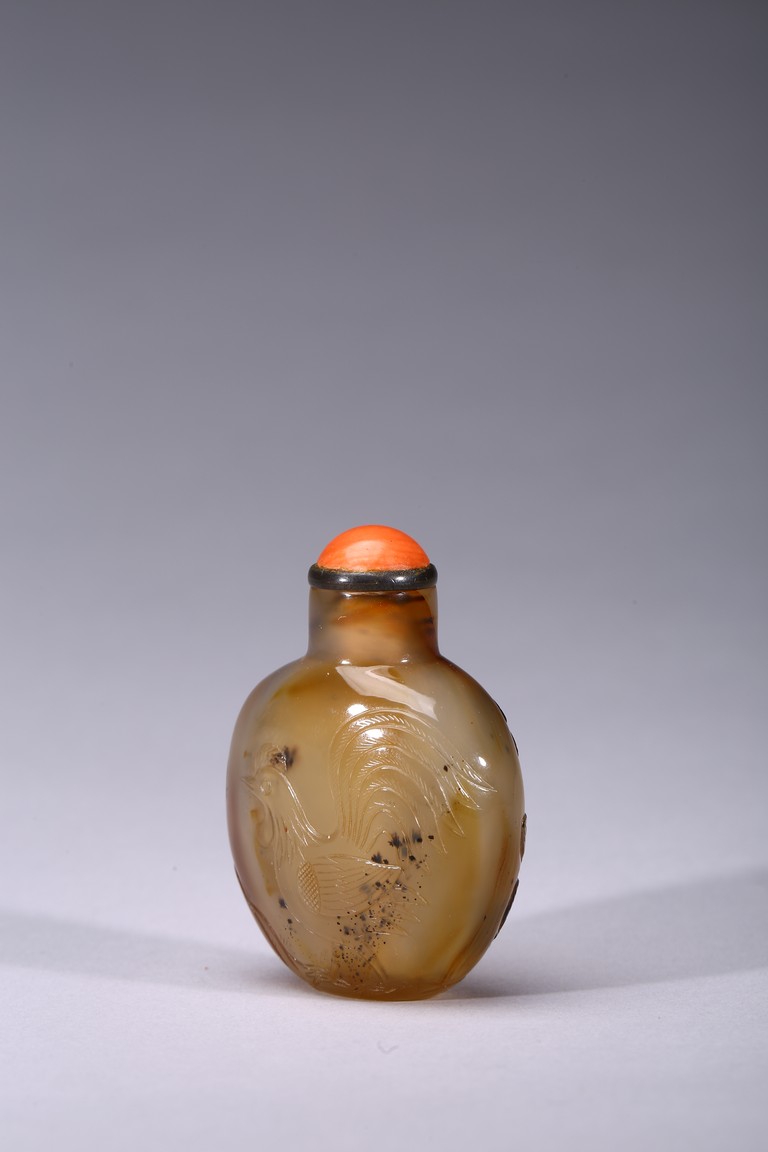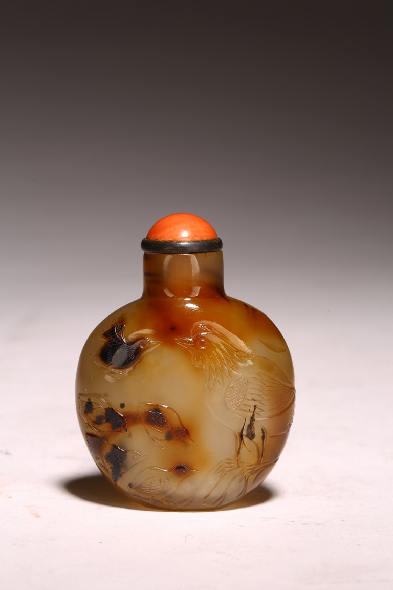 Mid-Qing Dynasty period. Of compressed spherical shape, the well-hollowed body carved on one side utilizing the dark brown markings with a hem and five chicks, the reverse carved with a rooster, accompanied with a coral stopper.