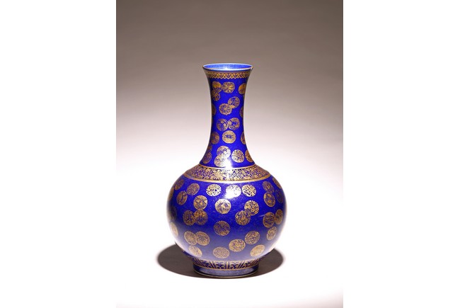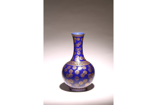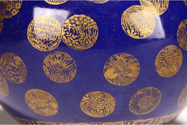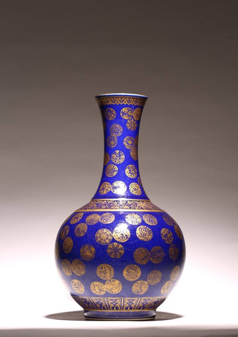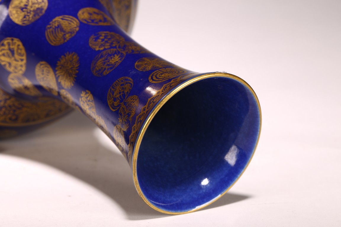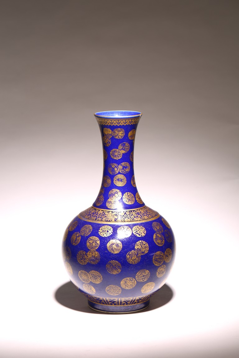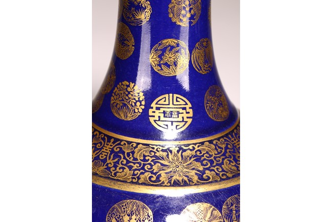 Qing Dynasty, Guangxu Period. With a globular body rising to a tall wasted neck, supported on a splayed foot, decorated in gilt on a dark blue ground with a variety of ball-medallions, depicting either birds, animals, flowers or shou symbols, the shoulder encircled by a band of lotus and longevity symbols above a raised fillet, all between upright lappets encircling the foot and pendant ruyi at the rim, the base inscribed with an underglaze-blue six-character reign mark
