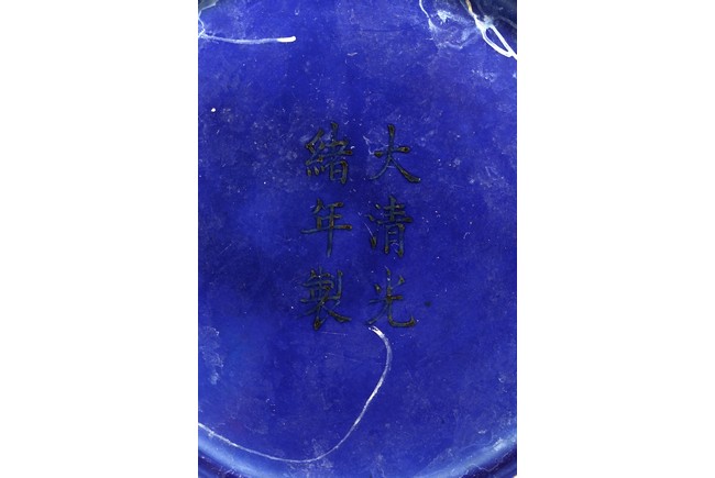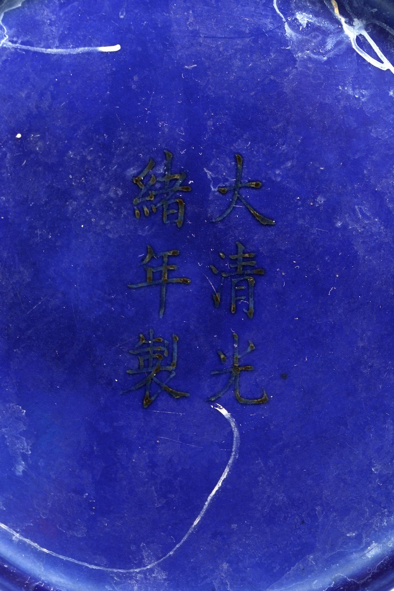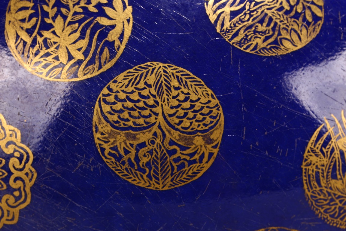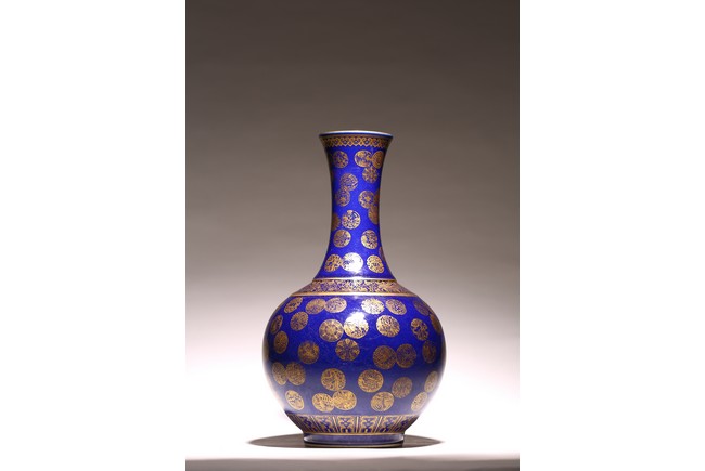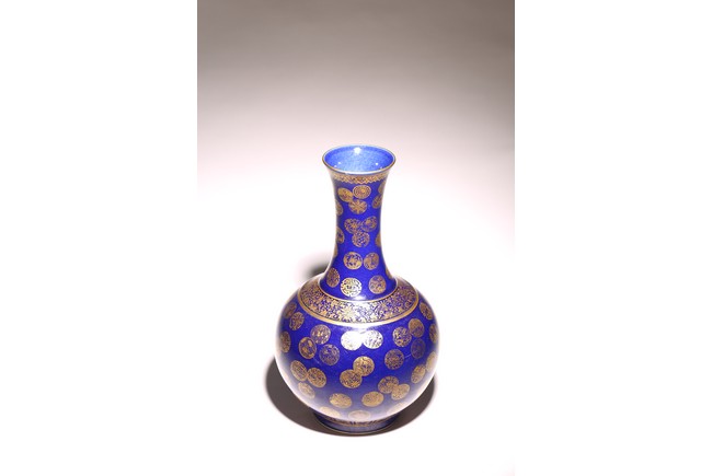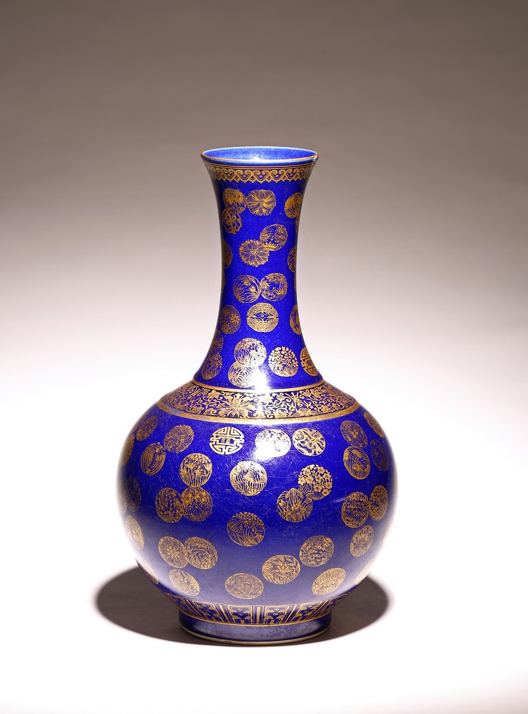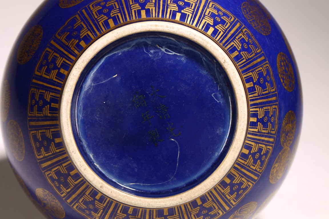 Qing Dynasty, Guangxu Period. With a globular body rising to a tall wasted neck, supported on a splayed foot, decorated in gilt on a dark blue ground with a variety of ball-medallions, depicting either birds, animals, flowers or shou symbols, the shoulder encircled by a band of lotus and longevity symbols above a raised fillet, all between upright lappets encircling the foot and pendant ruyi at the rim, the base inscribed with an underglaze-blue six-character reign mark