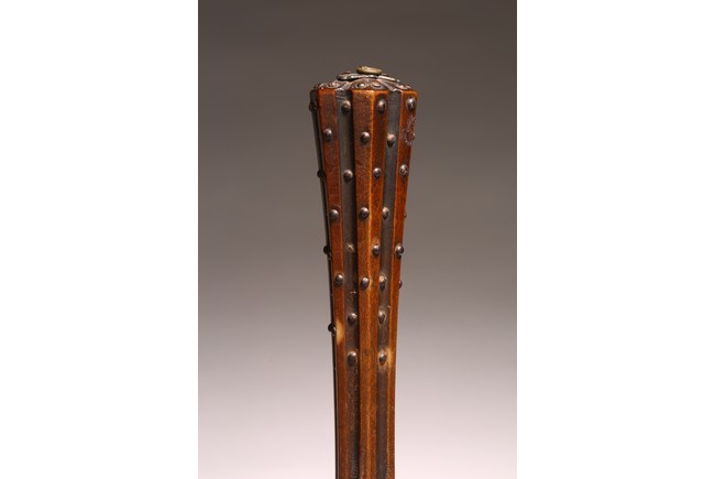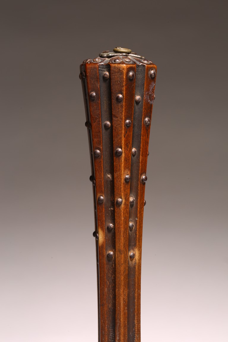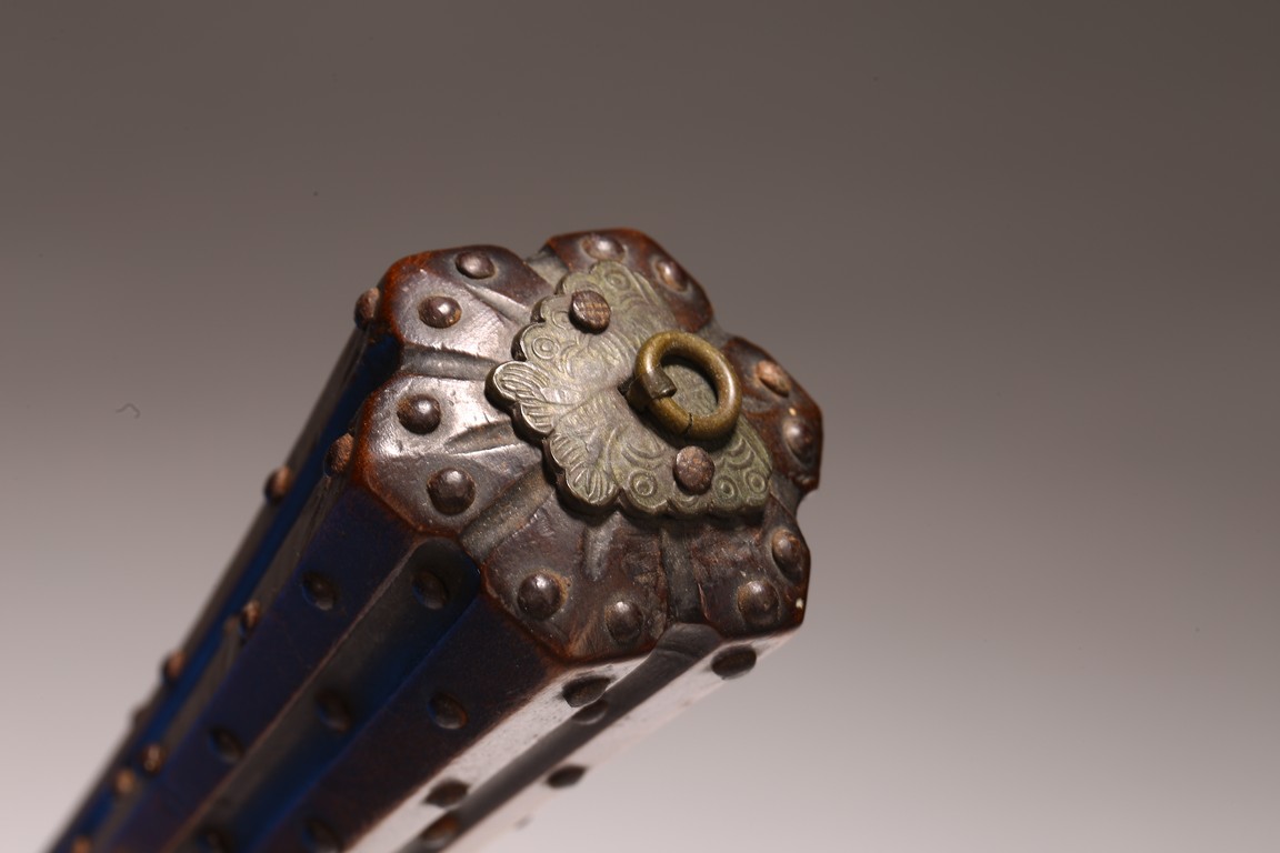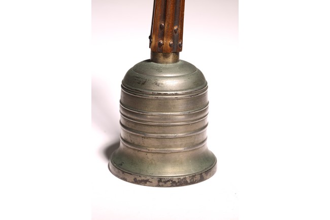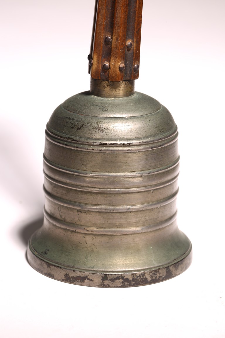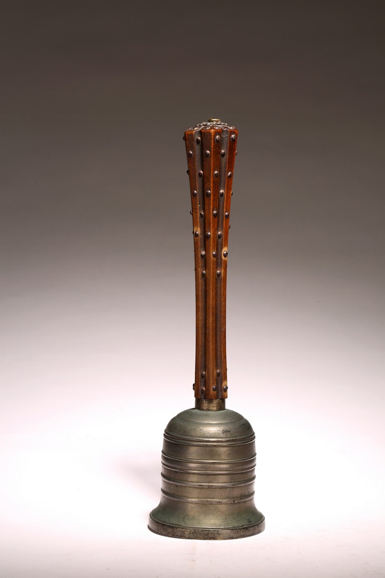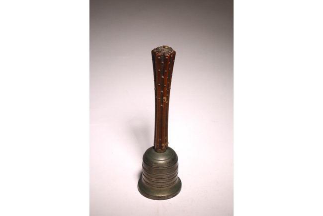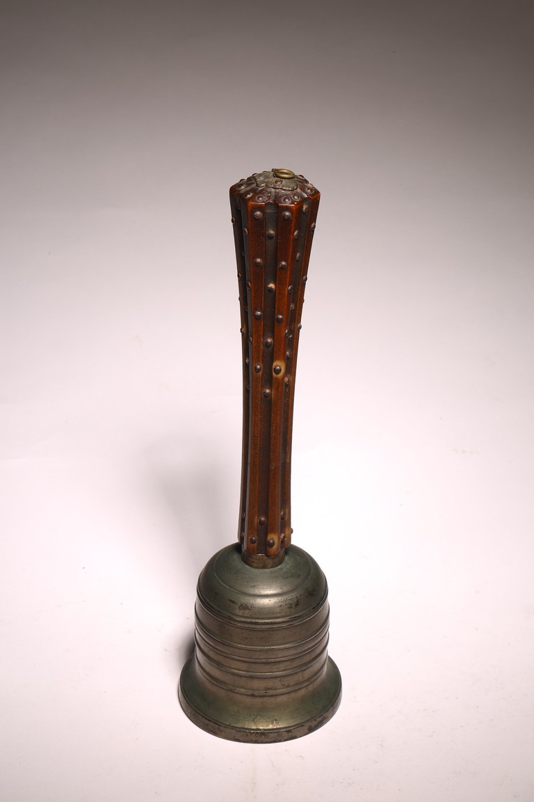 Qing Dynasty period. comprising a hardwood hexagonal handle with raised bosses, the end set with a copper butterfly clasp, the copper alloy bell encircled with raised bands.
