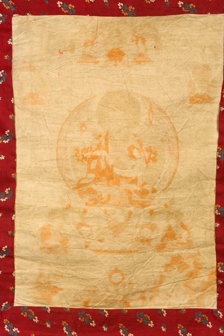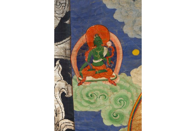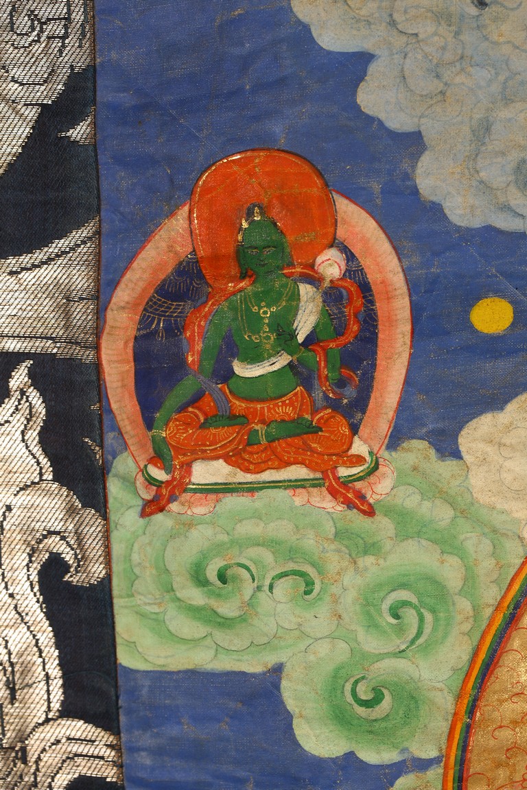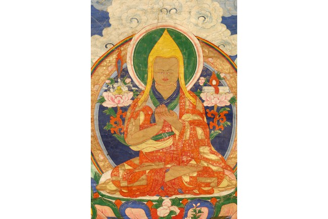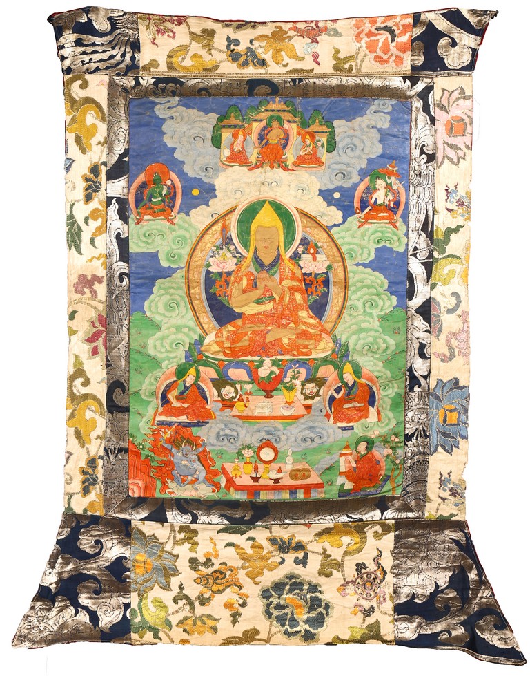 整幅唐卡繡工精湛,構圖繁複,設色絢麗,氣勢恢宏。宗喀巴:宗喀巴,本名 羅桑紮巴,藏傳佛教格魯派創立者、佛教理論家,被藏族人尊稱爲第二佛陀。他 的弟子都以他爲榜樣,將他的教義傳向四方。格魯派于是繁榮昌盛,之後發展成 爲西藏最大的教派,同時也促進了西藏其他教派的繁榮。宗喀巴被奉爲民族英雄, 被認爲是文殊菩薩的化身。 來源:南加州重要藏家收藏 Provenance: Property from a Southern California private collection