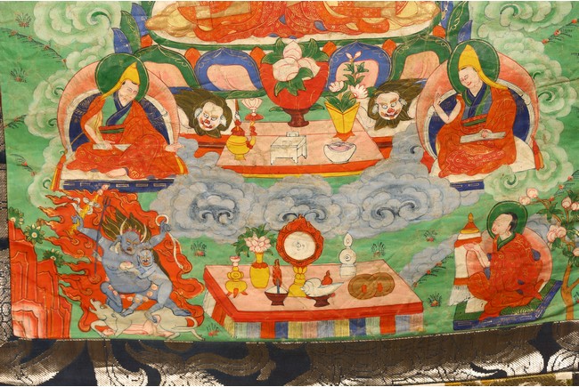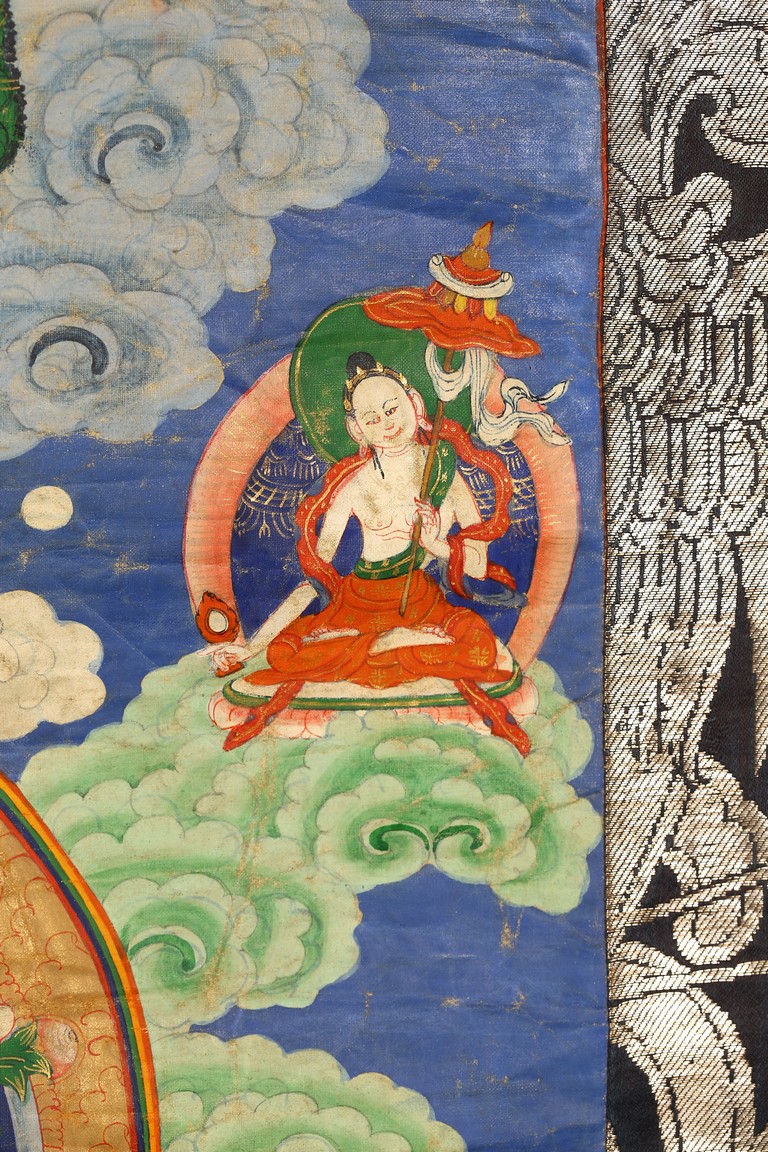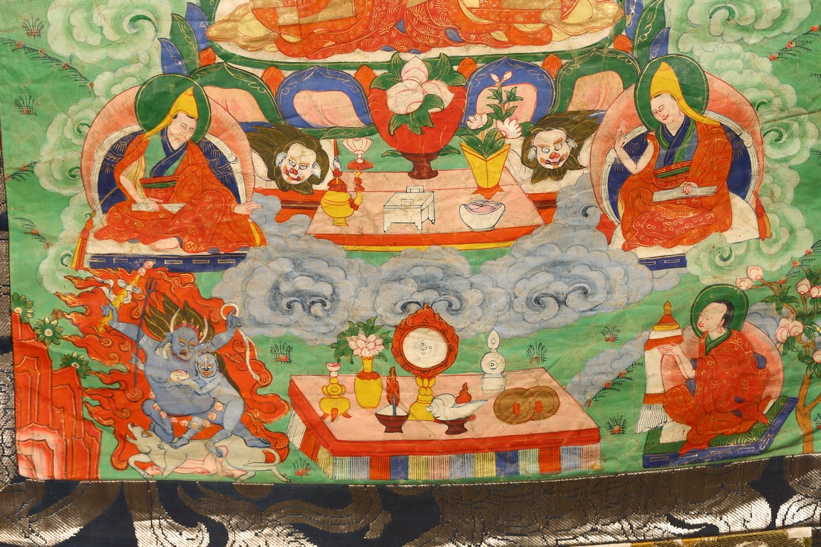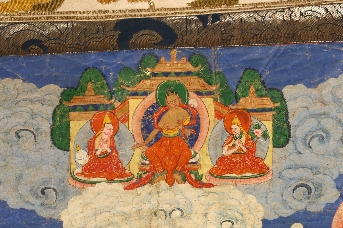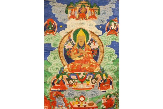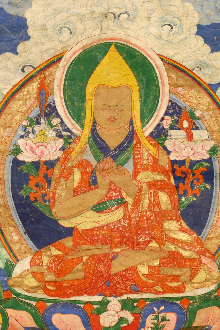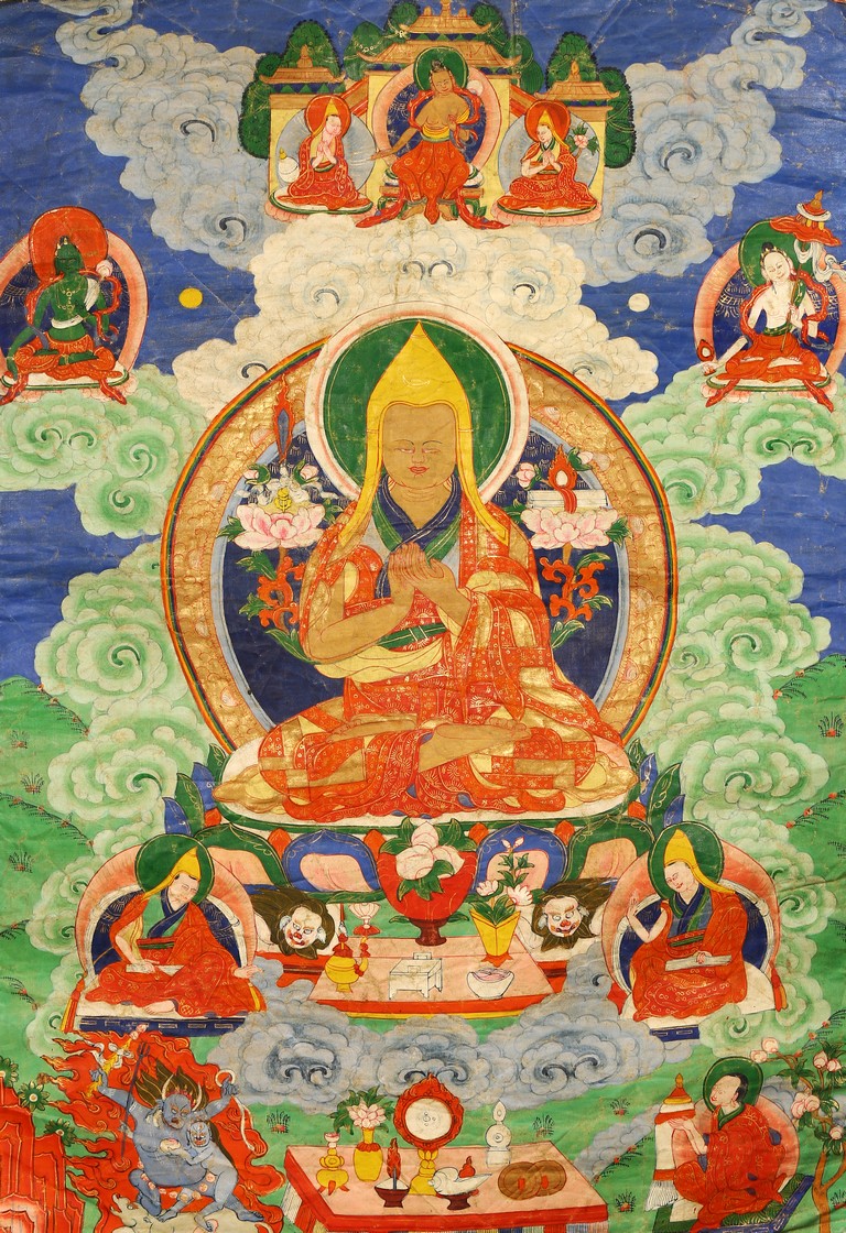 18th Century. Tibet. The Tibetan Thangka finely painted to depict Tsongkaba seated at center accompanied by his attendants.