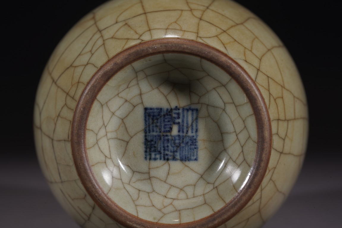 本品因形似橄榄,故而得名,口微撇,鼓腹下收,圈足外撇。器身滿施“哥釉”,釉色米 黃,有宋元哥窯之古意。金絲鐵線開片俊朗,氣韻古樸。“大清乾隆年制“款識。