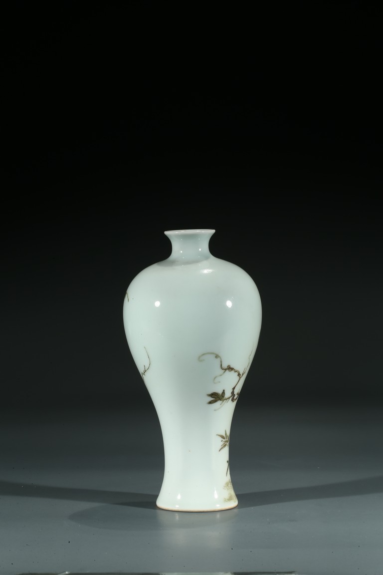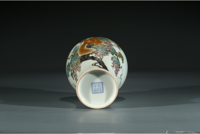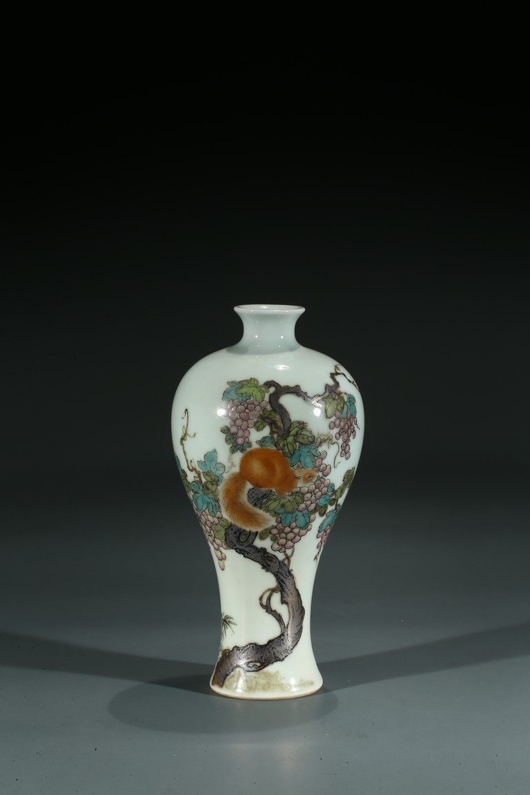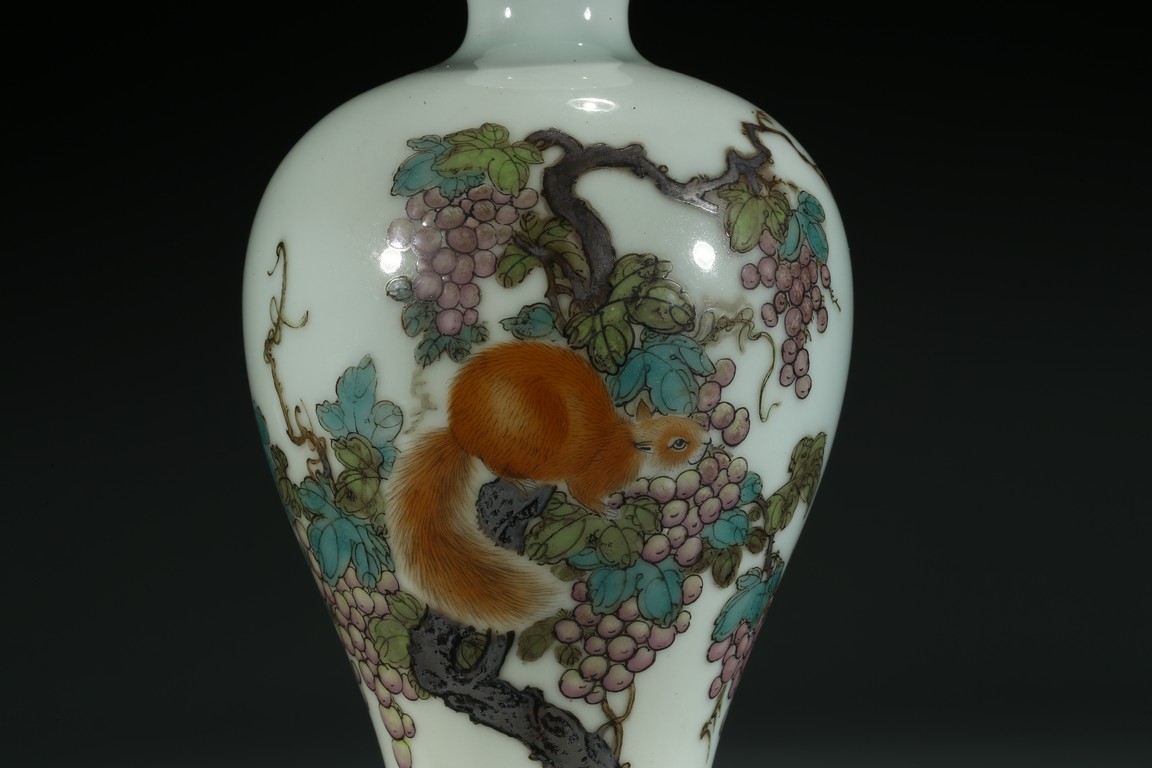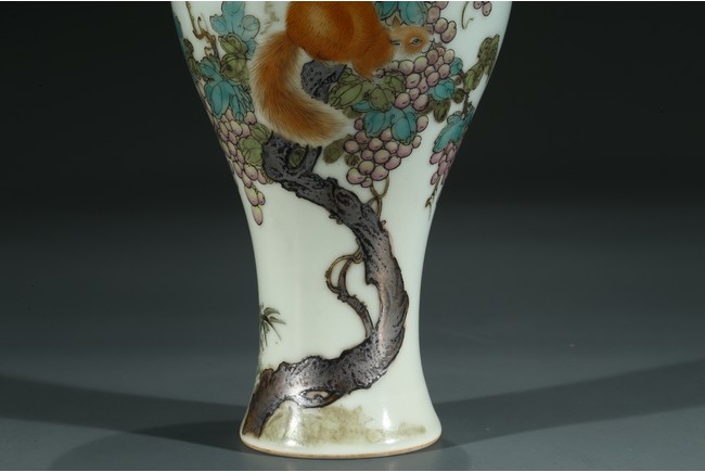 本瓶端莊典雅,挺拔飽滿,唇口,短頸,豐肩,鼓腹下收,足外撇。粉彩繪“松鼠葡萄紋”,枝葉交錯,層層疊疊,藤上碩果纍纍,粒粒如珠,晶瑩剔透,松鼠在枝幹上穿梭,似乎正要享用面前的盛宴,機靈俏皮,惹人喜愛。