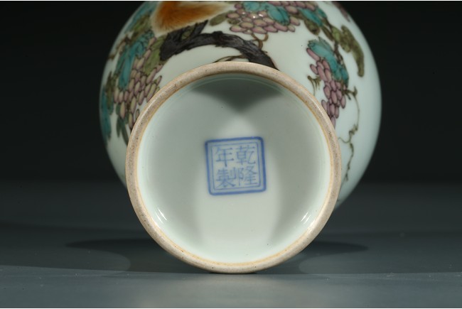 The body finely painted to depict a squirrel on grape vines, base with apocryphal Qianlong mark.