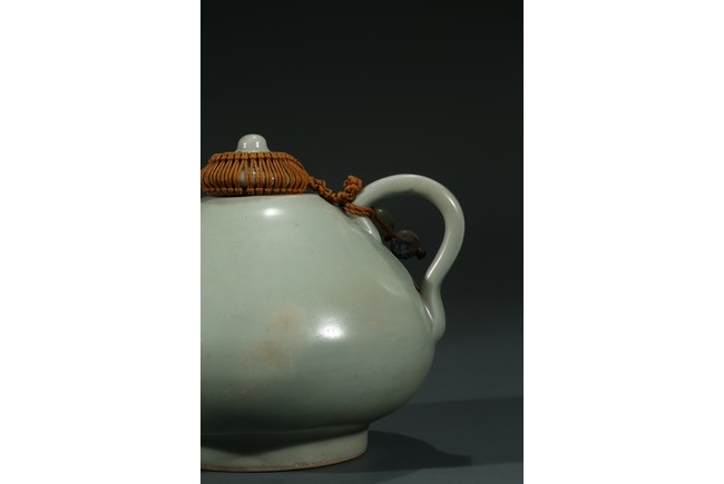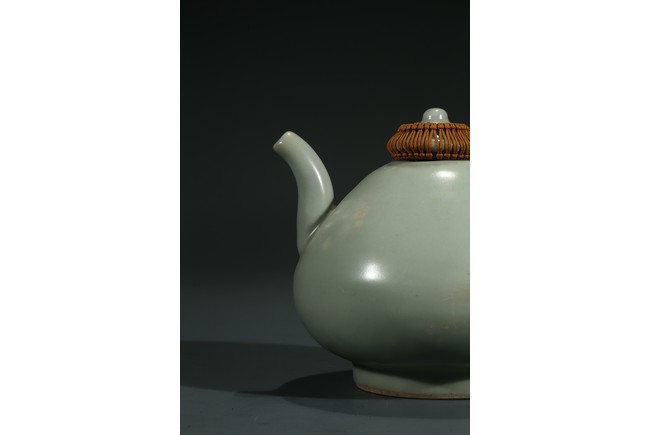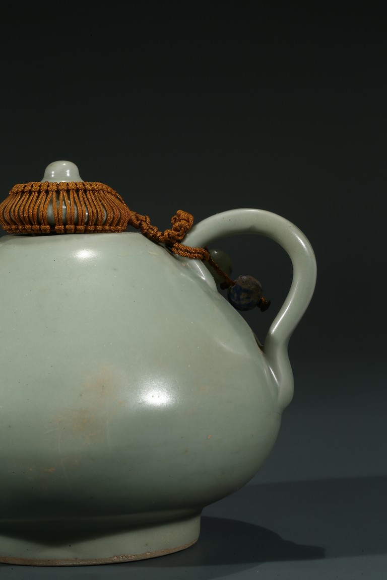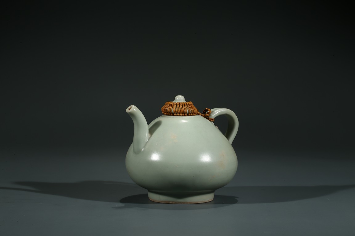 壺蓮子蓋,口下漸豐,圓腹下斂,圈足。壺一側有曲狀長流,相對一側有曲狀起棱帶形把柄,口、足邊露胎,通體施青釉,釉質光澤素雅、勻淨、溫潤,此執壺線條流暢,收放適度,造型優美。其釉面勻淨,釉色粉青,美若天然古玉。
