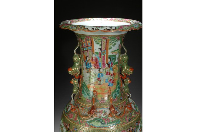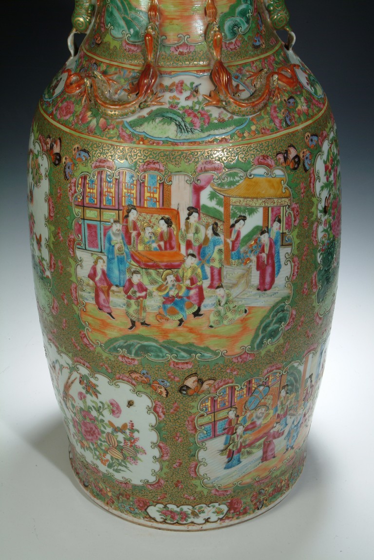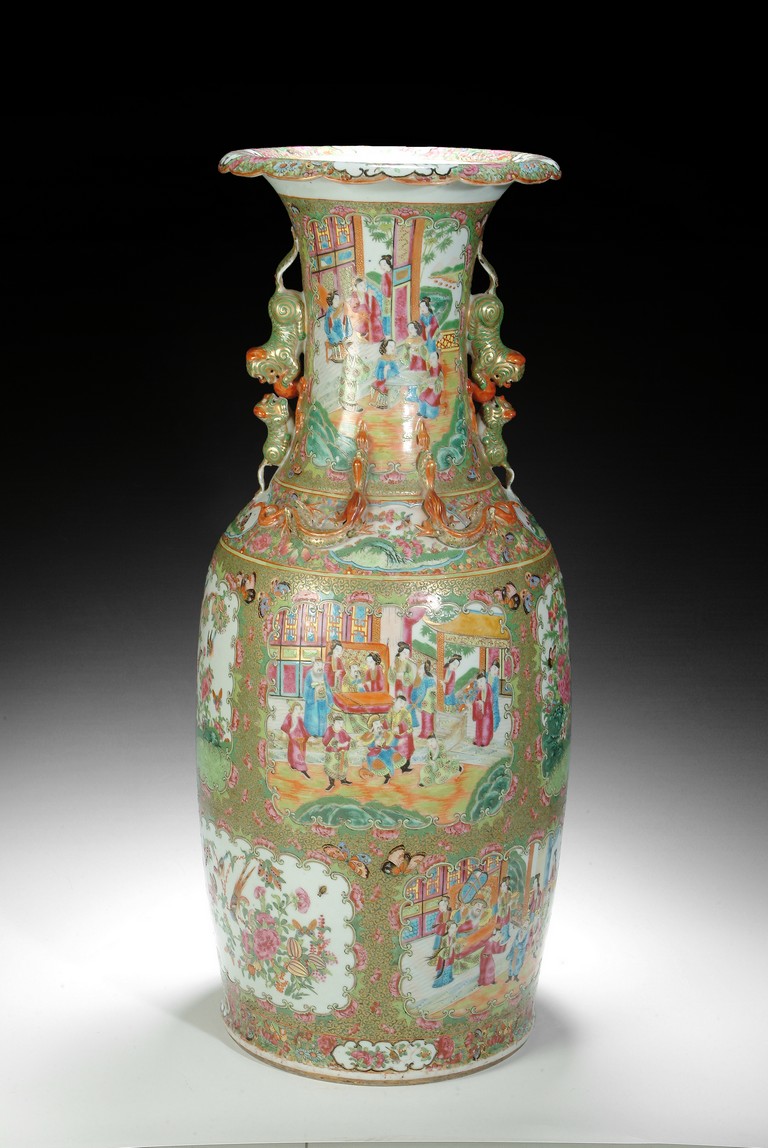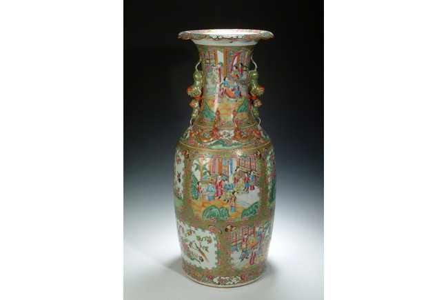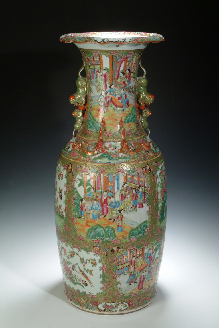 A large Cantonese style famille rose flower vase. The body fully decorated with flowers, birds, and people in the garden settings. Qing Dynasty period.