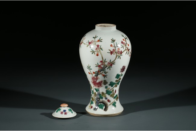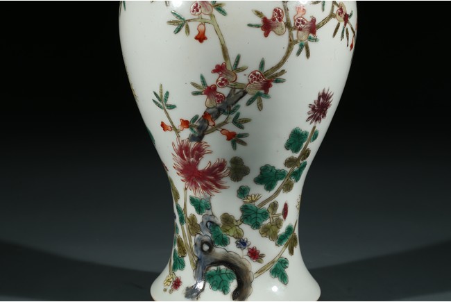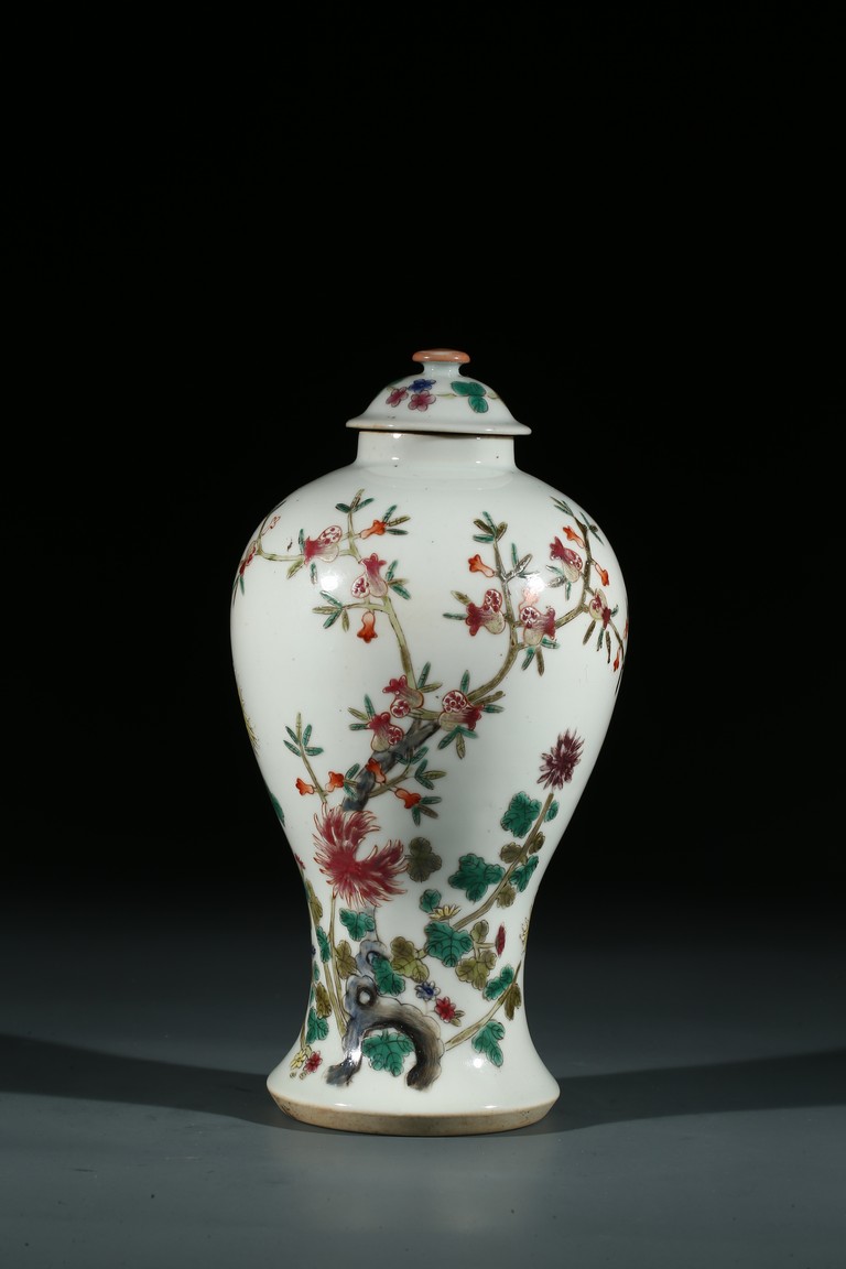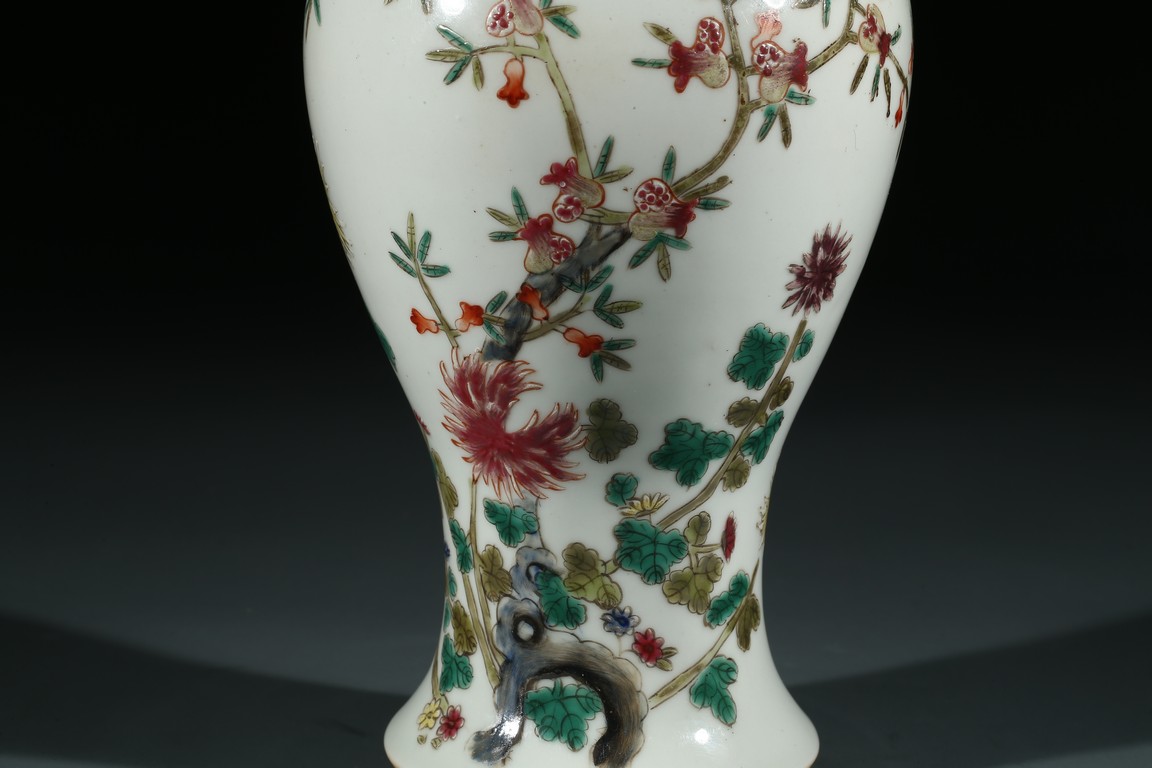 Exterior painted with pomegranate and chrysanthemum, with a pair of auspicious bats in flight on the reverse, accompanied with a cover, the base with mark.