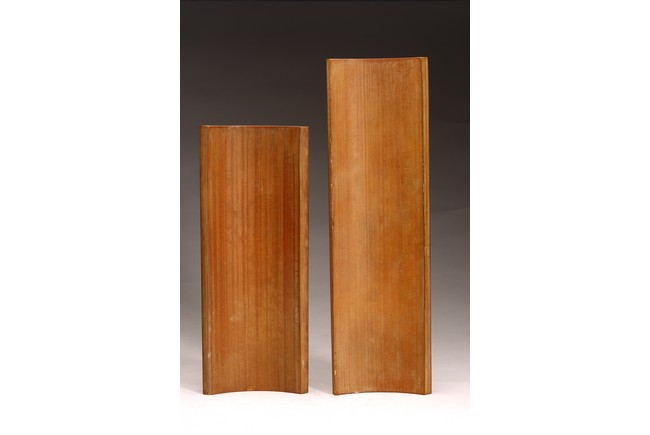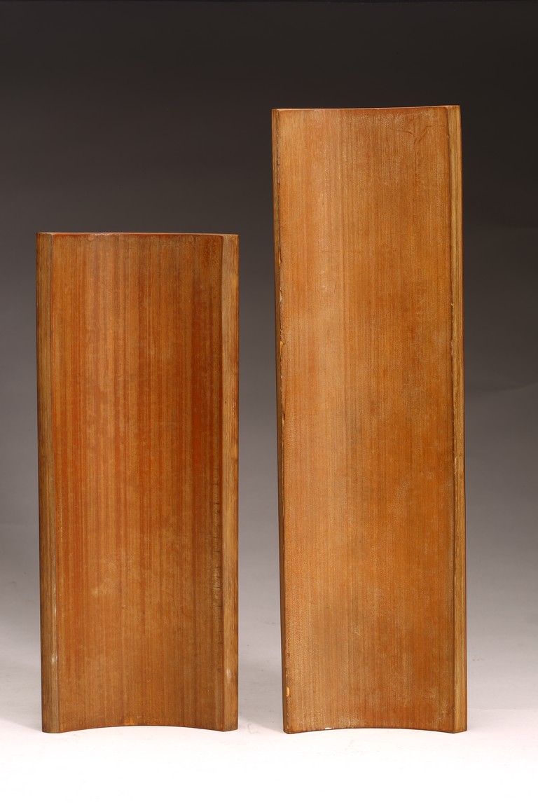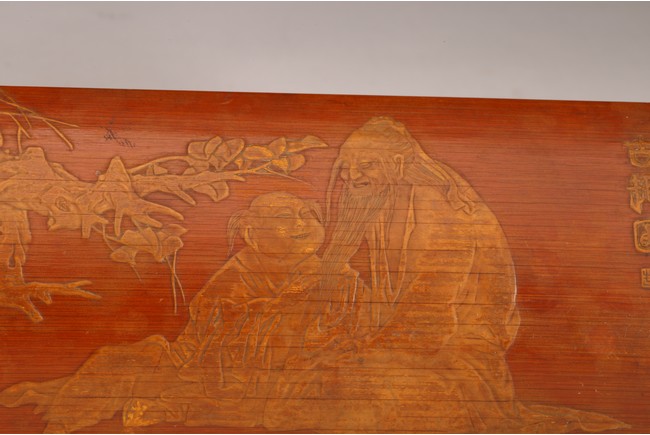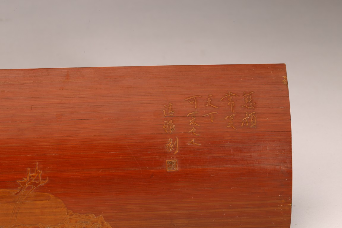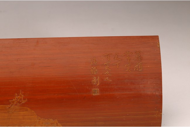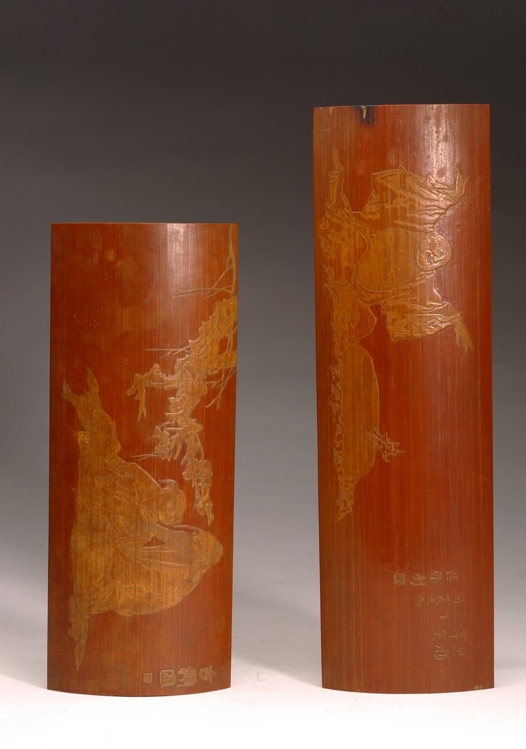 Of cylindrical-segment form, the convex side carved in delicately in precise detail in liu qing technique with buddhist and Taoist figures respectively, with inscriptions,signatures, and seal marks.