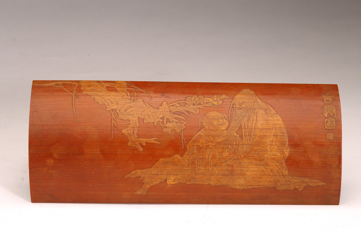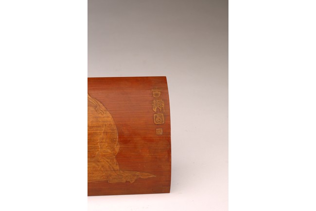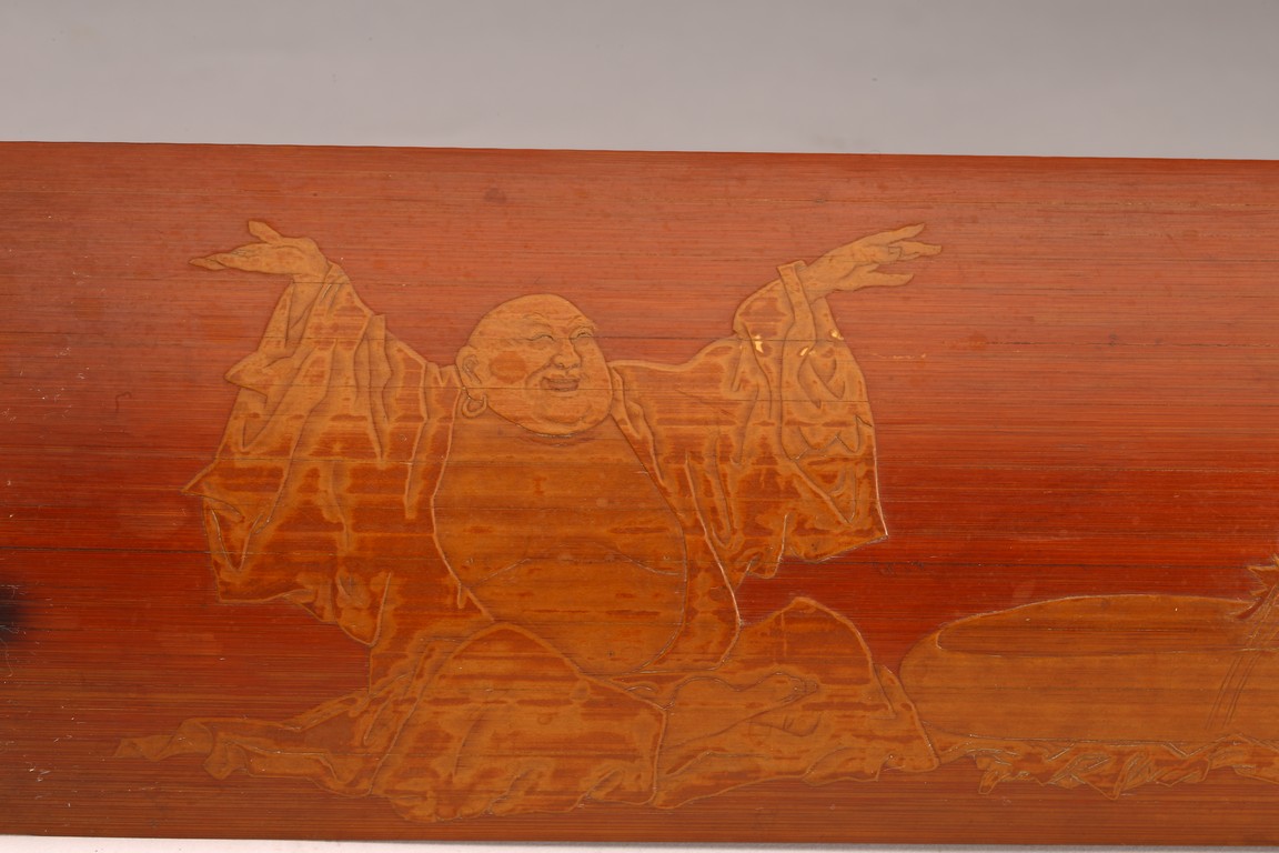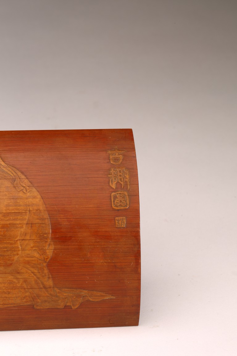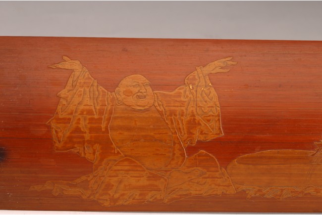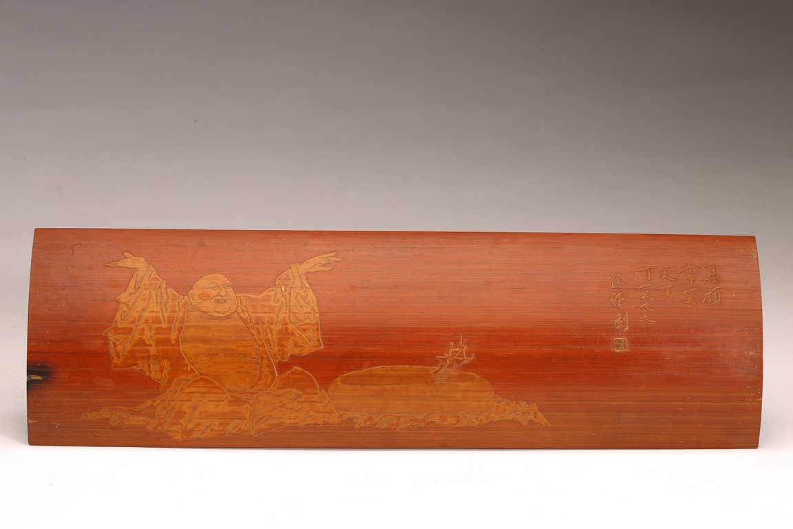 此組臂擱包漿渾厚自然,色呈紅褐,濃鬱潤澤,紋理清晰,古樸美觀。其一刻畫“古 趣圖”,參天古木,人物坐於樹下。右上刻“古趣圖”三字,字體剛勁流暢。另一雕刻 彌勒佛,寬肩露胸坦腹,慈眉善目,雙手高舉,喜笑顔開。