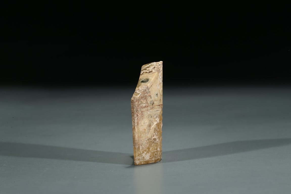 The upper triangle carved with a taotie mask, the lower rectangular portion carved with stylized 'grain' pattern.