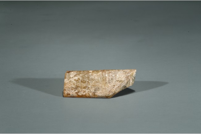 玉劍具是古代帝王、貴族用劍上的高檔裝飾物和附件,是銅劍或鐵劍鞘上的飾件,通常全套為四件,分別為劍首、劍格、劍璲、劍珌。此件器物為玉劍格,長方扁形,可納劍柄,飾“勾連雲紋”,質細膩而滿帶乳白色鈣化。整體造型端莊大氣,紋飾雕琢細膩,器型獨特難得。