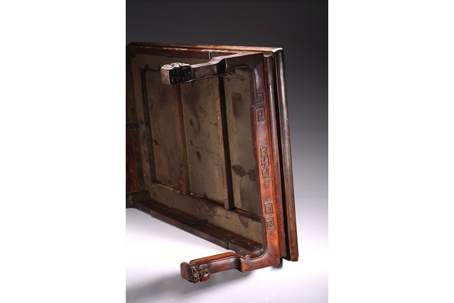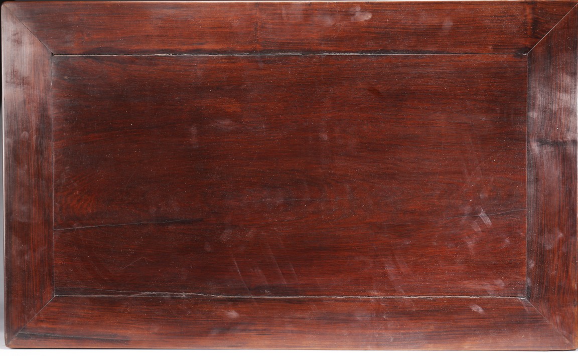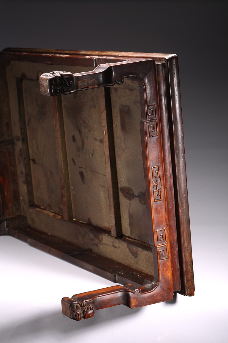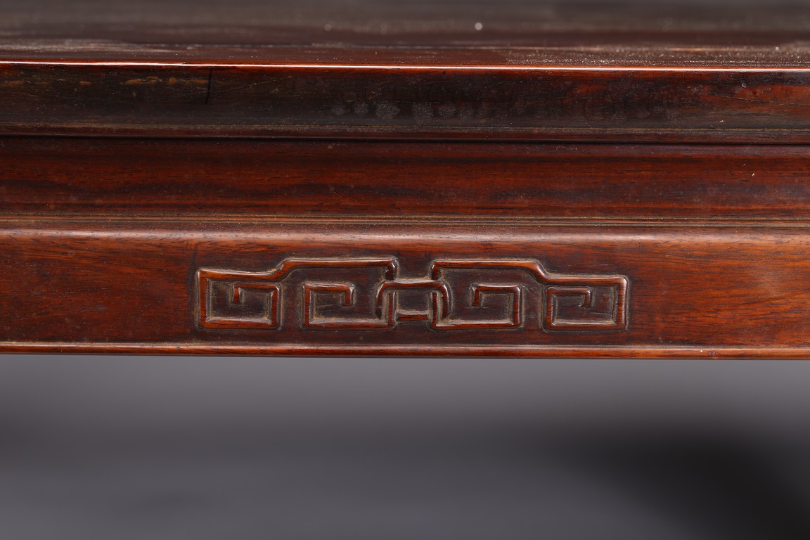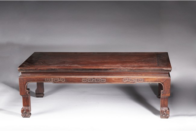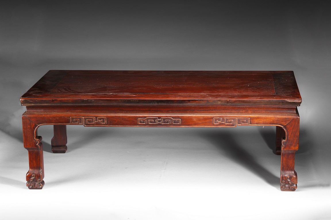 炕桌是北方地區常用的承具,多放置炕上或床榻上使用,可當書桌、飯桌等,也可當 憑幾,功能多樣,擺放靈活。此炕桌為上等紅木而製,木色深紅,紋理順暢,桌面周緣 起攔水線,鑲獨板面心,牙板雕刻“回紋”“如意紋”,四足外翻。整體造型飽滿圓潤, 線條利落圓潤,秀美俏麗。