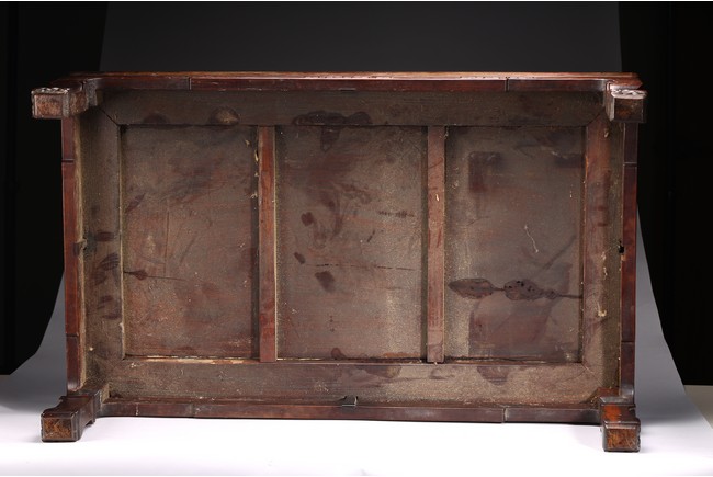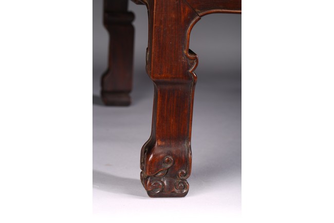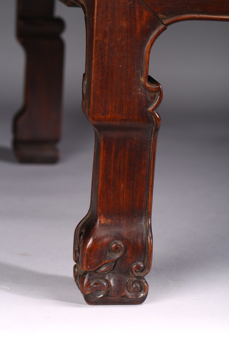 Qing Dynasty period. The rectangular top above a narrow waist and apron of arched form with angular scroll pattern in relief, continuing onto legs terminating in mythical beast heads feet