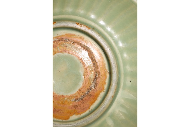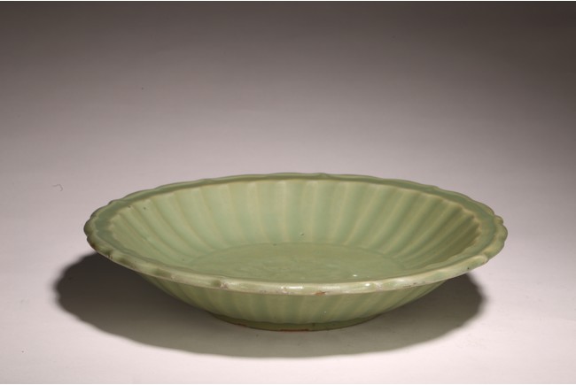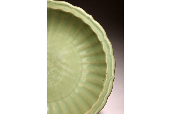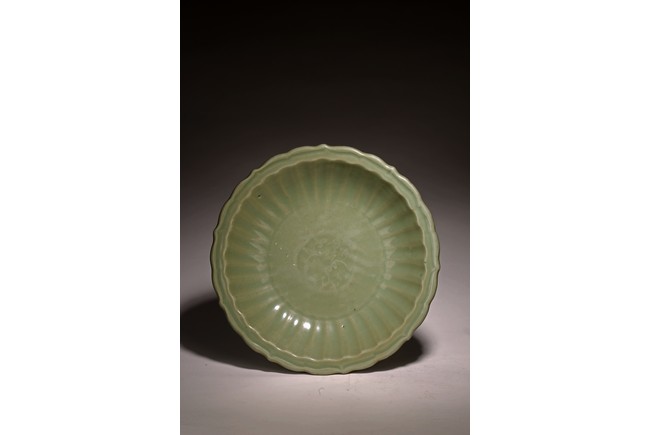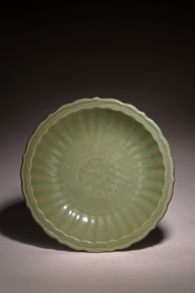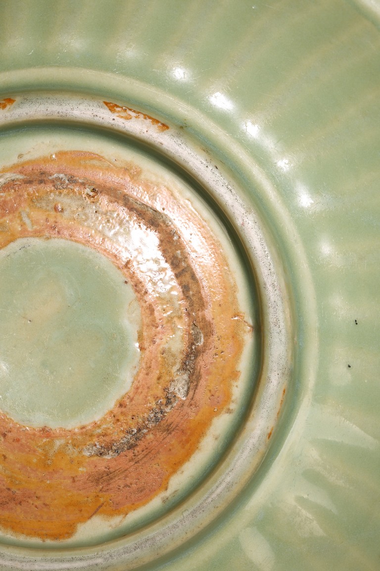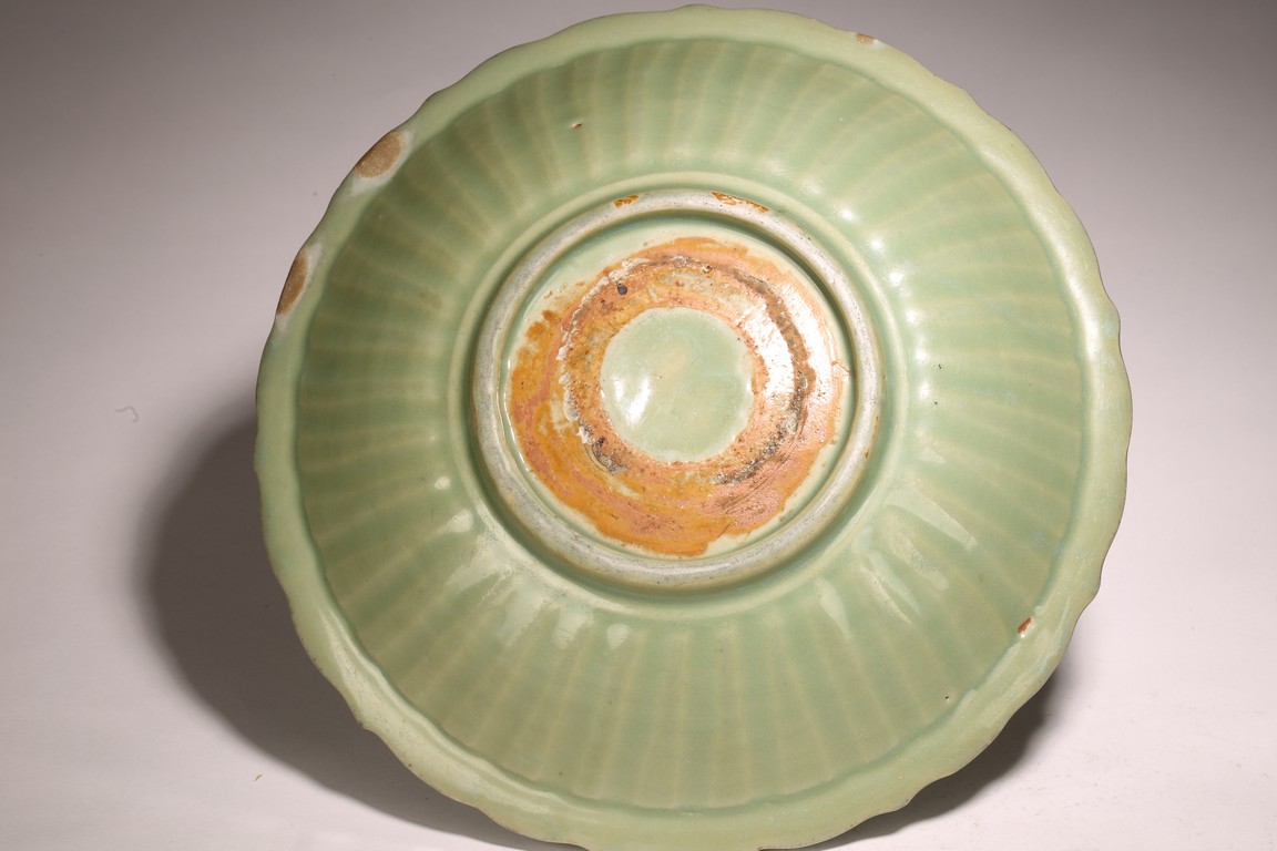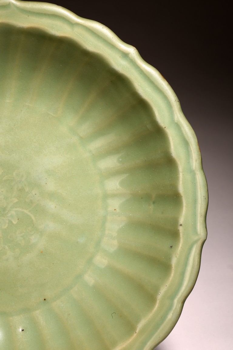 敞口,淺腹,葵型口,沿面再刻畫雙線紋隨形勾邊,通體施青釉,釉質厚重堅致,色澤細膩溫潤,淡雅勻凈,質感極佳,底部有環形無釉墊燒澀圈,呈朱紅色。 來源:洛杉磯重要私人收藏 Provenance: Important Private collection, Los Angeles