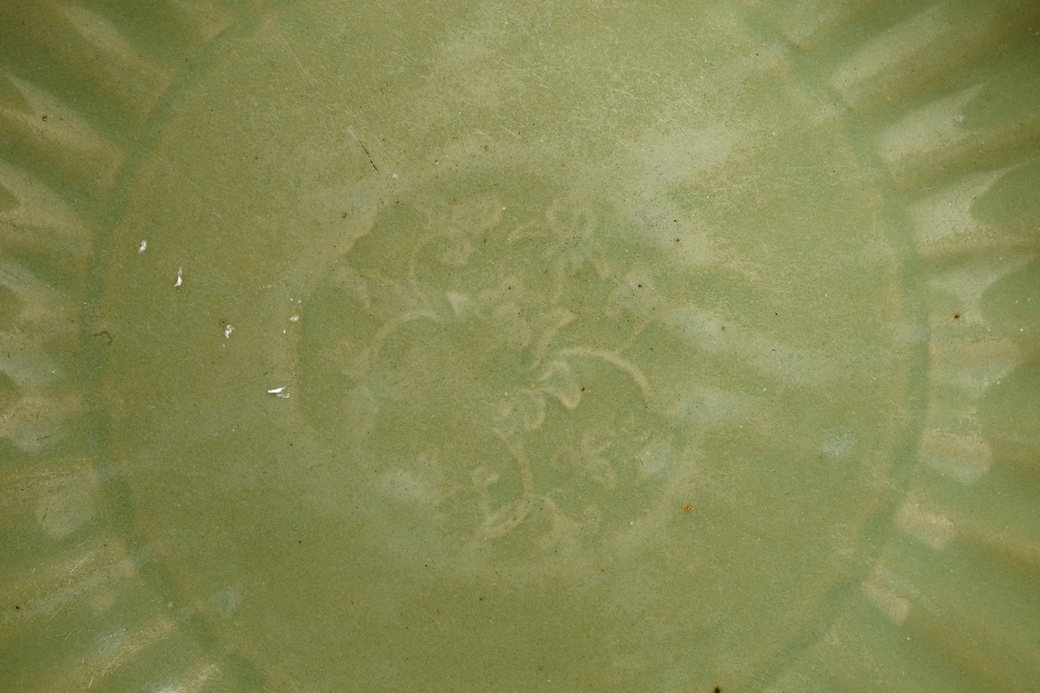 Ming Dynasty period. Sturdily potted with rounded lobed sides, rising from a tapered foot to a barbed everted rim, the interior centered with floral spray, covered overall in a lustrous olive-green glaze, save for the wide ring on the base fired burnt-orange.