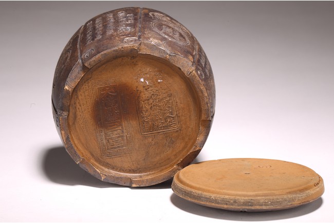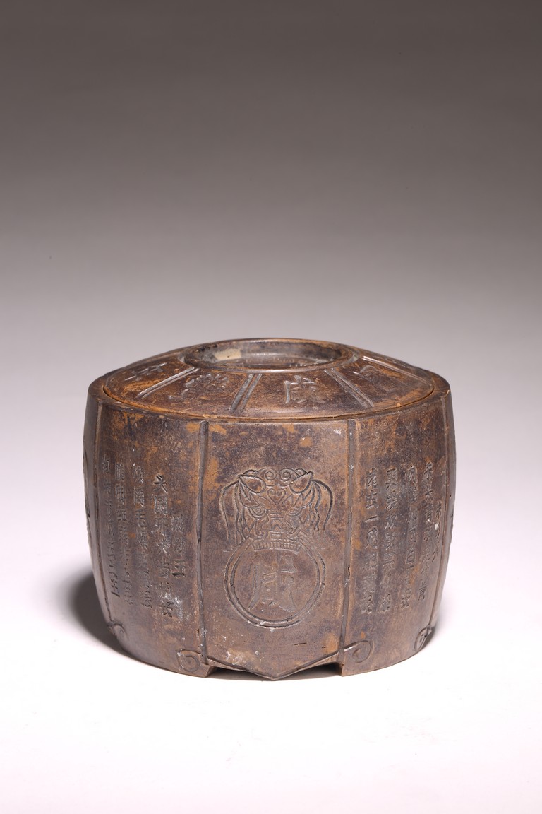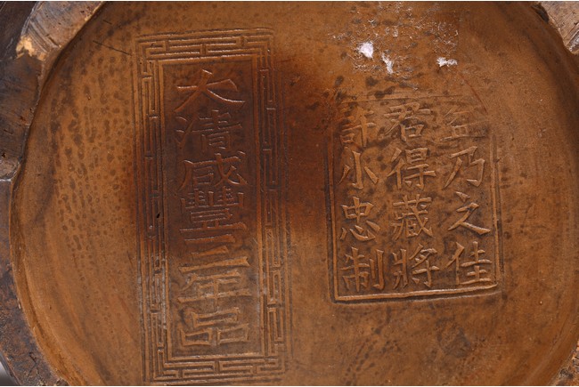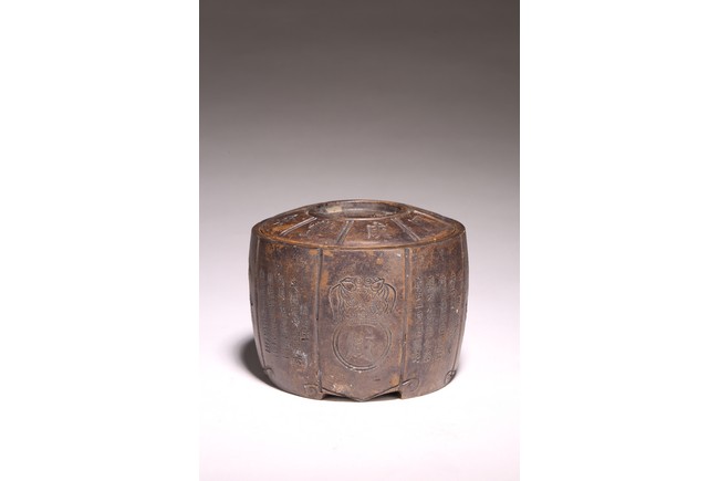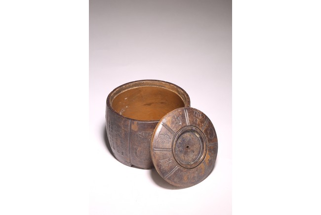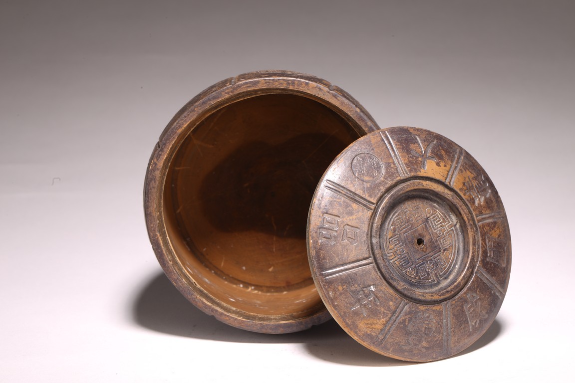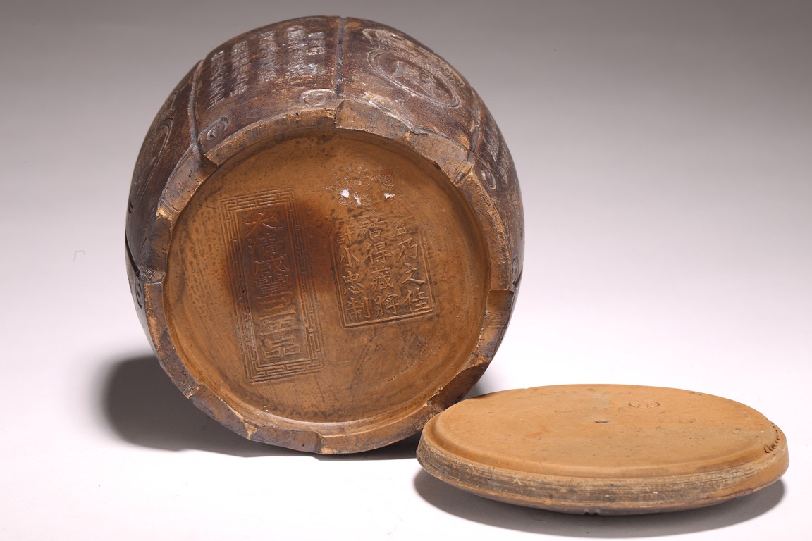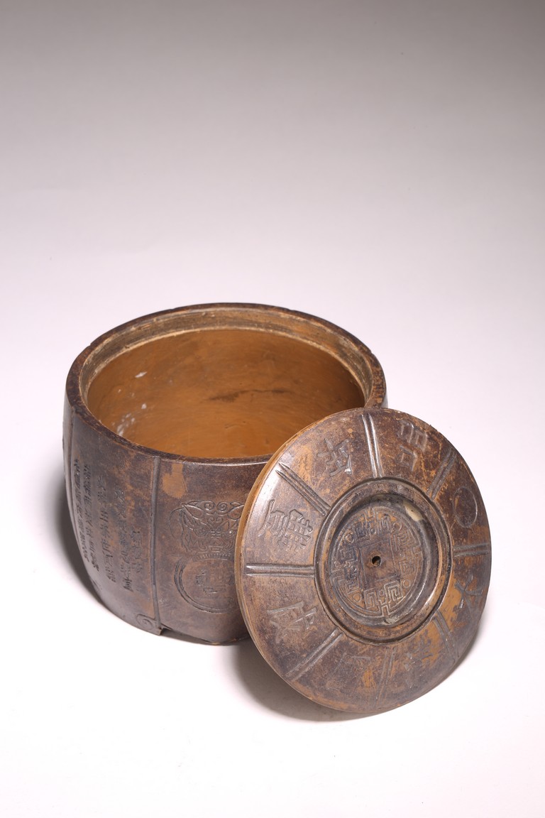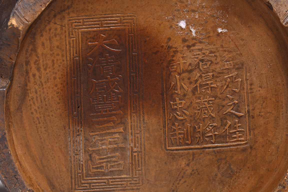 Qing Dynasty Xianfeng period. Of circular form, the cover carved with characters, the body carved with inscriptions, base further impressed with marks and inscriptions dated to Xianfeng period.