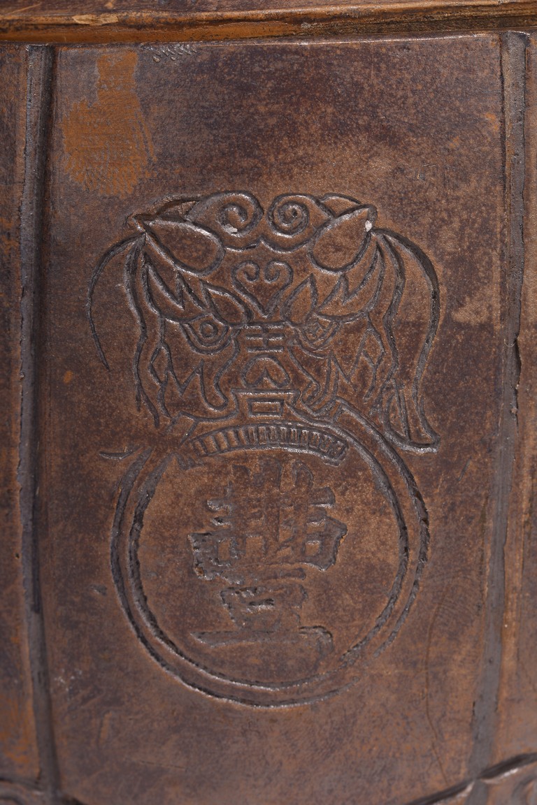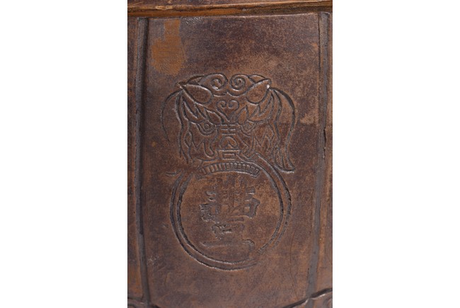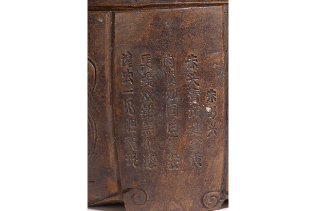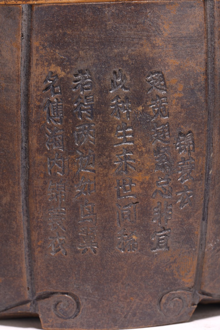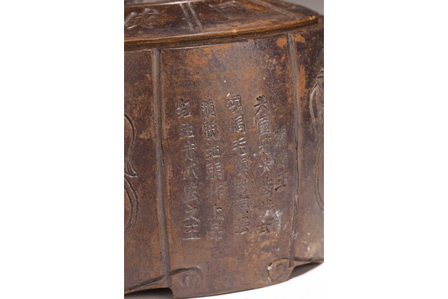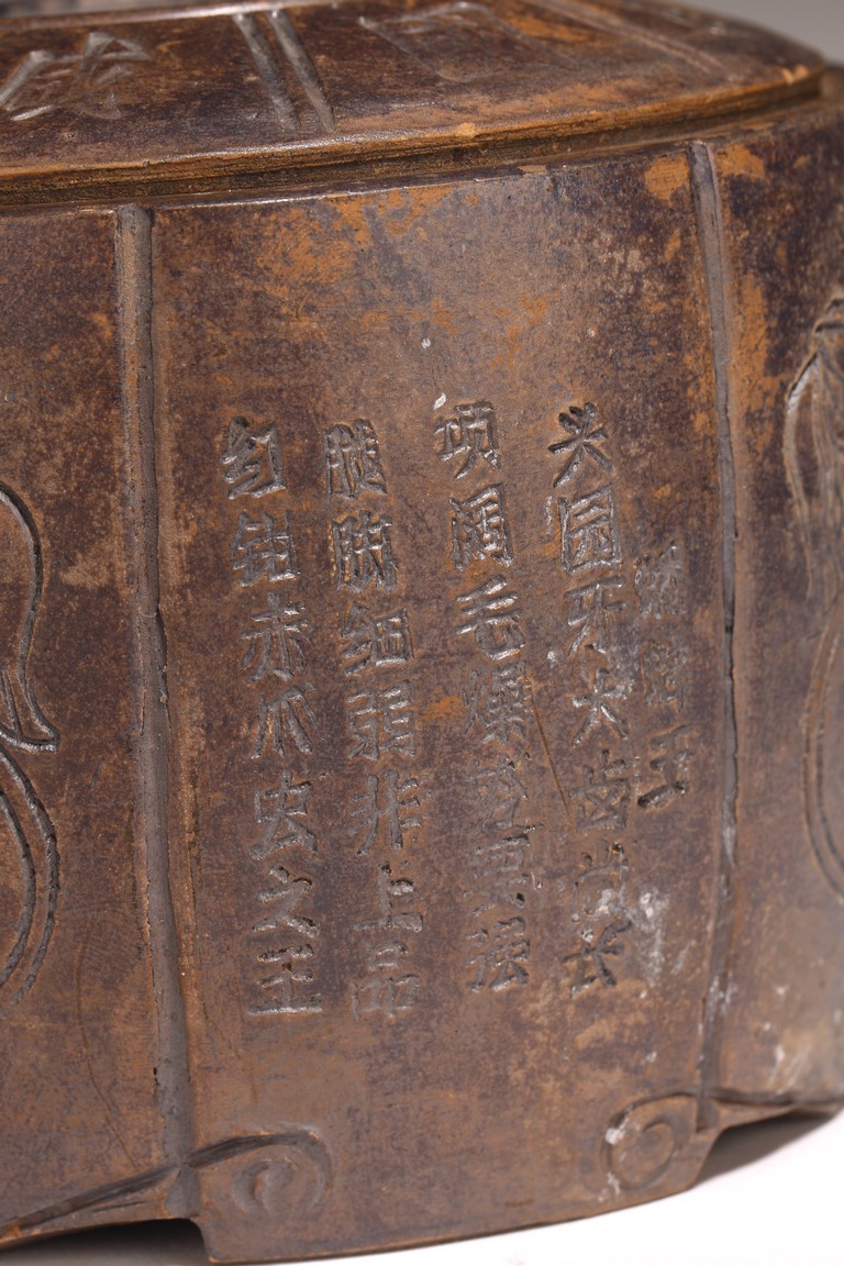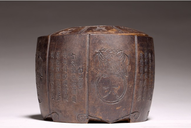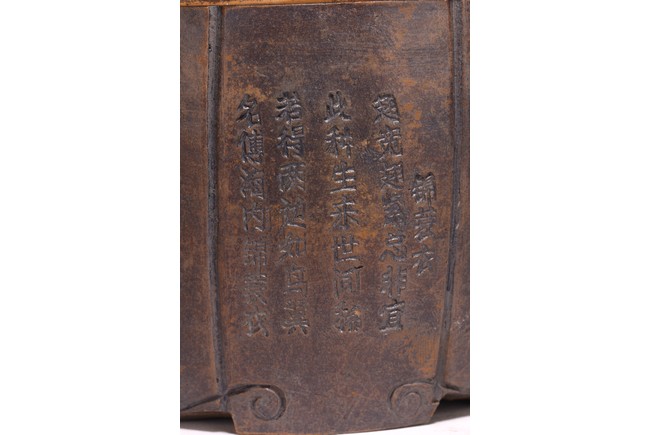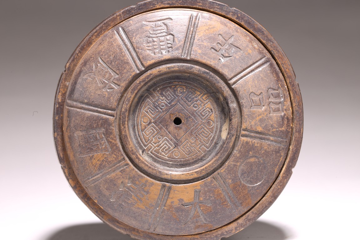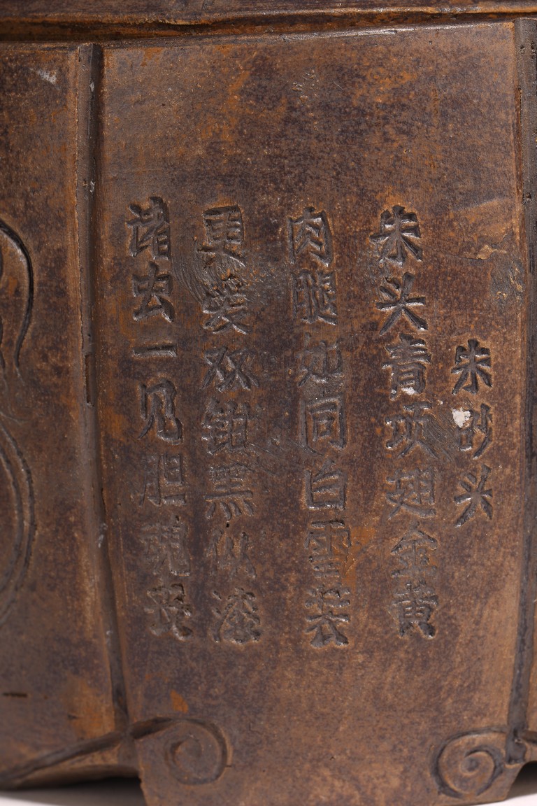 Qing Dynasty Xianfeng period. Of circular form, the cover carved with characters, the body carved with inscriptions, base further impressed with marks and inscriptions dated to Xianfeng period.